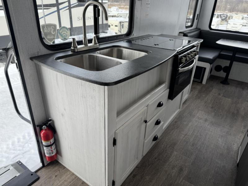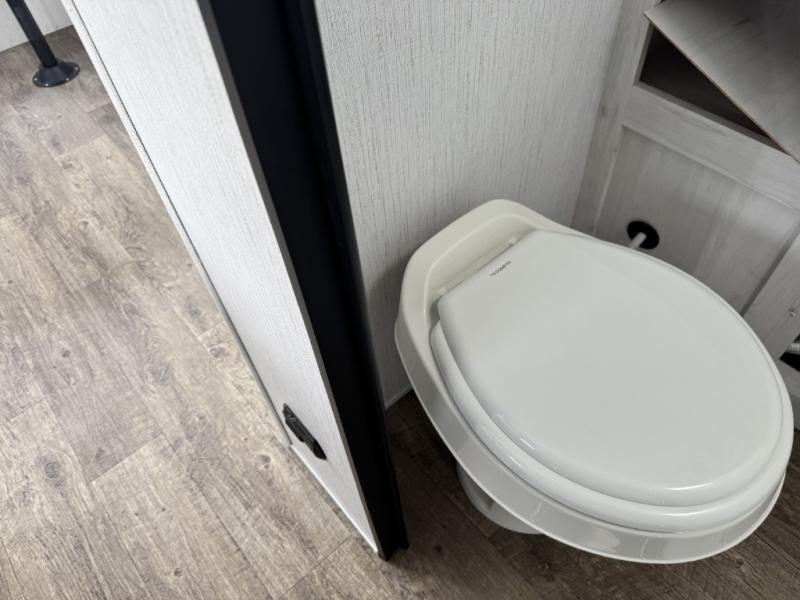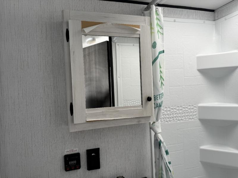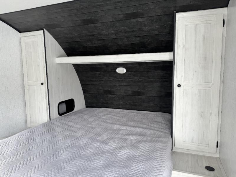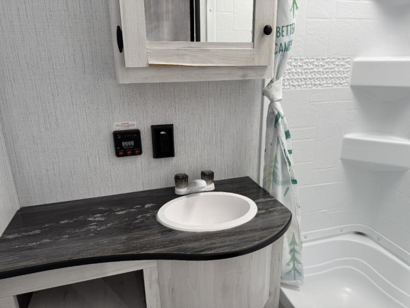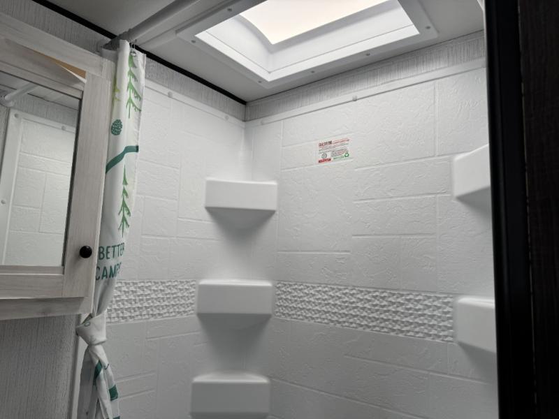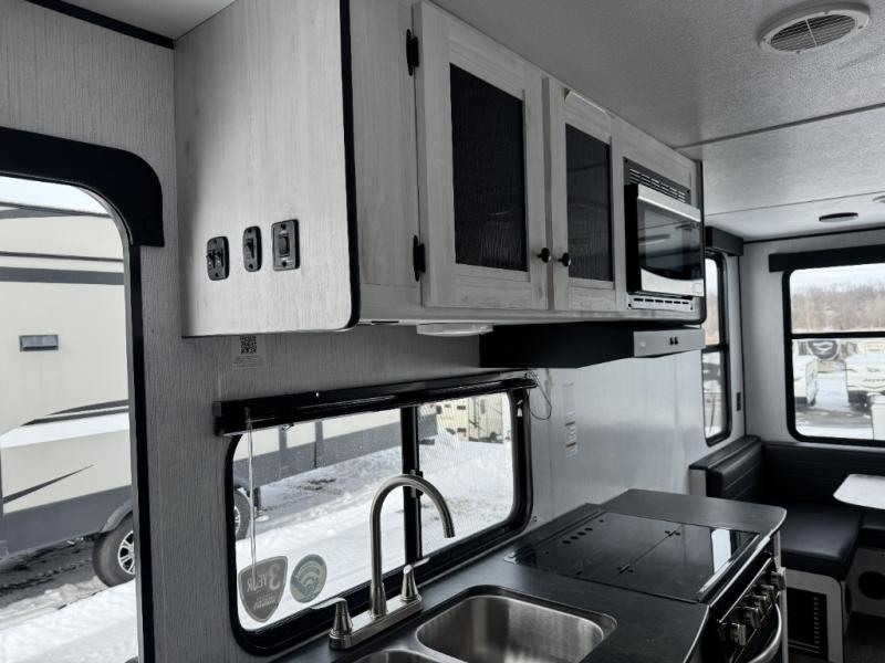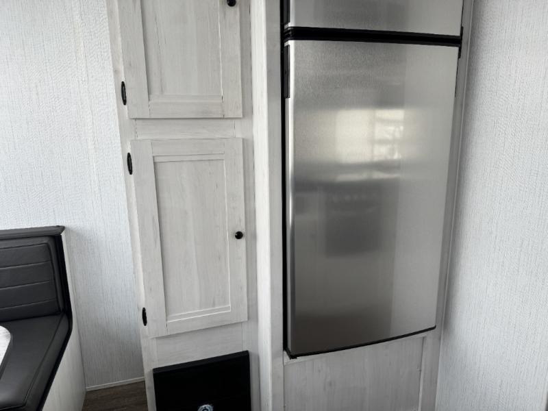 Head to your favorite campground with your favorite person in this travel trailer! The front queen bed has under-bed storage for more blankets and since there are wireless cell charging stations you don't have to worry about bringing your chargers. Freshen up each morning in the full bathroom with the ABS tub/shower surround with a skylight above to bring the outdoors inside. Keep your bellies full with a three burner cooktop and 10 cu. ft. stainless steel refrigerator, and the rear U-shaped dinette offers a comfortable place to eat meals, play games, and even transform into an extra sleeping space for a guest or two to tag along!