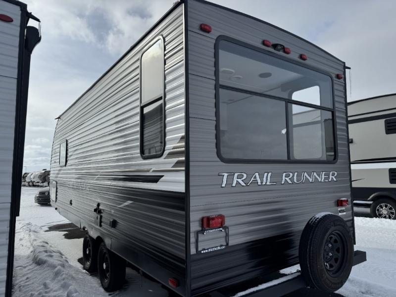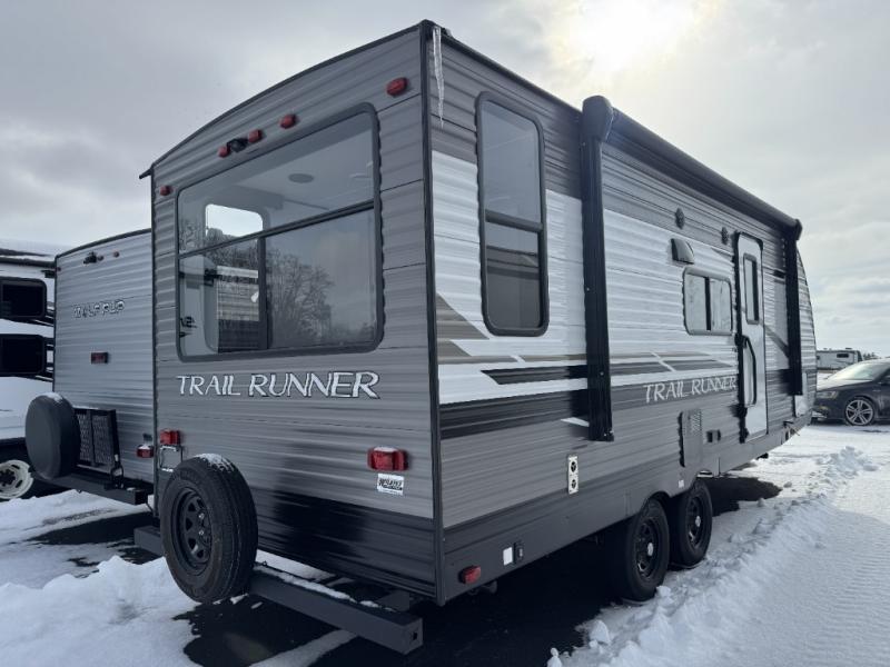 Paradise awaits at the end of the trail with one of these Heartland Trail Runner travel trailers! Experience better wind and water deflection, added strength, and a reduction of tongue weight with the hybrid aluminum front profile that has an aerodynamic radius front cage. A cambered structural steel I-beam frame holds them together and a heated enclosed underbelly protects the units vitals. There is an industry leading mammoth storage space of 57 cu. ft. pass-through storage so you can bring all of your outdoor gear with you. Roller shades in the main living area, woven flooring in all slide rooms, master suites with CPAP storage, and upgraded pressed counters give you the at-home feel you desire. Come find the perfect model for you today!
