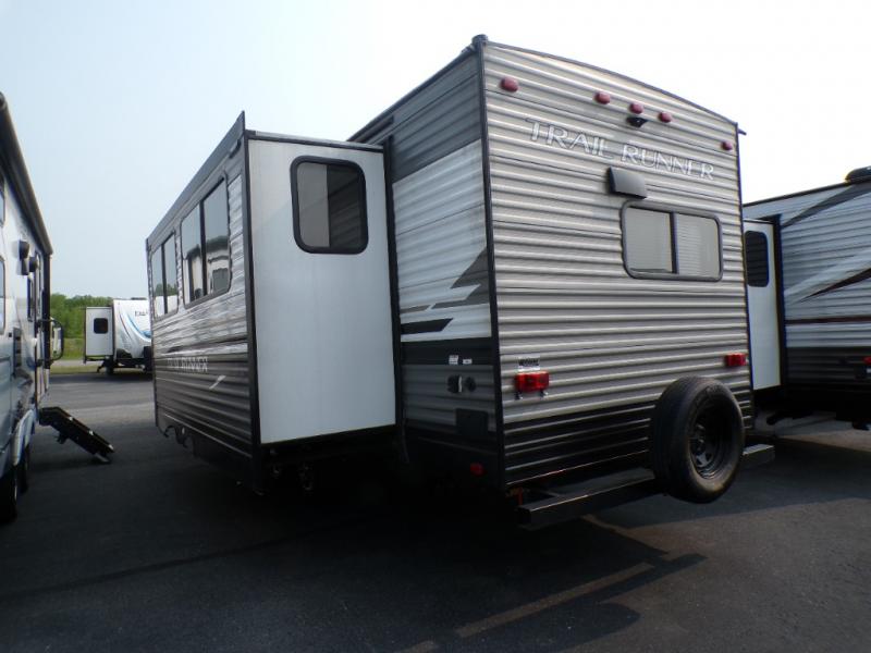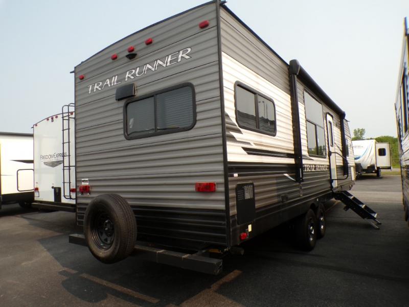 Paradise awaits at the end of the trail with one of these Heartland Trail Runner travel trailers! Experience better wind and water deflection, added strength, and a reduction of tongue weight with the hybrid aluminum front profile that has an aerodynamic radius front cage. A cambered structural steel I-beam frame holds them together and a heated enclosed underbelly protects the units vitals. There is an industry leading mammoth storage space of 57 cu. ft. pass-through storage so you can bring all of your outdoor gear with you. Roller shades in the main living area, woven flooring in all slide rooms, master suites with CPAP storage, and upgraded pressed counters give you the at-home feel you desire. Come find the perfect model for you today!