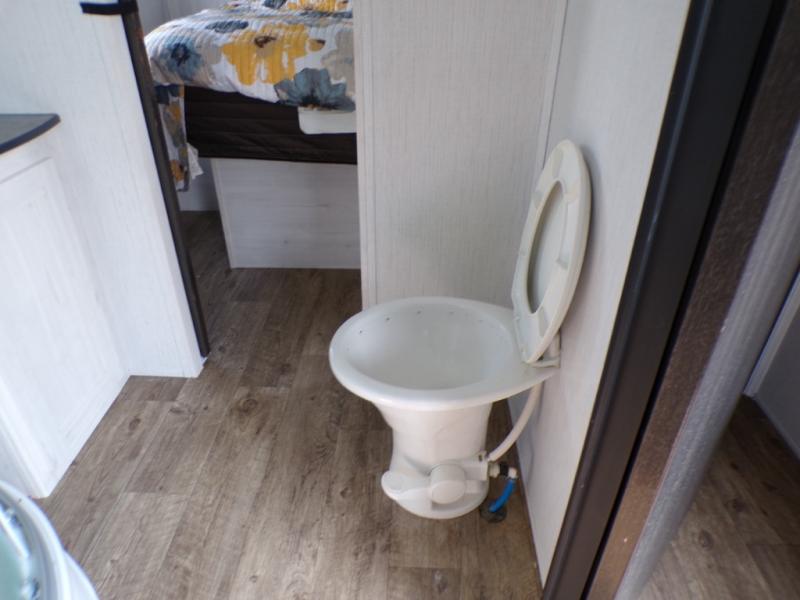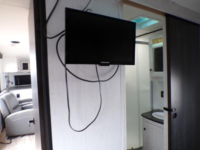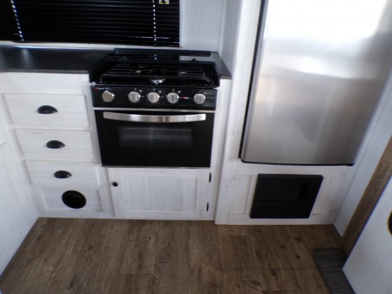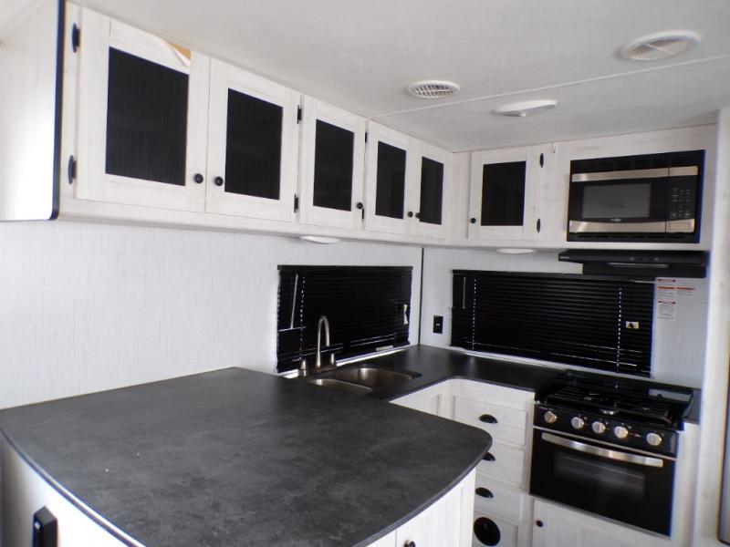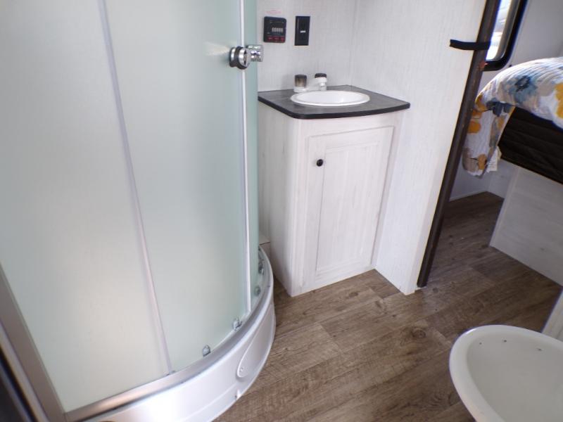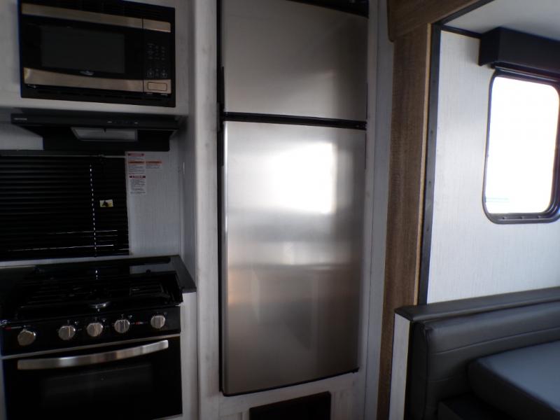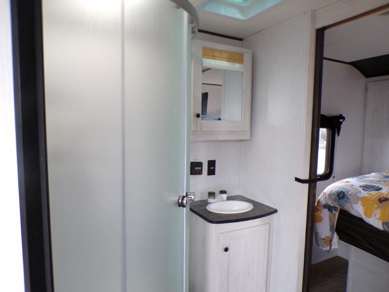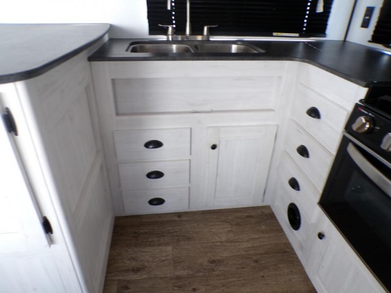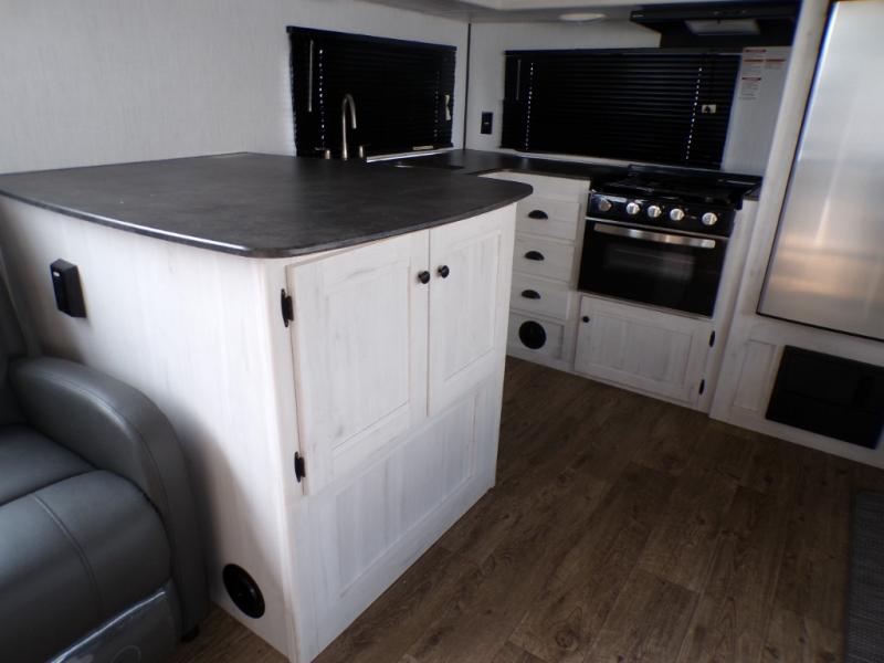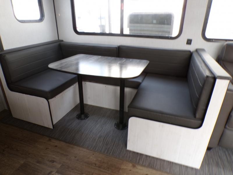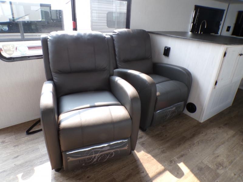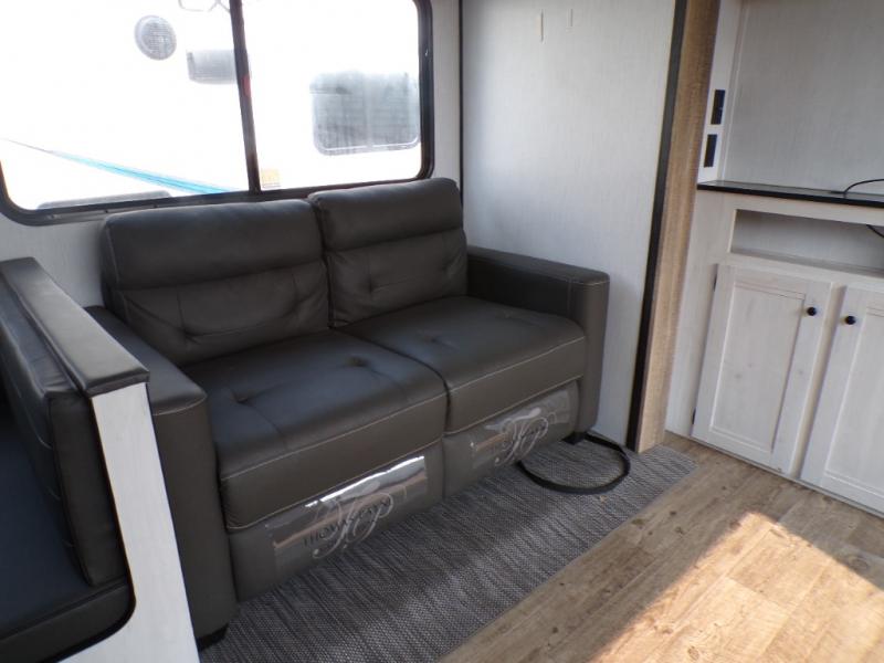 The chef will love cooking in the rear kitchen of this travel trailer! It has plenty of countertop space for meal prep and the U-shaped dinette is a comfortable place to enjoy them at. After you have stuffed your bellies full, relax on either the sofa or one of the two recliners while it settles. Freshen up each morning in the dual entry bathroom with the radius shower that has a skylight above to bring the outdoors inside. It even leads directly into the front private bedroom which has a queen bed with under-bed storage, wireless cell charging stations, and CPAP storage. Keep the dirt outdoors where it belongs with an outside shower!