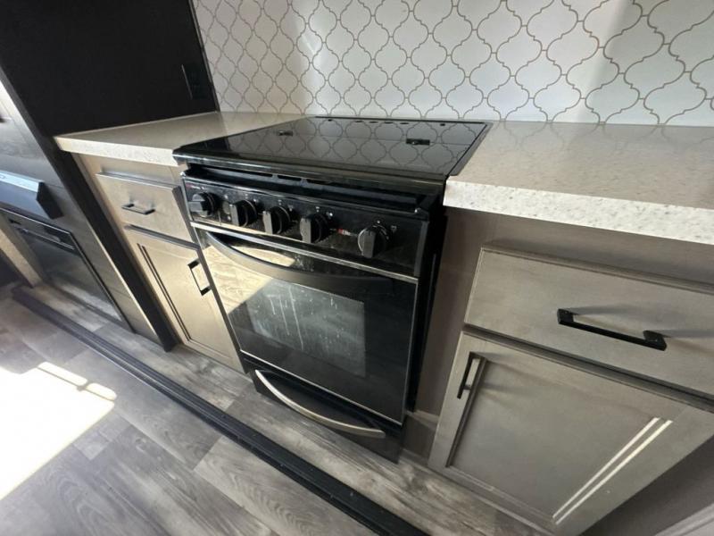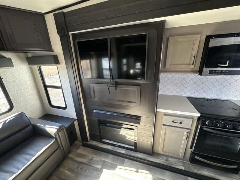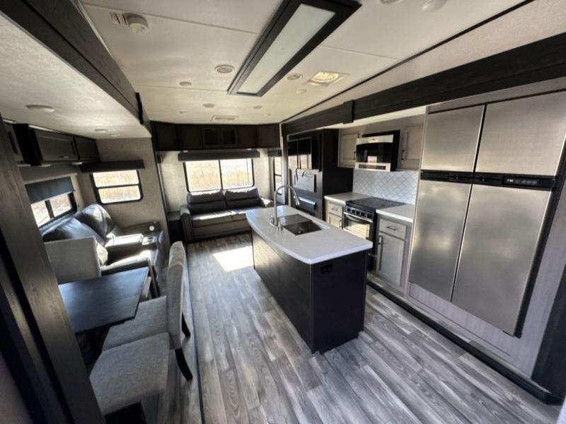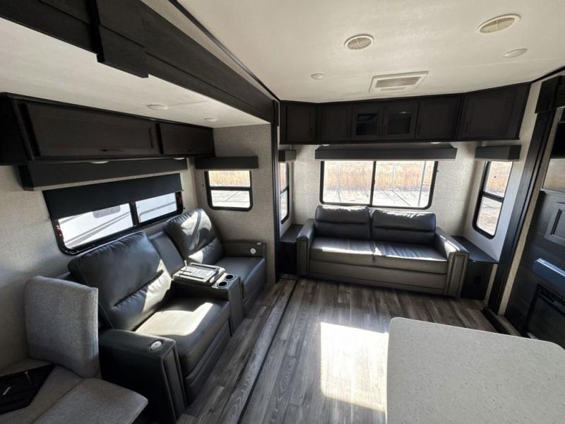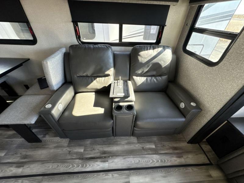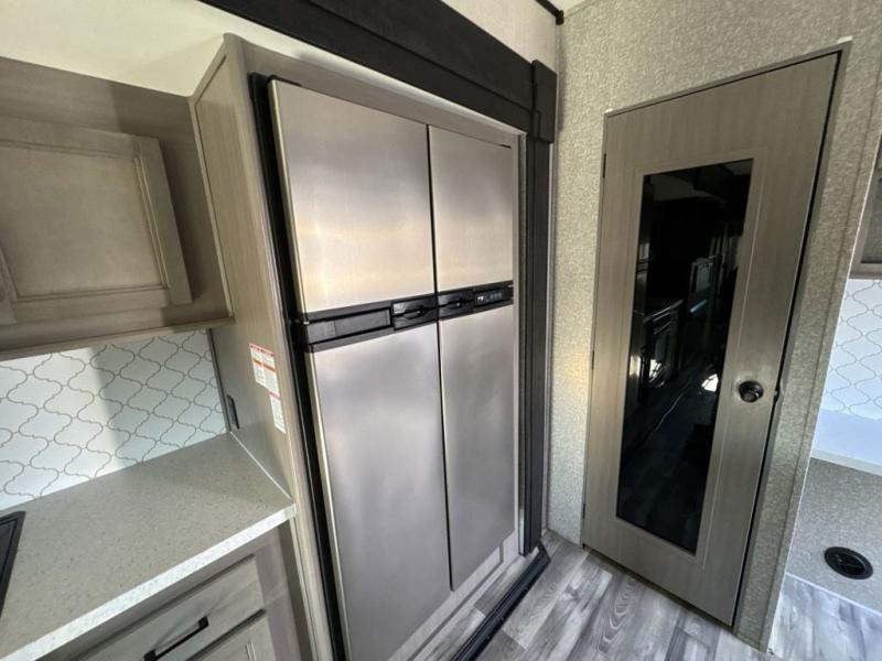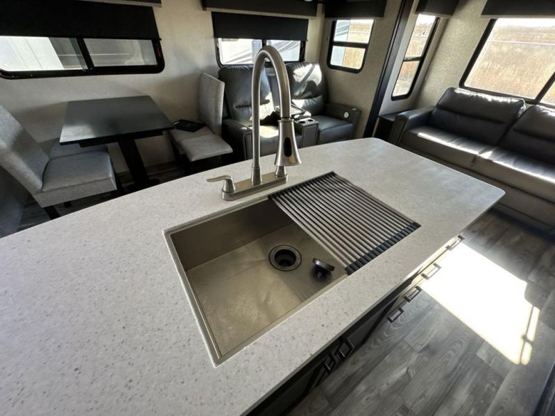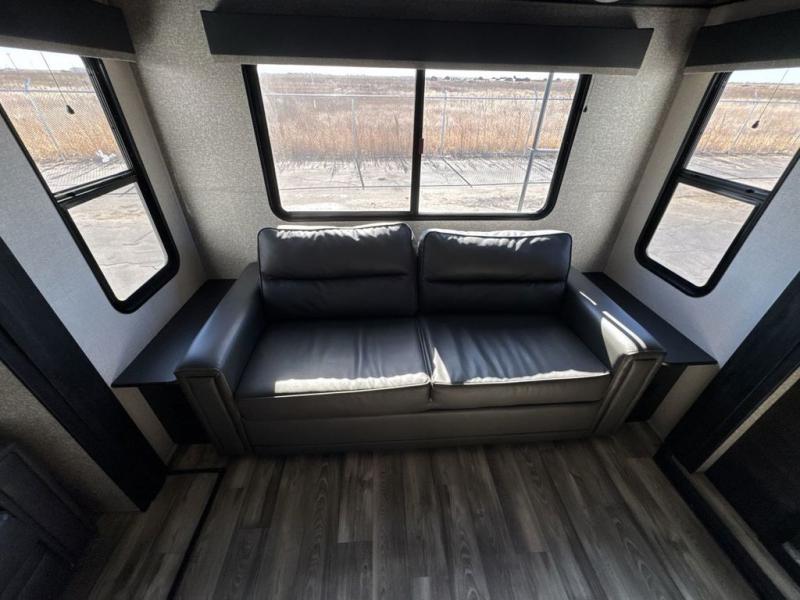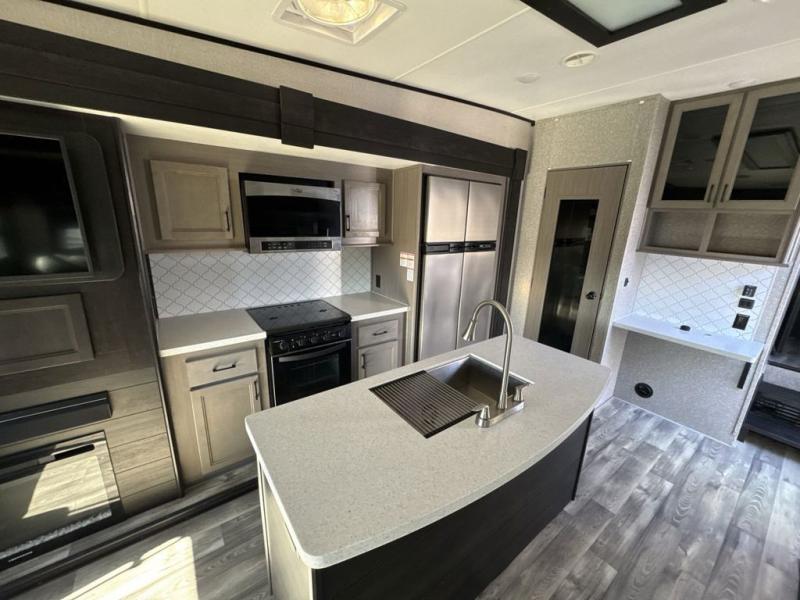 If you need to get some work done while you are away then this fifth wheel is perfect! It has a desk in the kitchen next to the large pantry so you can easily grab a snack. The dual entry bathroom is easy for everyone to access especially those staying in the front private bedroom and even has an area prepped to add an optional washer and dryer. Inside the bedroom is a wardrobe slide to keep your clothes looking nice and a queen bed with a power base for a good night's rest. You can easily prepare a delicious meal with the kitchen island and three burner cooktop then enjoy it at the table and chairs. Now that your belly is full, head to the rear tri-fold sofa or theater seating to watch your favorite movie on the 50" LED HDTV!