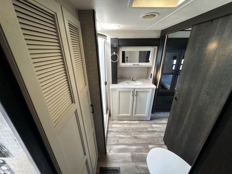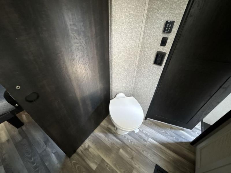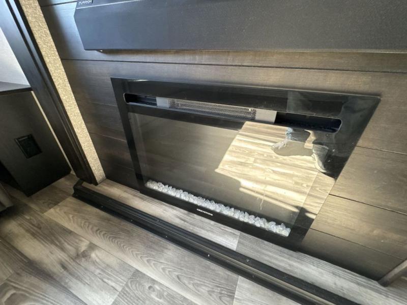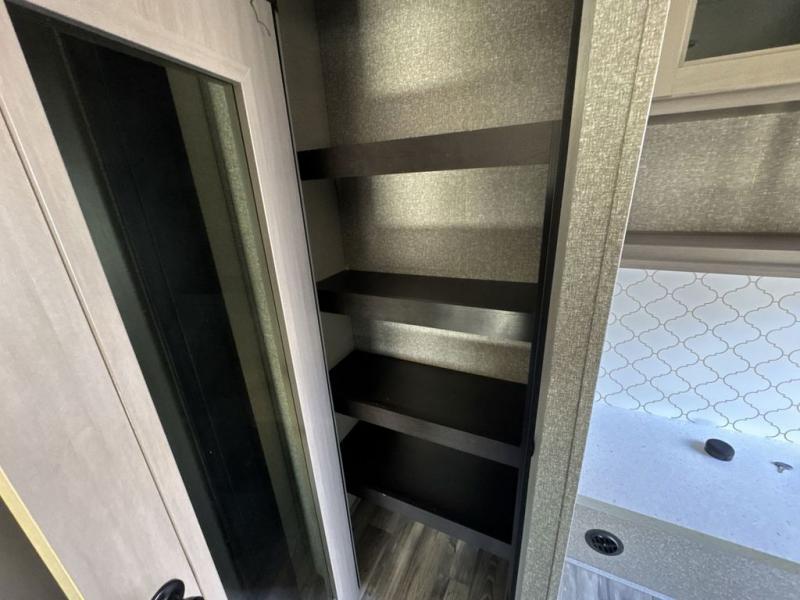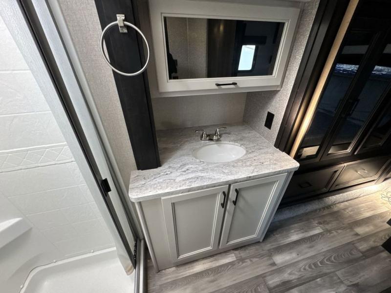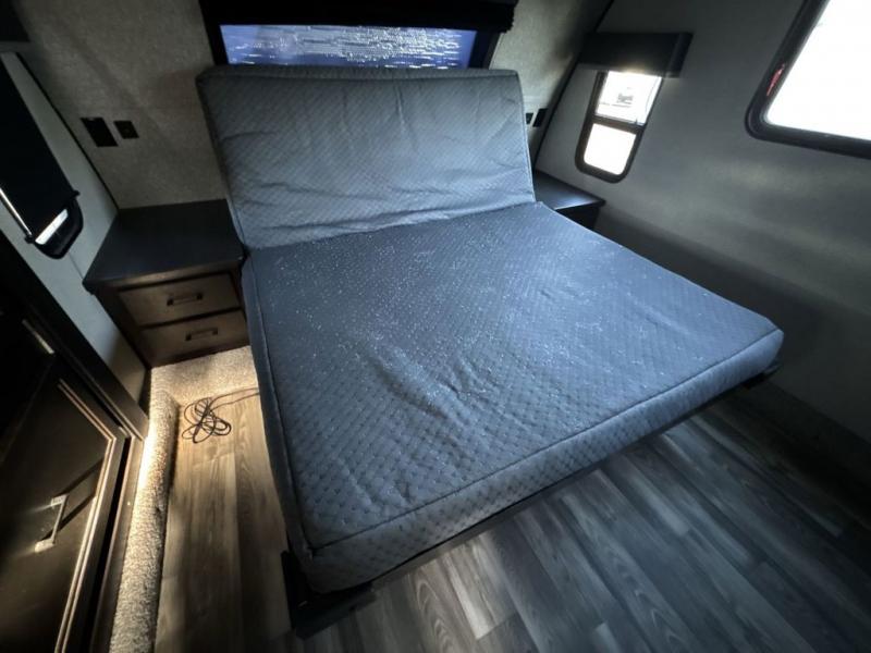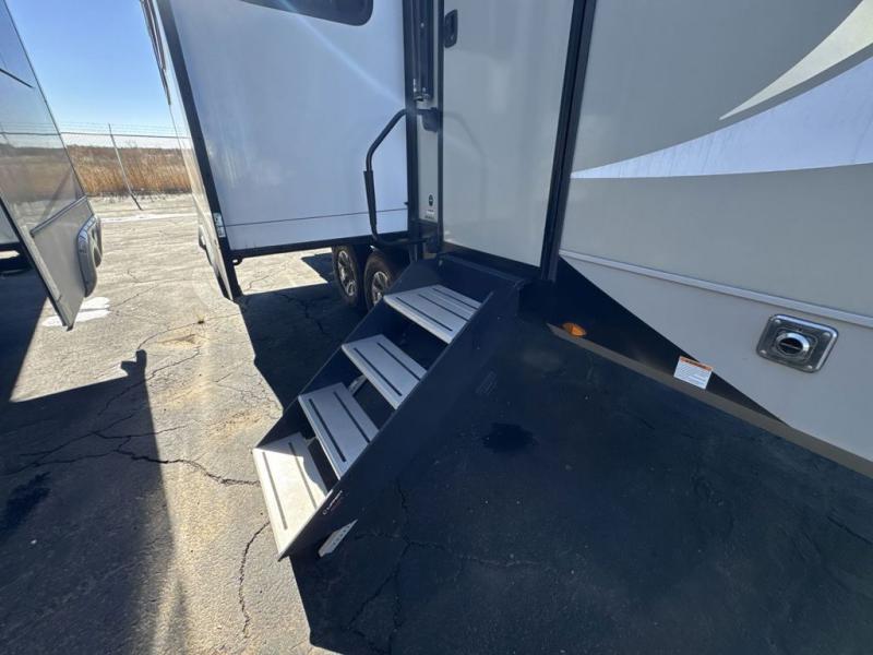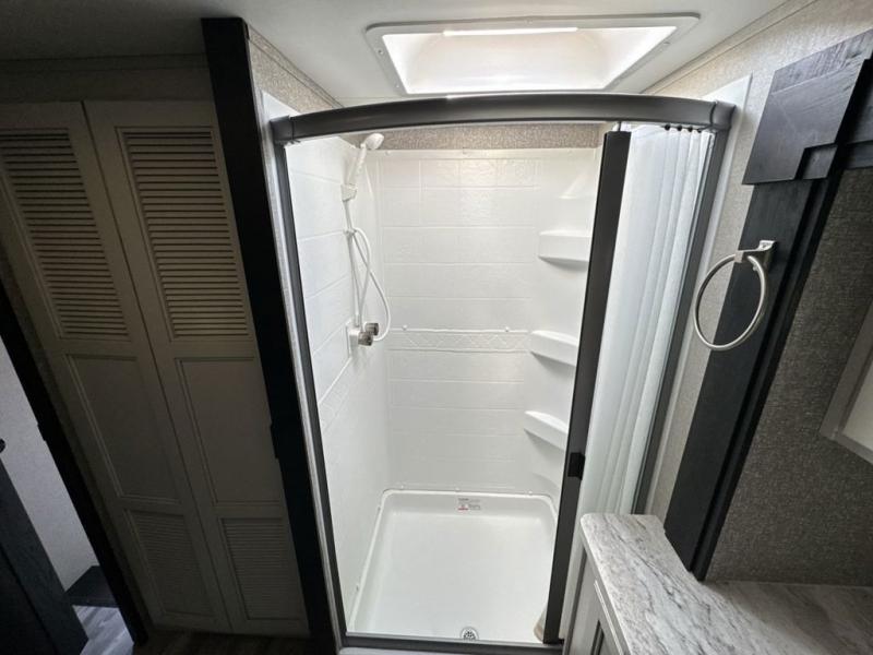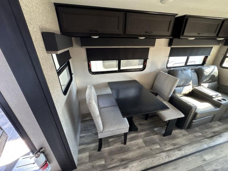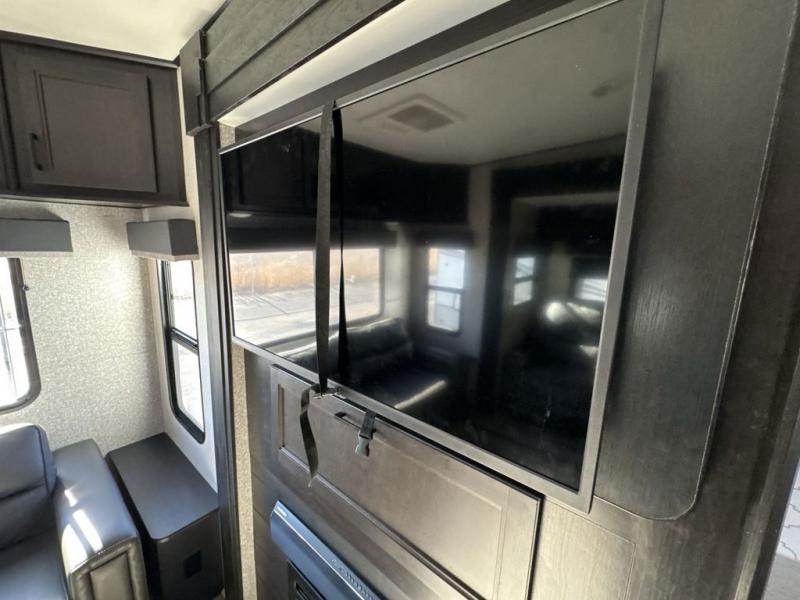 If you need to get some work done while you are away then this fifth wheel is perfect! It has a desk in the kitchen next to the large pantry so you can easily grab a snack. The dual entry bathroom is easy for everyone to access especially those staying in the front private bedroom and even has an area prepped to add an optional washer and dryer. Inside the bedroom is a wardrobe slide to keep your clothes looking nice and a queen bed with a power base for a good night's rest. You can easily prepare a delicious meal with the kitchen island and three burner cooktop then enjoy it at the table and chairs. Now that your belly is full, head to the rear tri-fold sofa or theater seating to watch your favorite movie on the 50" LED HDTV!