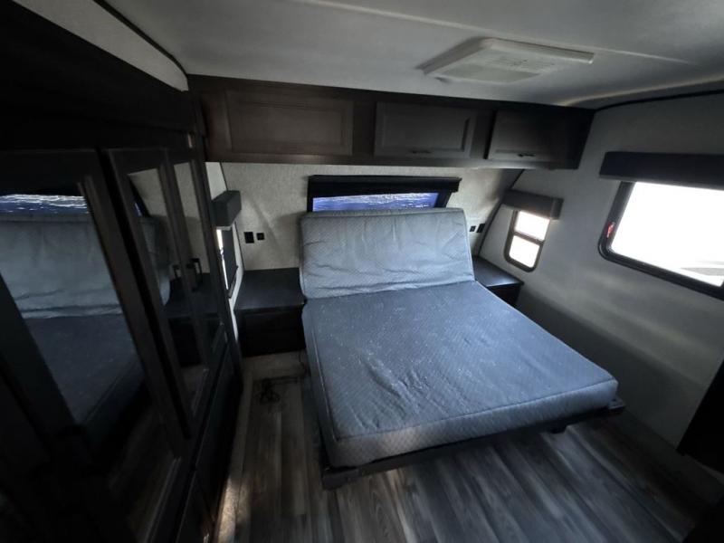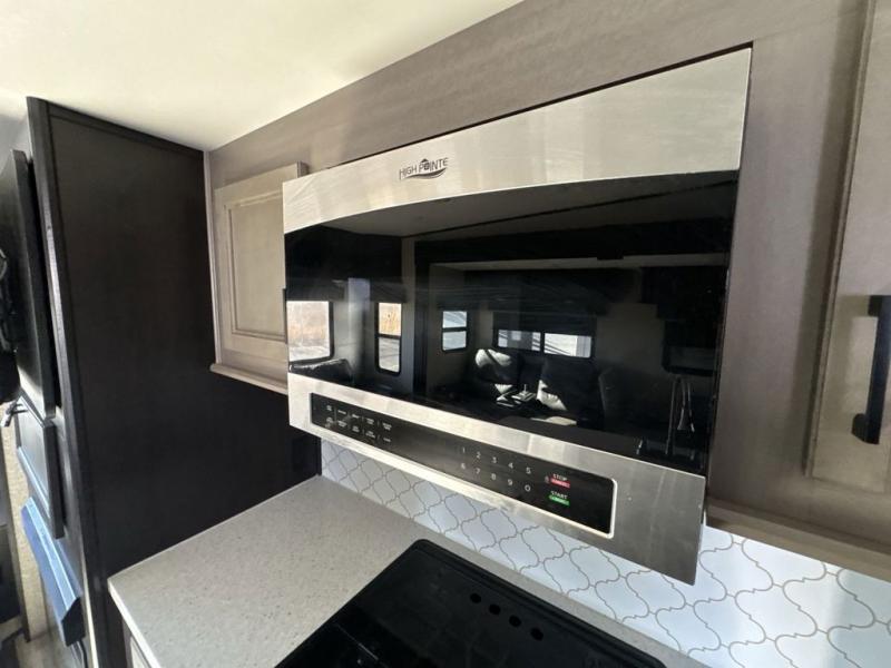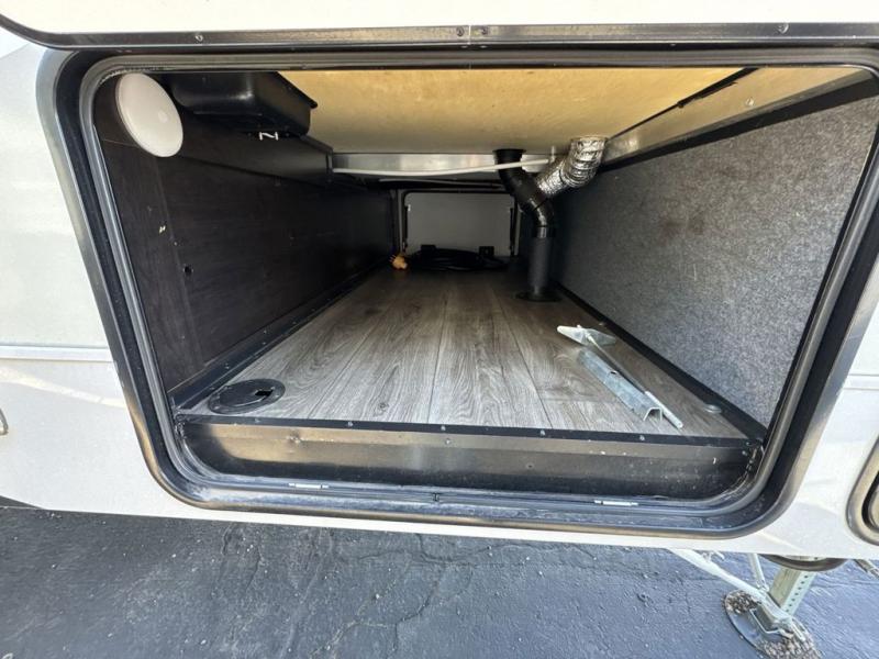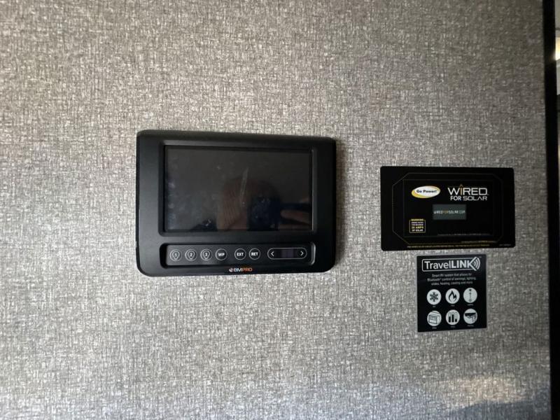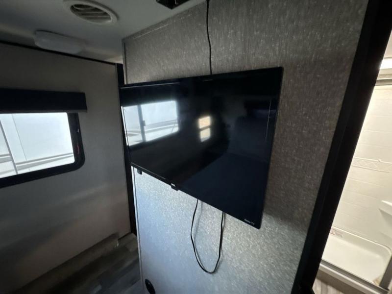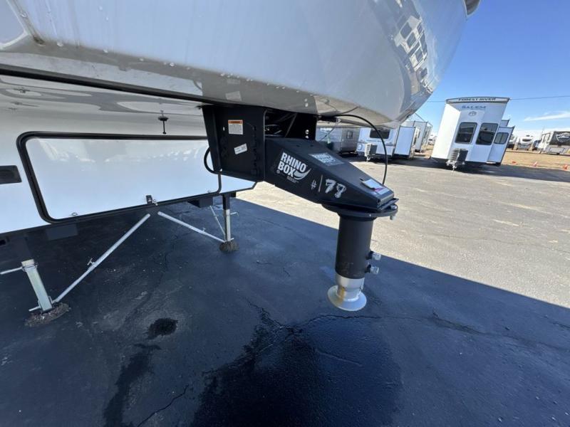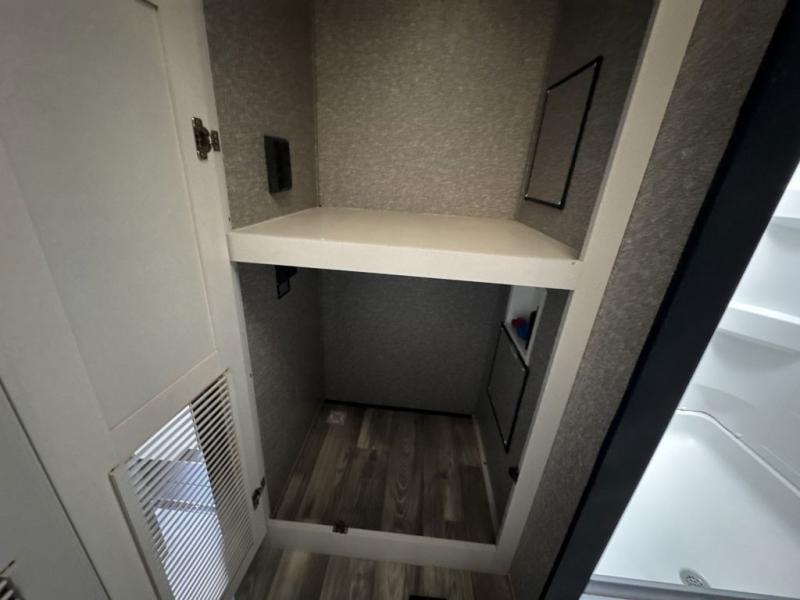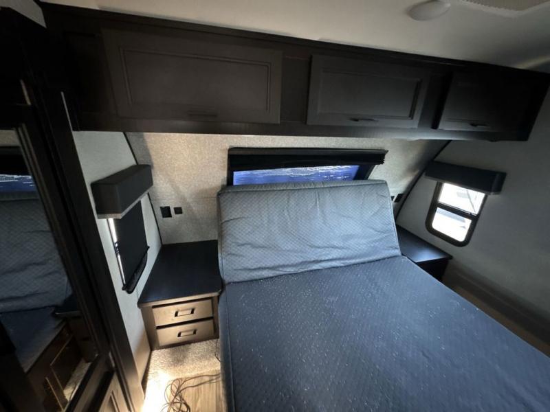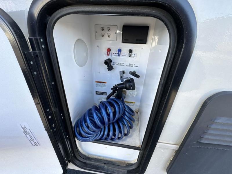 If you need to get some work done while you are away then this fifth wheel is perfect! It has a desk in the kitchen next to the large pantry so you can easily grab a snack. The dual entry bathroom is easy for everyone to access especially those staying in the front private bedroom and even has an area prepped to add an optional washer and dryer. Inside the bedroom is a wardrobe slide to keep your clothes looking nice and a queen bed with a power base for a good night's rest. You can easily prepare a delicious meal with the kitchen island and three burner cooktop then enjoy it at the table and chairs. Now that your belly is full, head to the rear tri-fold sofa or theater seating to watch your favorite movie on the 50" LED HDTV!