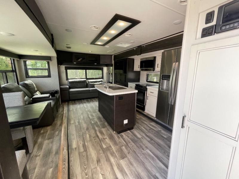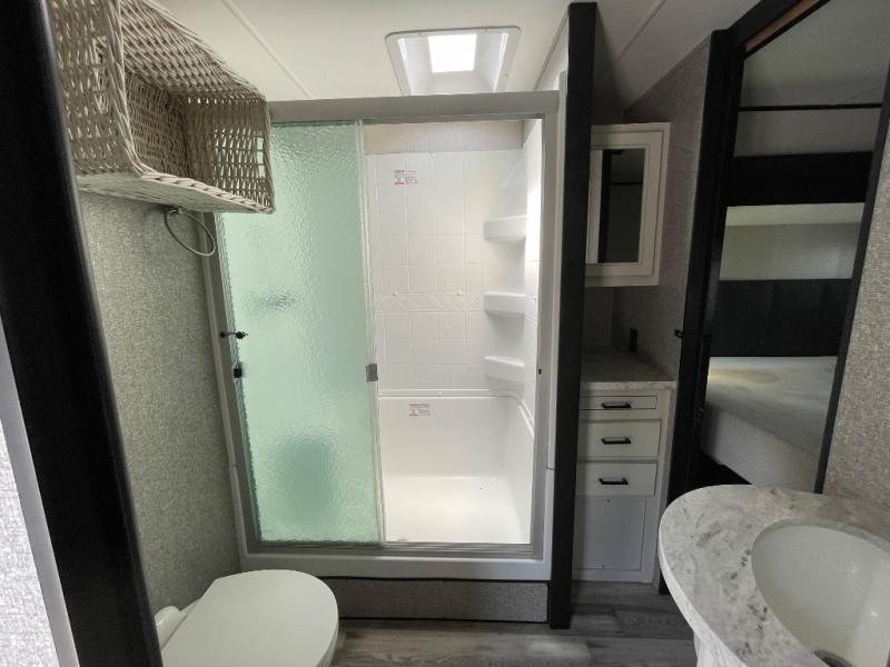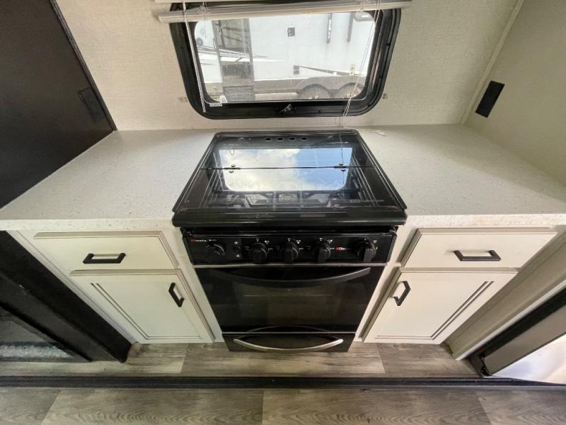 A couple will enjoy staying in this trailer whether it is full-time, part-time or for long weekends. The front master bedroom provides easy access to the double entry bathroom which is super convenient at night, a queen bed slide or choose the king option, a dresser with a window above, and a mirrored wardrobe, plus a wardrobe prepped for a washer/dryer option. The bathroom has everything you will need to stay clean and refreshed for the next activity as well as two medicine cabinets. The rear living area offers a tri-fold sofa with adjustable headrests to sit on while watching the 39" LED HDTV with fireplace below, and the theater seats are perfect for a movie night. You can dine, play games and work from the free standing table and chairs, and the kitchen amenities allow the cook to make meals for two or more!