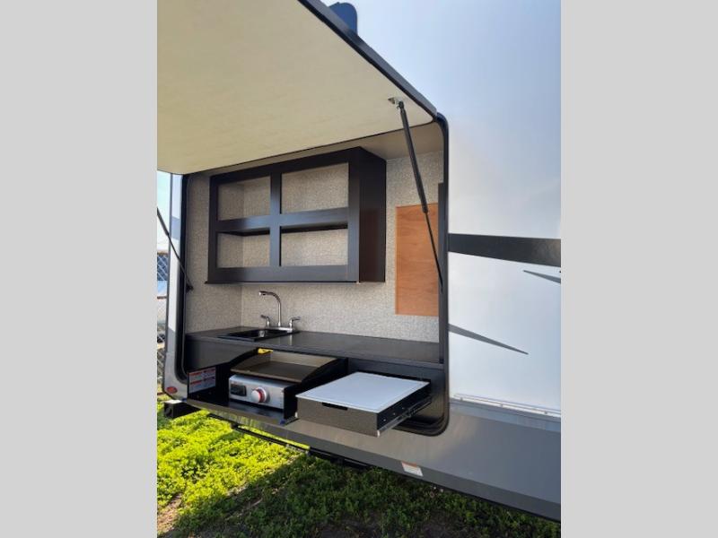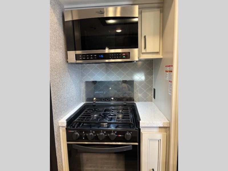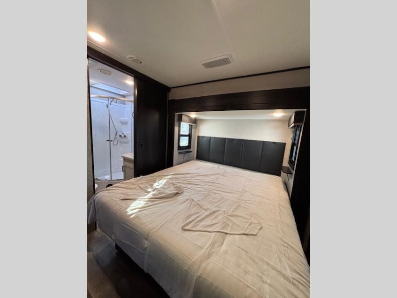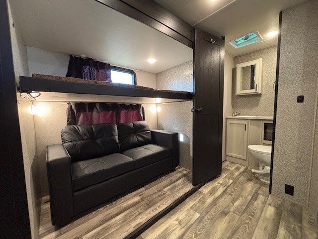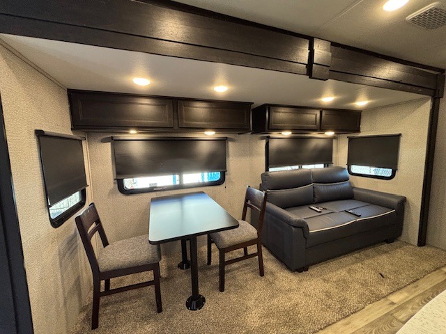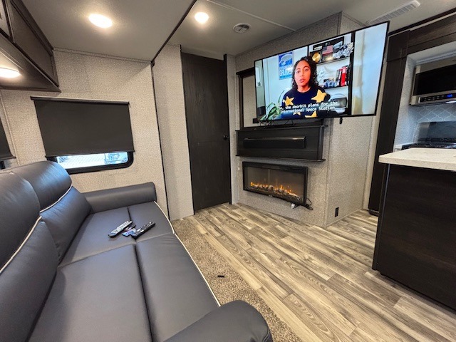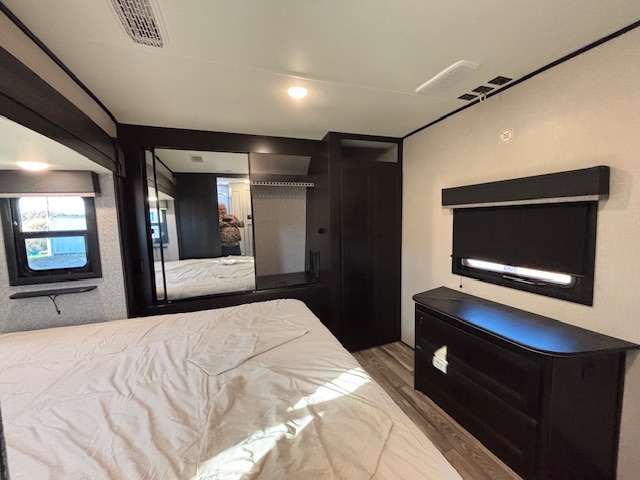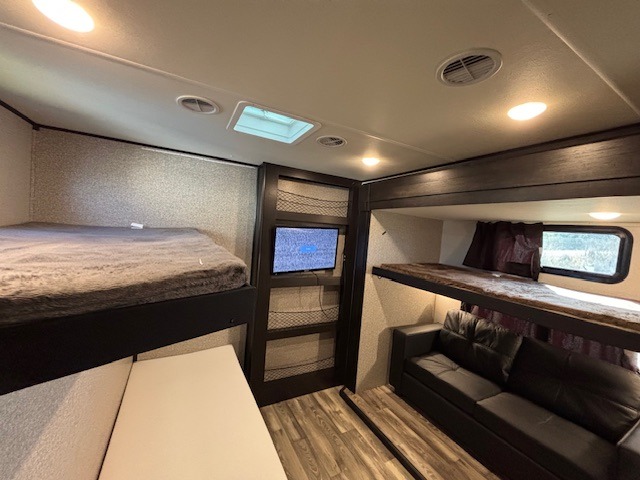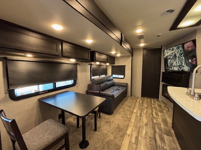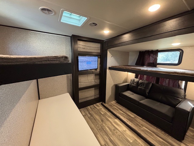 Spacious, comfortable and convenient are a few adjectives you might use when camping or even living in this trailer. The four slides throughout offer more floor space in each room from the master bedroom with a queen bed slide out, and the main living and kitchen area with dual opposing slides to the bunkhouse slide. The bedroom also offers a mirrored wardrobe, a prepped space for a washer/dryer option, a dresser with window above and easy access to the double entry full bath. The rear bunkhouse gives you two bunks, a dinette, bench seating, a hutch plus a half bath for your kids or your friends. And the main area provides a U-Lounge with two tables and watch the 50" LED HDTV with fireplace below and to visit with the cook working at the island and using all the amenities in the kitchen.