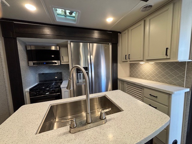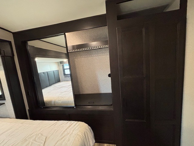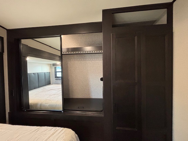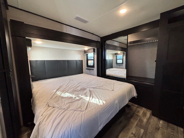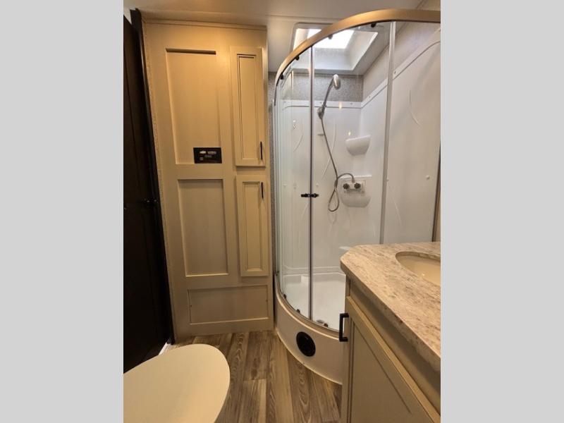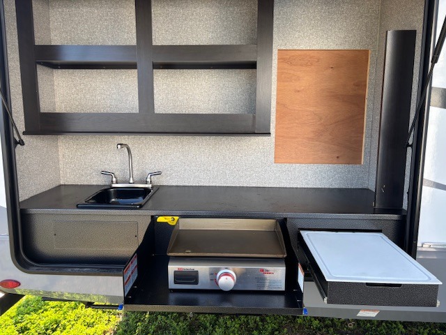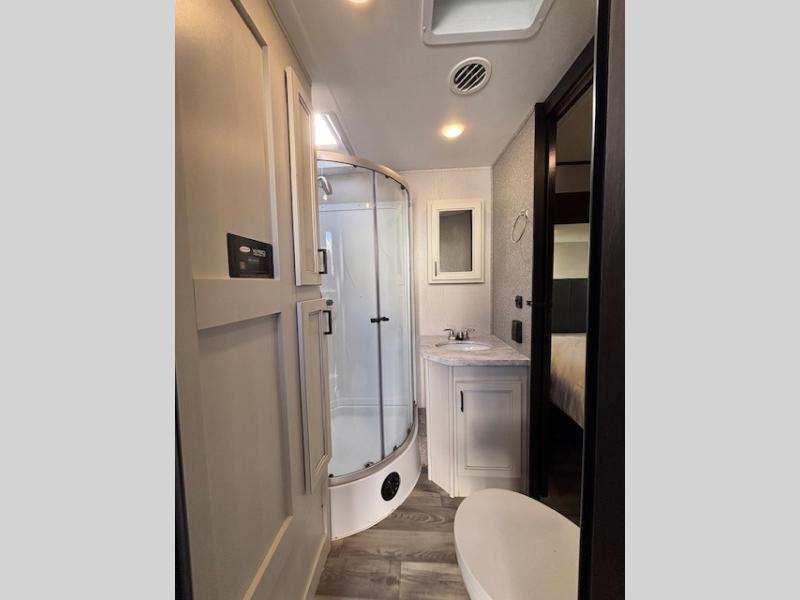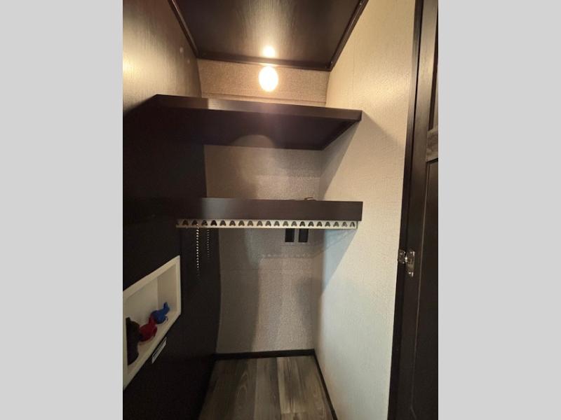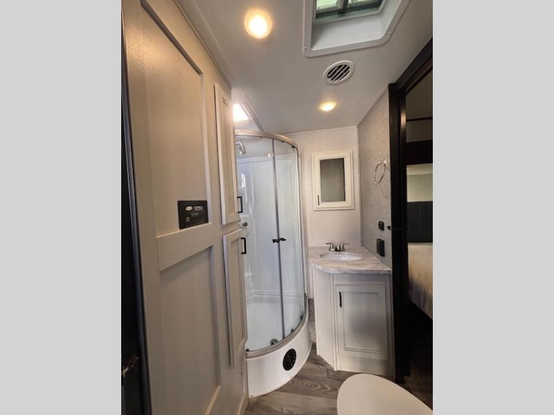 Spacious, comfortable and convenient are a few adjectives you might use when camping or even living in this trailer. The four slides throughout offer more floor space in each room from the master bedroom with a queen bed slide out, and the main living and kitchen area with dual opposing slides to the bunkhouse slide. The bedroom also offers a mirrored wardrobe, a prepped space for a washer/dryer option, a dresser with window above and easy access to the double entry full bath. The rear bunkhouse gives you two bunks, a dinette, bench seating, a hutch plus a half bath for your kids or your friends. And the main area provides a U-Lounge with two tables and watch the 50" LED HDTV with fireplace below and to visit with the cook working at the island and using all the amenities in the kitchen.