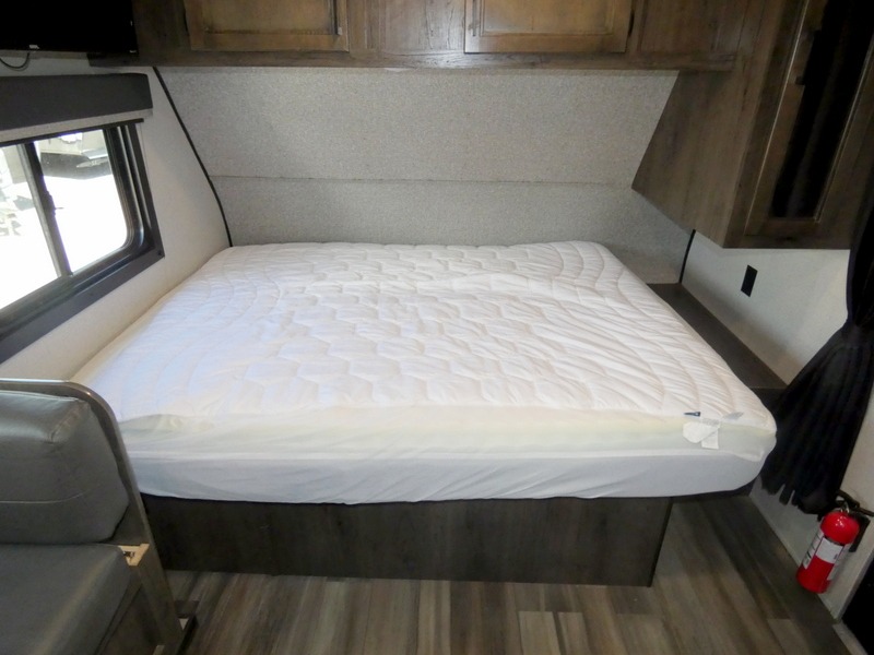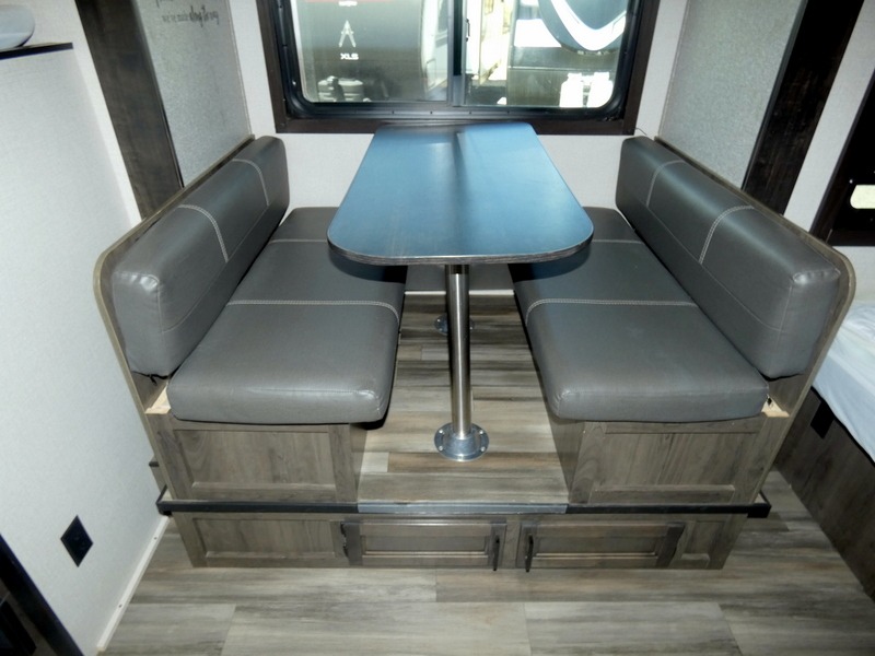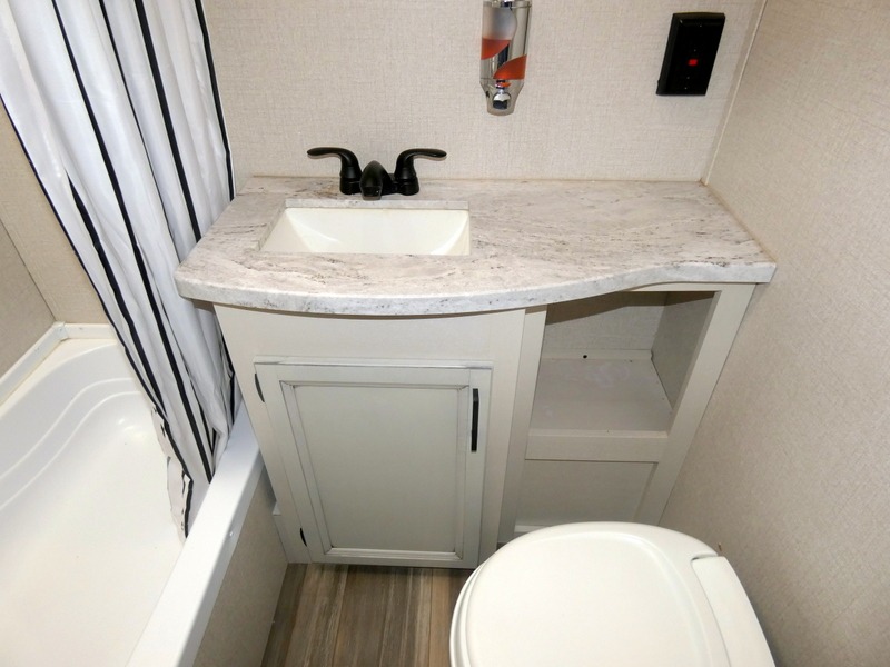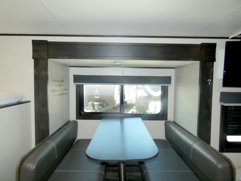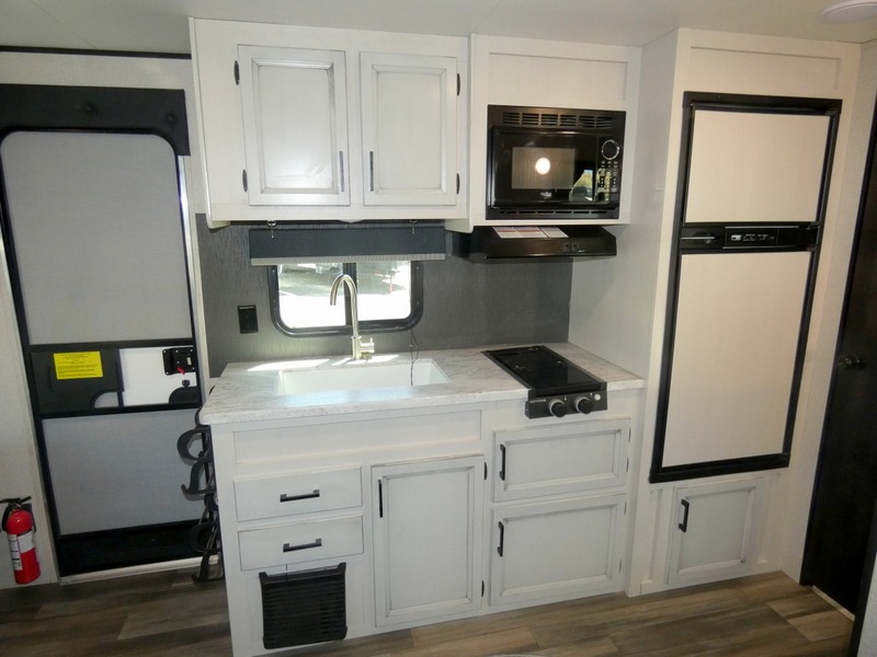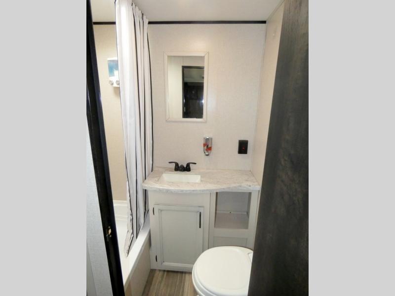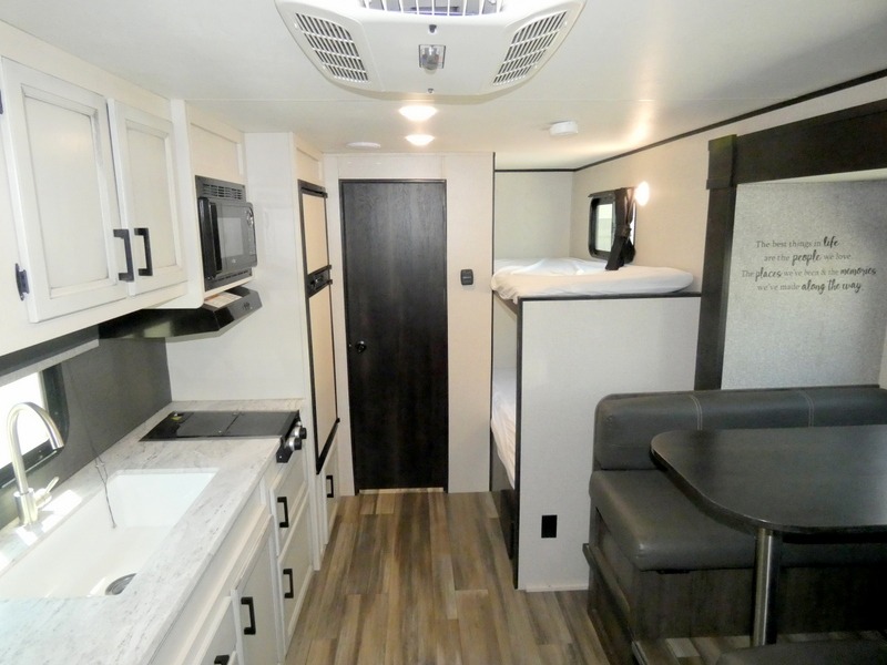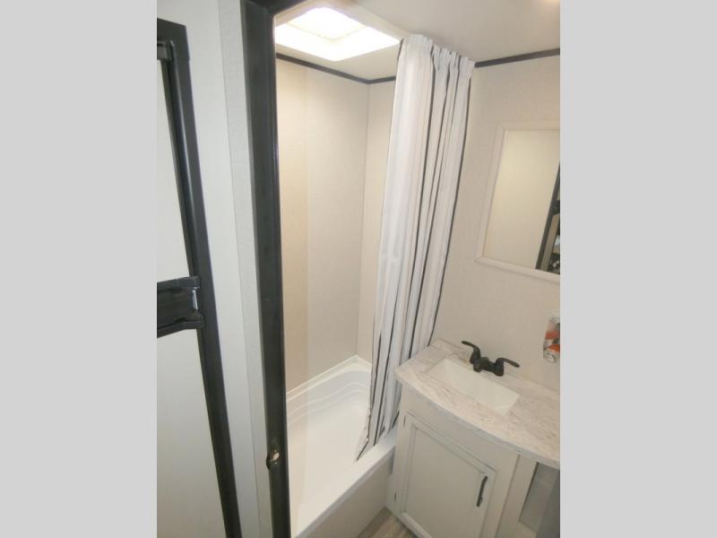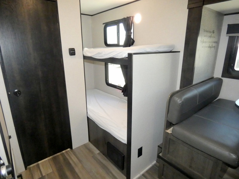 Camping with a group has never been easier than in this travel trailer with bunk beds! You will enjoy the bed up front and there is a wardrobe nearby to keep your clothes tidy. This model also includes a booth dinette slide that will be perfect for meal times, game night, and even sleeping space for one to two people. Whip up some eggs and bacon on the two burner cooktop or in the microwave oven before you head out for the day. The full bath with a tub/shower will be perfect if you're camping with little ones, and there is plenty of counterspace to set out your bathroom necessities.