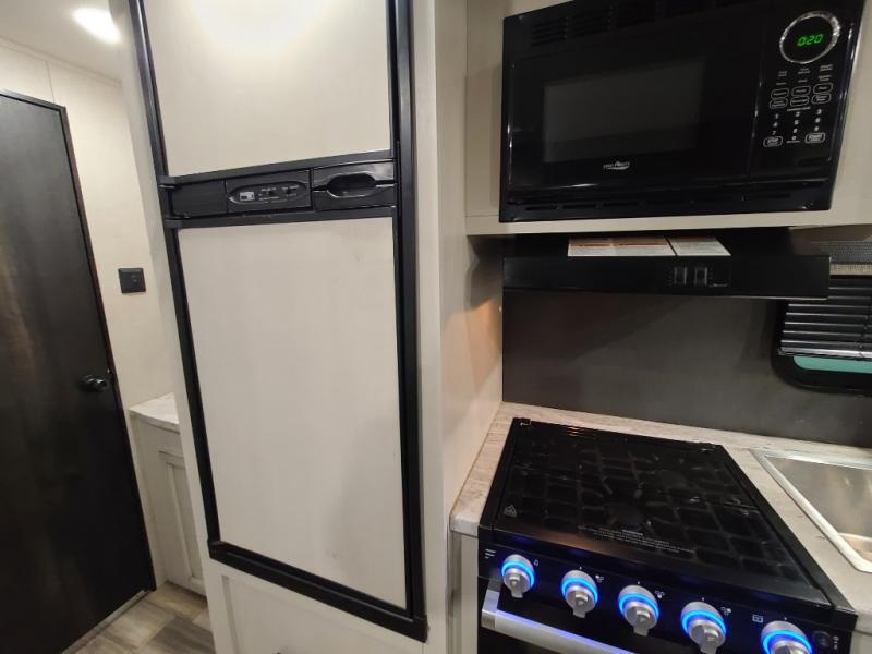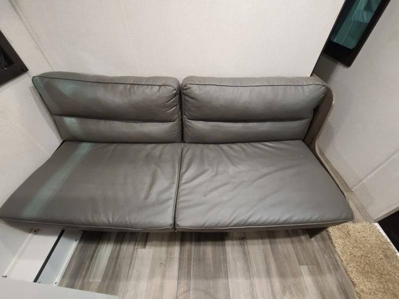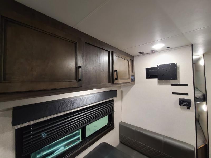 This dual-axle travel trailer can sleep eight people each night, so invite your family or friends along. You will enjoy the front private bedroom up front with dual wardrobes to keep your clothes tidy, and an easy lift bed with storage. While the chef of your group is preparing lunch on the three burner cooktop, everyone else can visit on the jack-knife sofa or play a game at the booth dinette. You will also find a large 19' power awning with LED lights outdoors which is where you may usually find everyone. The private tub/shower and toilet is right next to the double-size bunks for convenience, and the sink is just outside of this room so two people can freshen up at once.