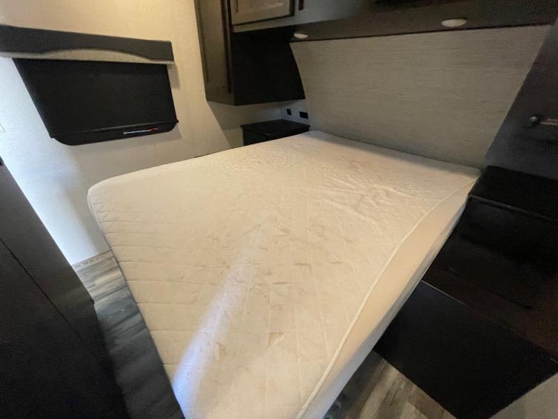 You're going to love every minute spent in this spacious travel trailer. The booth dinette and jack-knife sofa within the large slide out will be perfect for meal times, relaxing, and additional sleeping space. Add the optional LED TV to the entertainment center and you're set up for movie night! This model includes an outside kitchen with a griddle and a refrigerator for cold drinks, plus indoor appliances if the rain has ruined your plans for the day. You will enjoy your own bedroom up front with space-saving sliding doors and two wardrobes for your clothes.