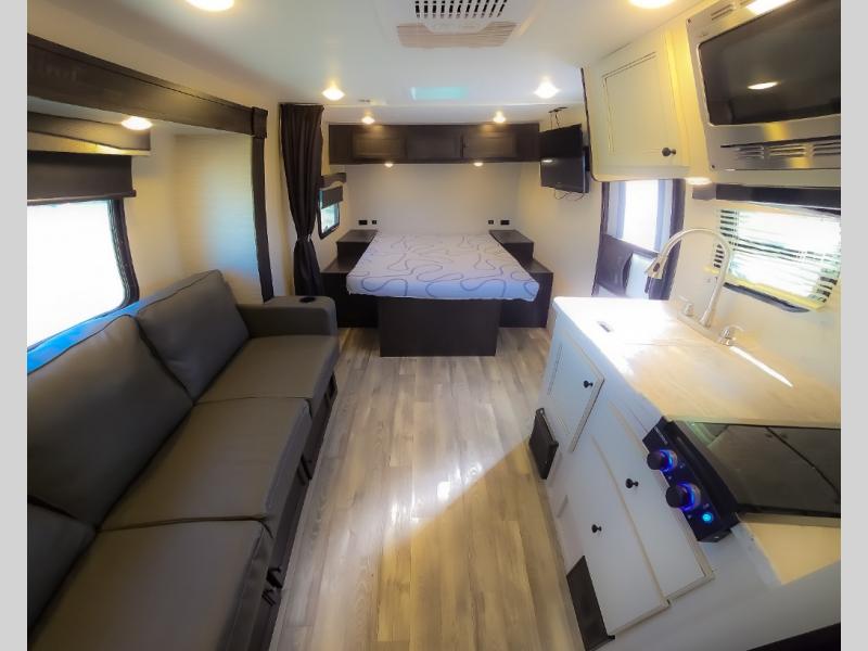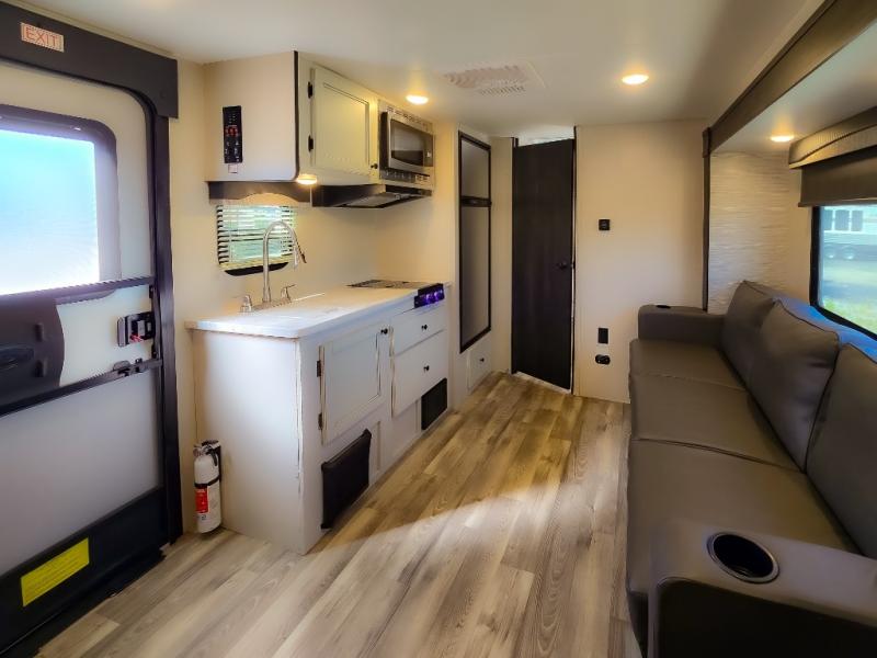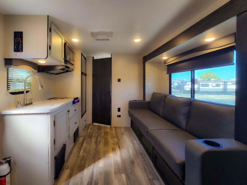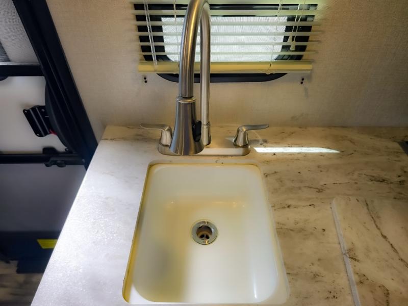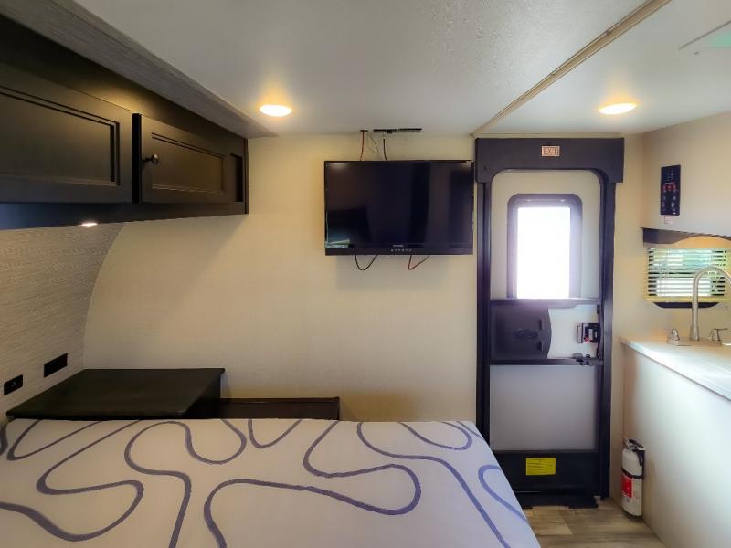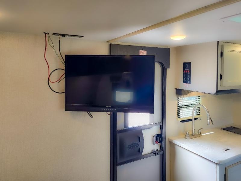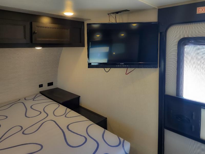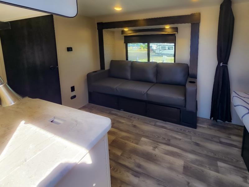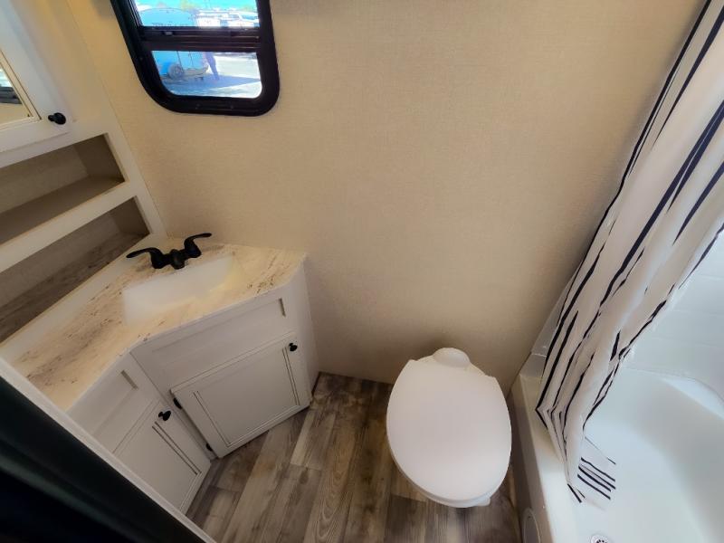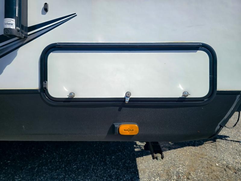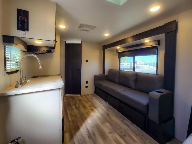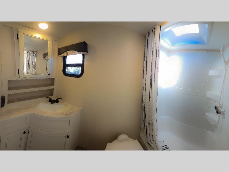 You will have added privacy from having the full bathroom located in the back of this Range Lite Air travel trailer. The bathroom has a tub/shower, foot-flush toilet, vanity, medicine cabinet, and linen closet, so you'll be completely cared for as you get ready. Up at the front is where you will find the 80" bed. This bed can be sectioned off into a bedroom when you draw the privacy curtain, and there are electrical outlets and USB ports in this area. The 32" 12V LED TV with built-in AM/FM/Bluetooth sound bar will provide you with some entertainment while you rest on the jackknife sofa, and there is space for extra gear outside in the exterior storage compartments.