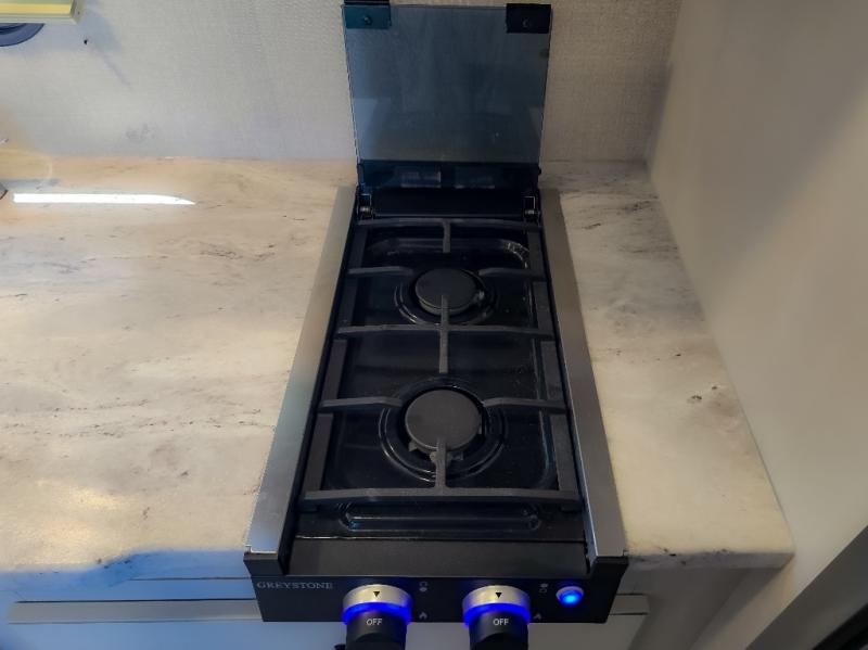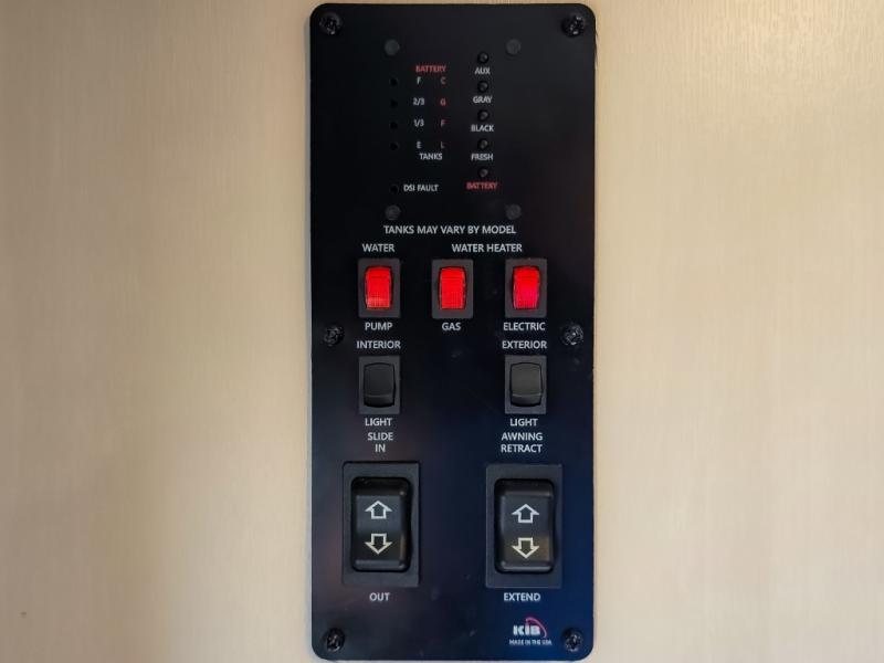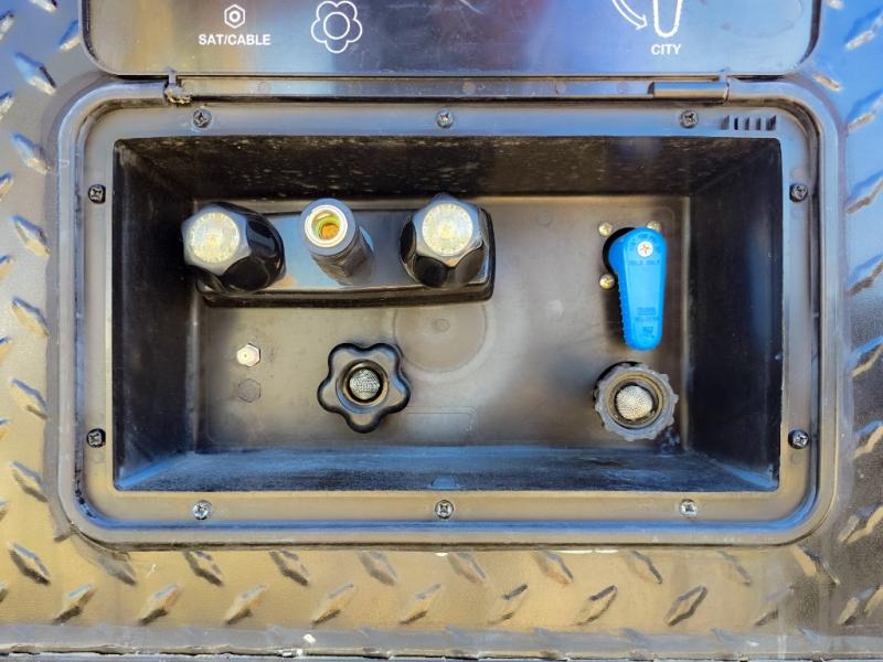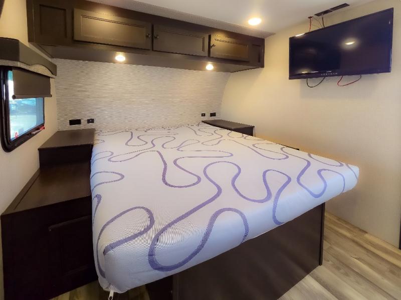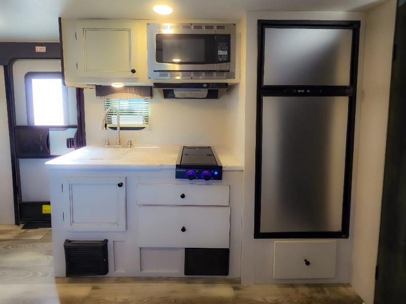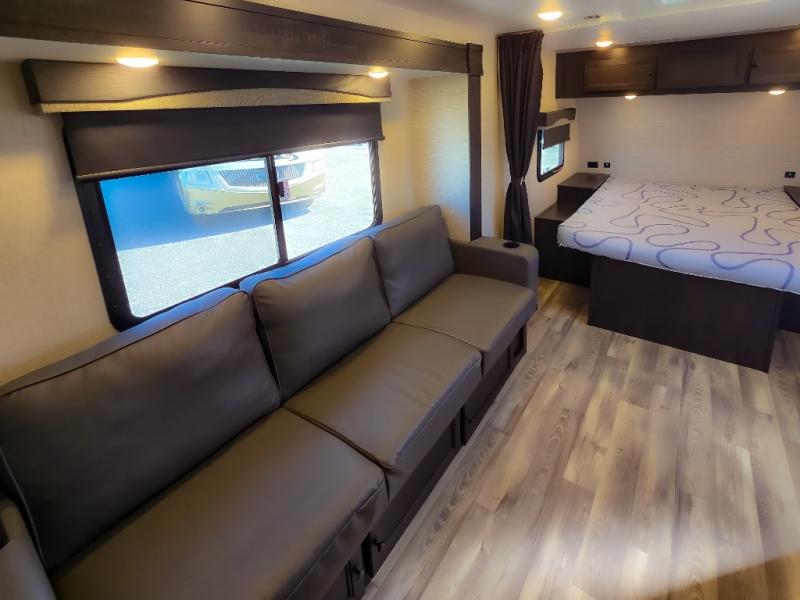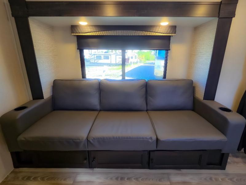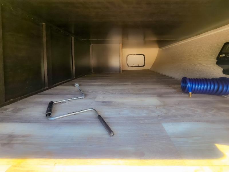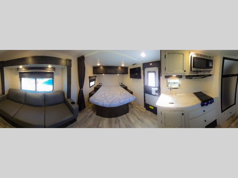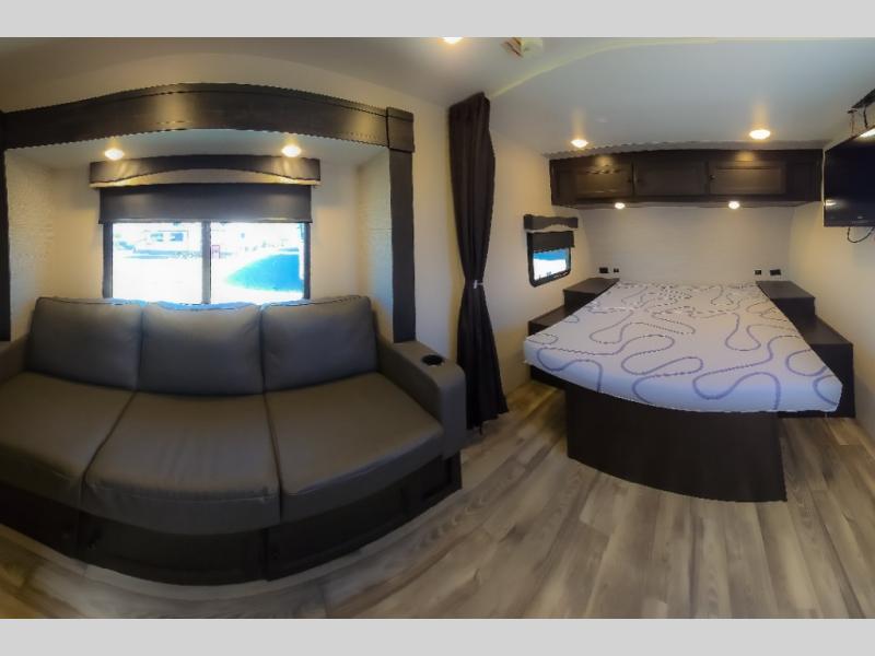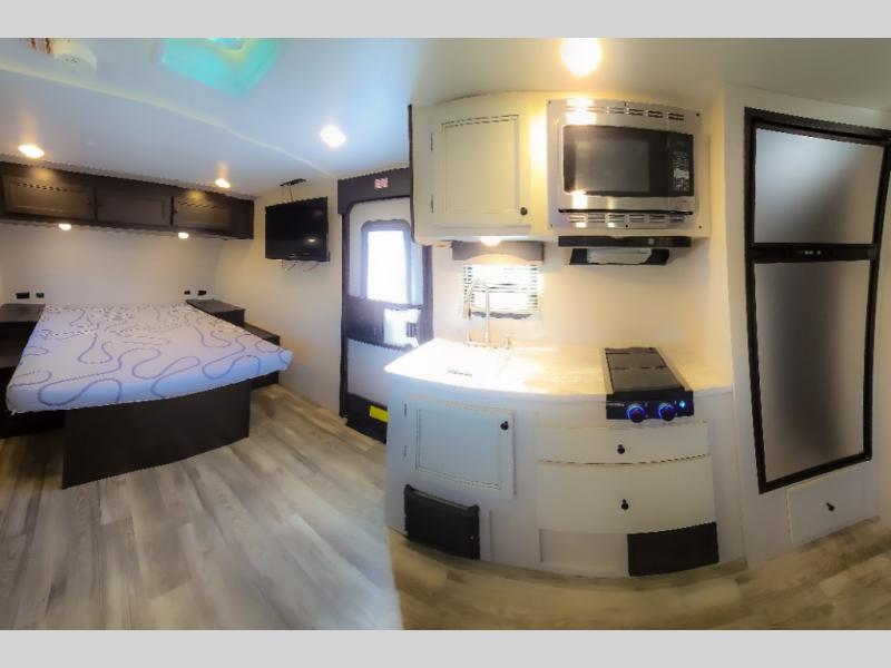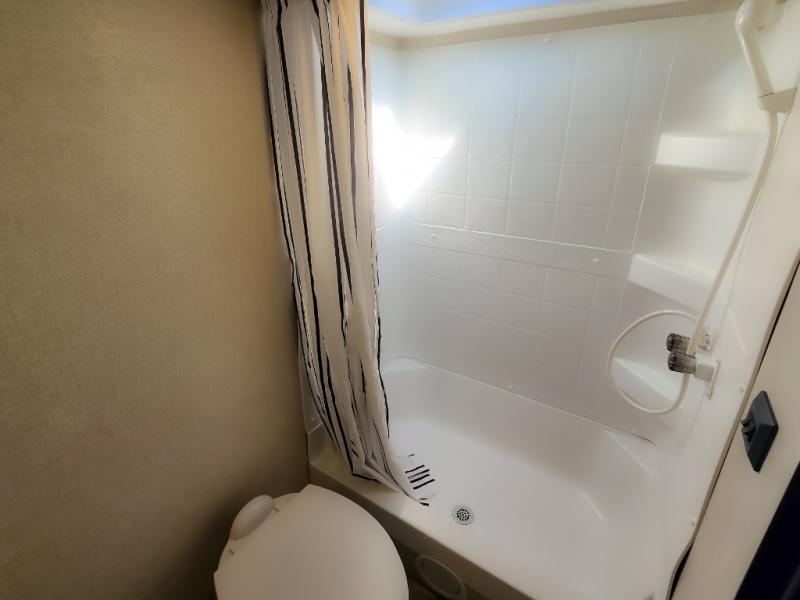 You will have added privacy from having the full bathroom located in the back of this Range Lite Air travel trailer. The bathroom has a tub/shower, foot-flush toilet, vanity, medicine cabinet, and linen closet, so you'll be completely cared for as you get ready. Up at the front is where you will find the 80" bed. This bed can be sectioned off into a bedroom when you draw the privacy curtain, and there are electrical outlets and USB ports in this area. The 32" 12V LED TV with built-in AM/FM/Bluetooth sound bar will provide you with some entertainment while you rest on the jackknife sofa, and there is space for extra gear outside in the exterior storage compartments.