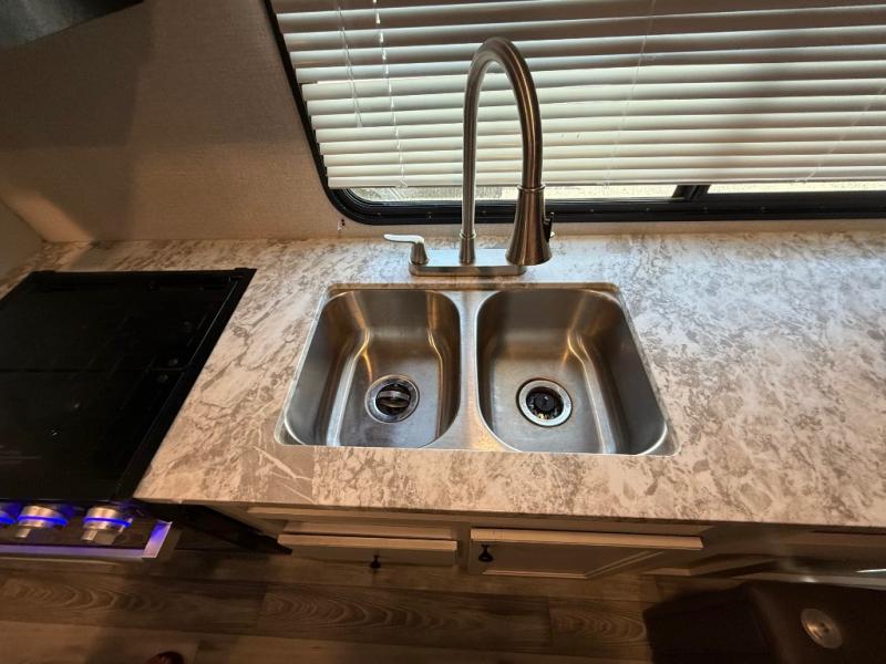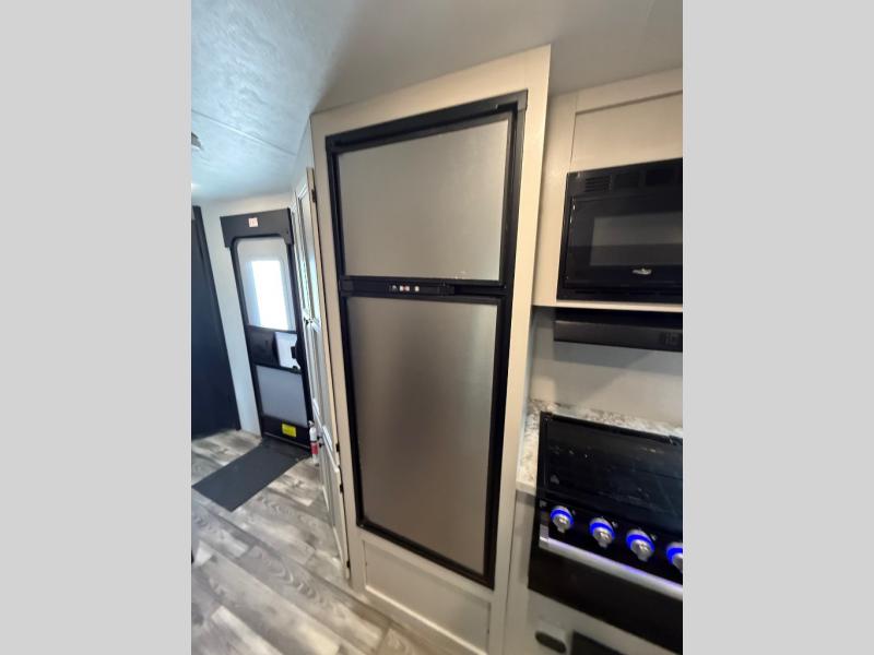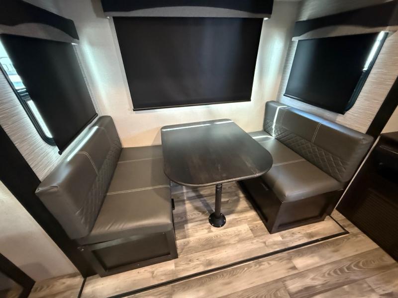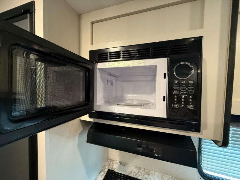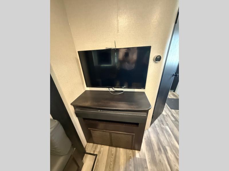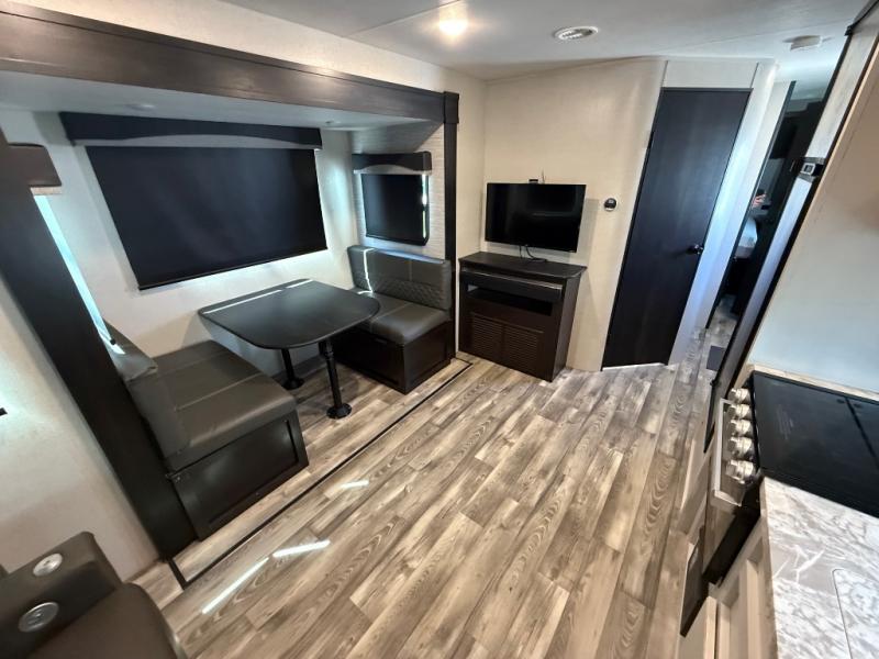 Enjoy a comfortable camping trip in this travel trailer! The rear tri-fold sofa has countertop space for you to set your bowl of popcorn on while you watch a movie on the LED HDTV at the entertainment center. Prepare your best meals with the three burner cooktop and 17" oven then enjoy them at the booth dinette slide which can also transform into an extra sleeping space. The dual entry bathroom has a radius shower to freshen up in each morning and leads directly into the front private bedroom which has a queen bed with underbed drawers, wardrobes on either side of the bed, and a laundry chute to keep your dirty clothes out of the way!
