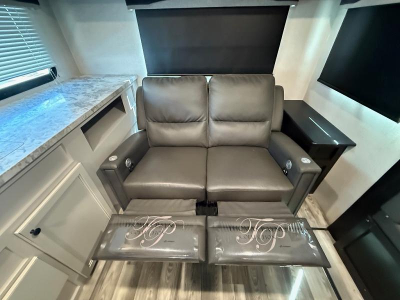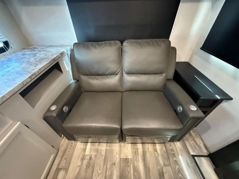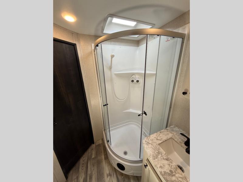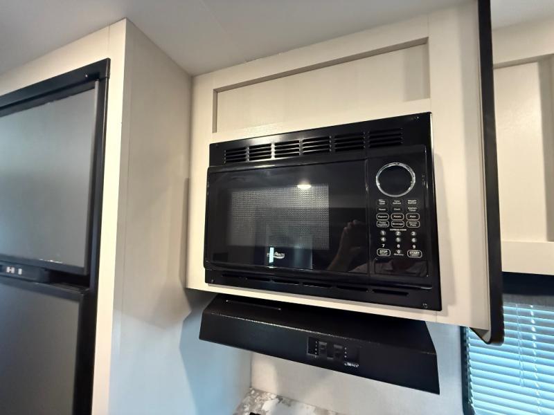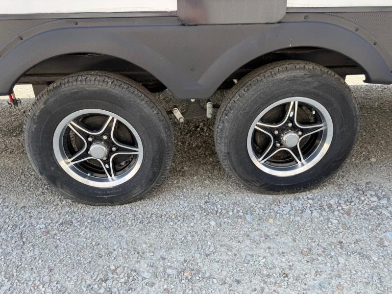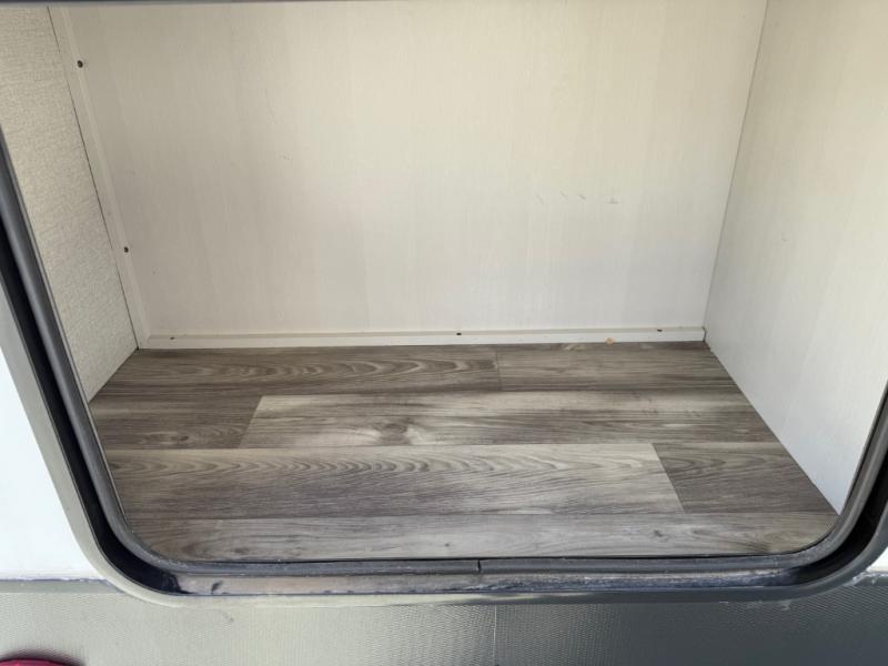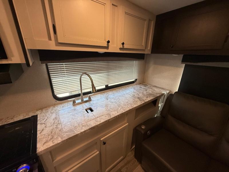 Enjoy a comfortable camping trip in this travel trailer! The rear tri-fold sofa has countertop space for you to set your bowl of popcorn on while you watch a movie on the LED HDTV at the entertainment center. Prepare your best meals with the three burner cooktop and 17" oven then enjoy them at the booth dinette slide which can also transform into an extra sleeping space. The dual entry bathroom has a radius shower to freshen up in each morning and leads directly into the front private bedroom which has a queen bed with underbed drawers, wardrobes on either side of the bed, and a laundry chute to keep your dirty clothes out of the way!