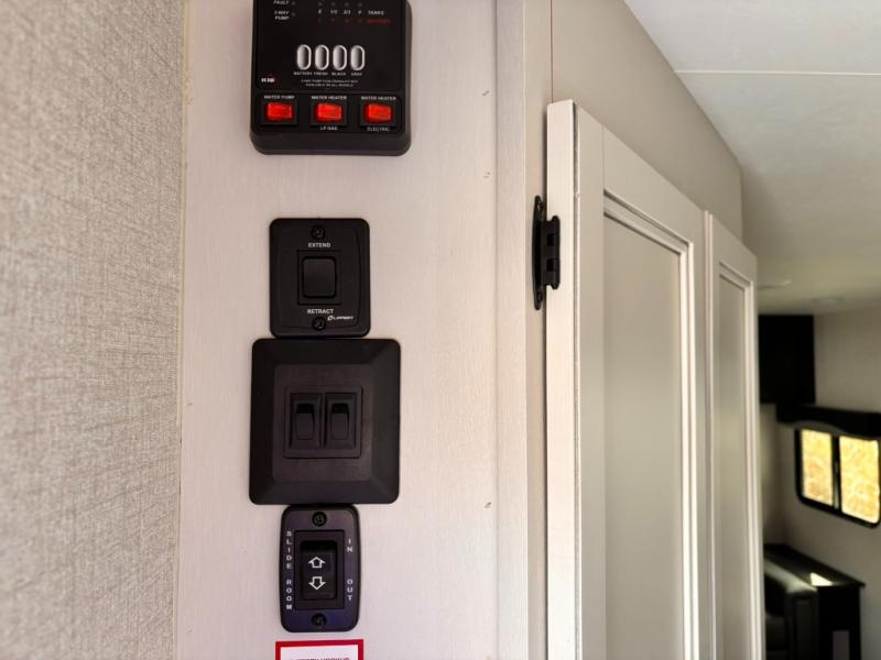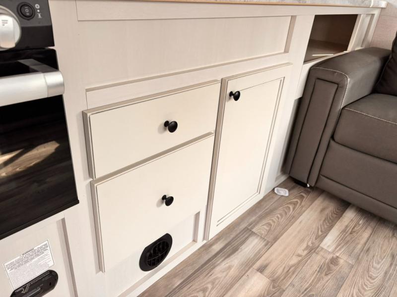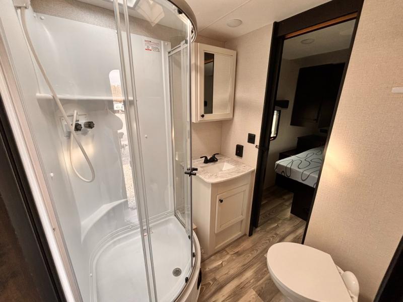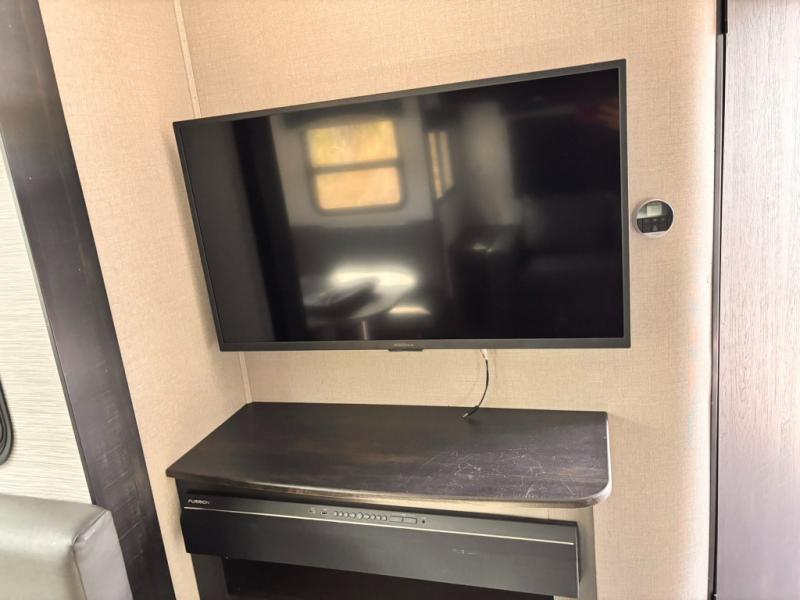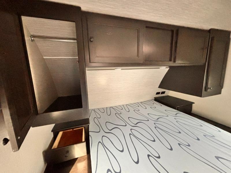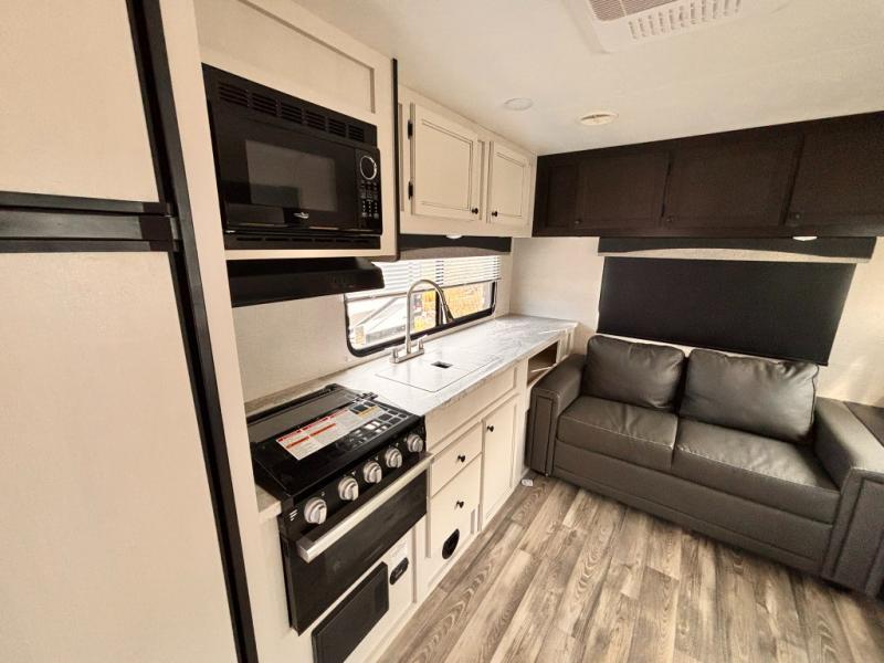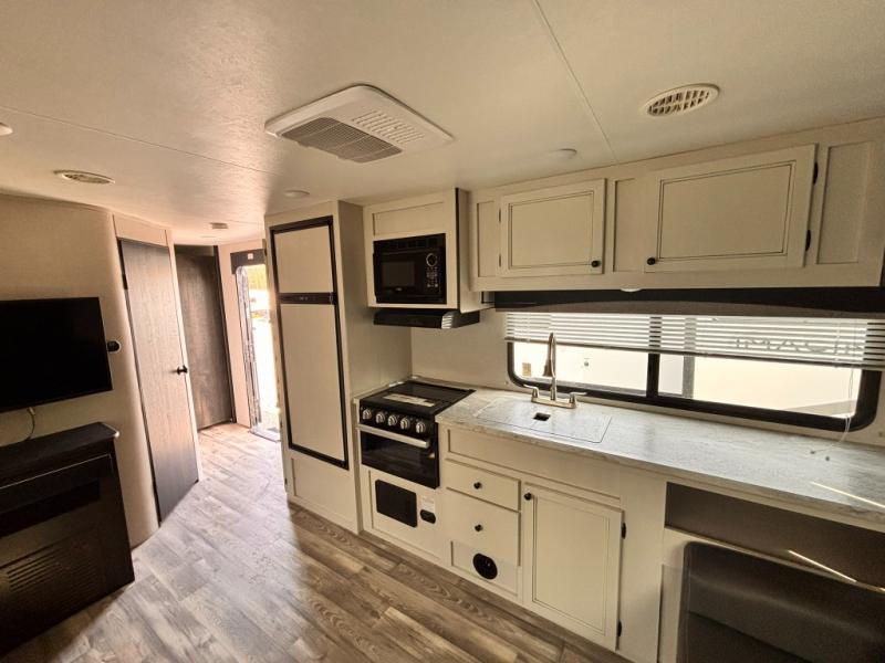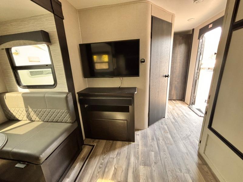 Enjoy a comfortable camping trip in this travel trailer! The rear tri-fold sofa has countertop space for you to set your bowl of popcorn on while you watch a movie on the LED HDTV at the entertainment center. Prepare your best meals with the three burner cooktop and 17" oven then enjoy them at the booth dinette slide which can also transform into an extra sleeping space. The dual entry bathroom has a radius shower to freshen up in each morning and leads directly into the front private bedroom which has a queen bed with underbed drawers, wardrobes on either side of the bed, and a laundry chute to keep your dirty clothes out of the way!