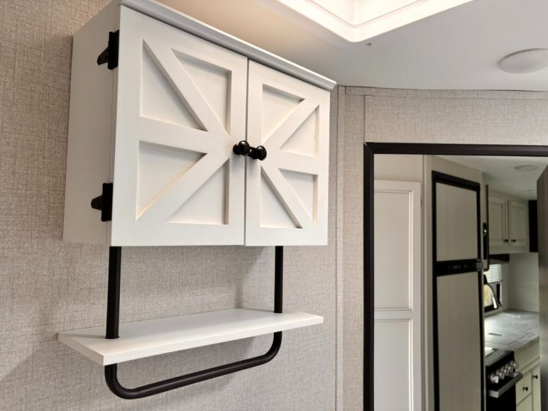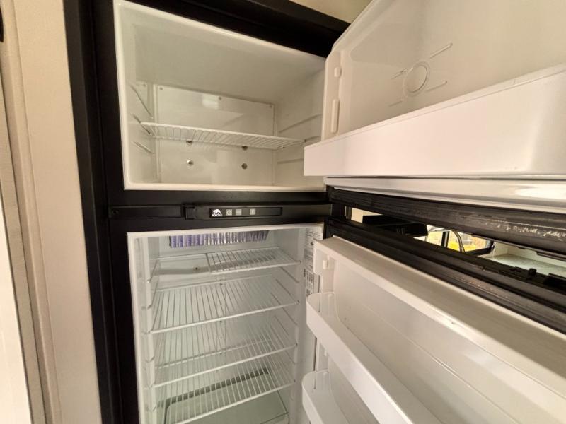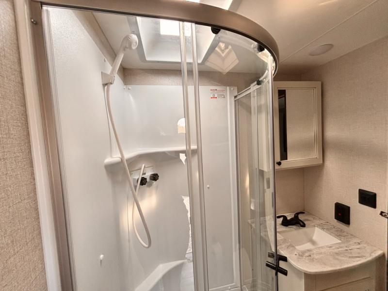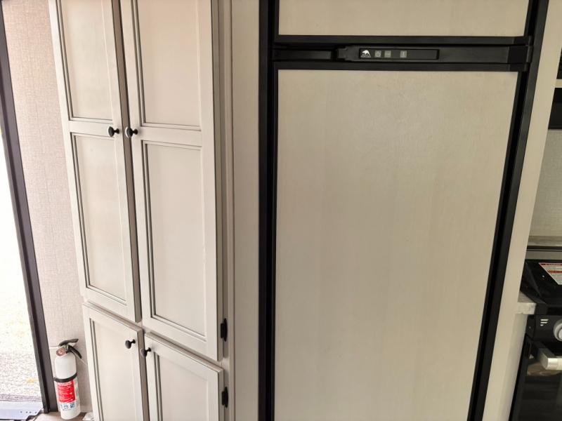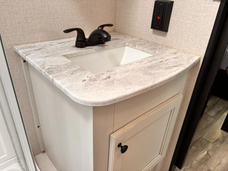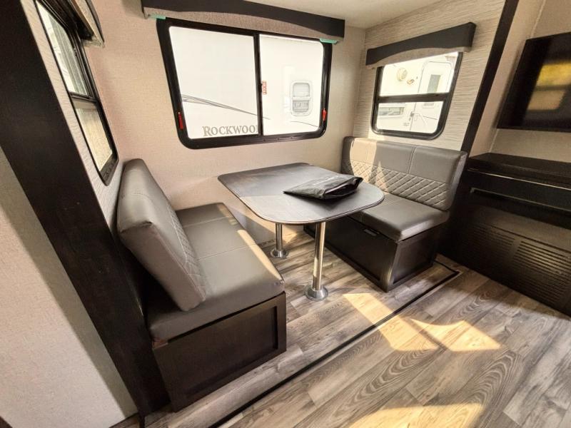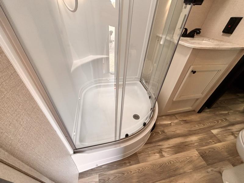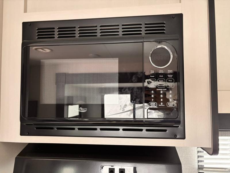 Enjoy a comfortable camping trip in this travel trailer! The rear tri-fold sofa has countertop space for you to set your bowl of popcorn on while you watch a movie on the LED HDTV at the entertainment center. Prepare your best meals with the three burner cooktop and 17" oven then enjoy them at the booth dinette slide which can also transform into an extra sleeping space. The dual entry bathroom has a radius shower to freshen up in each morning and leads directly into the front private bedroom which has a queen bed with underbed drawers, wardrobes on either side of the bed, and a laundry chute to keep your dirty clothes out of the way!