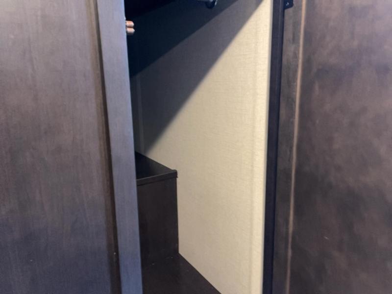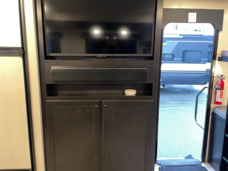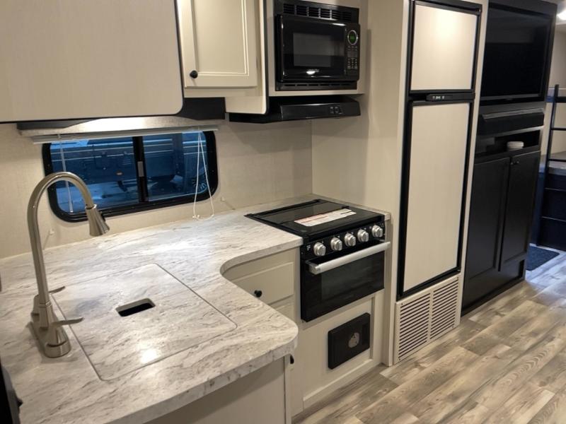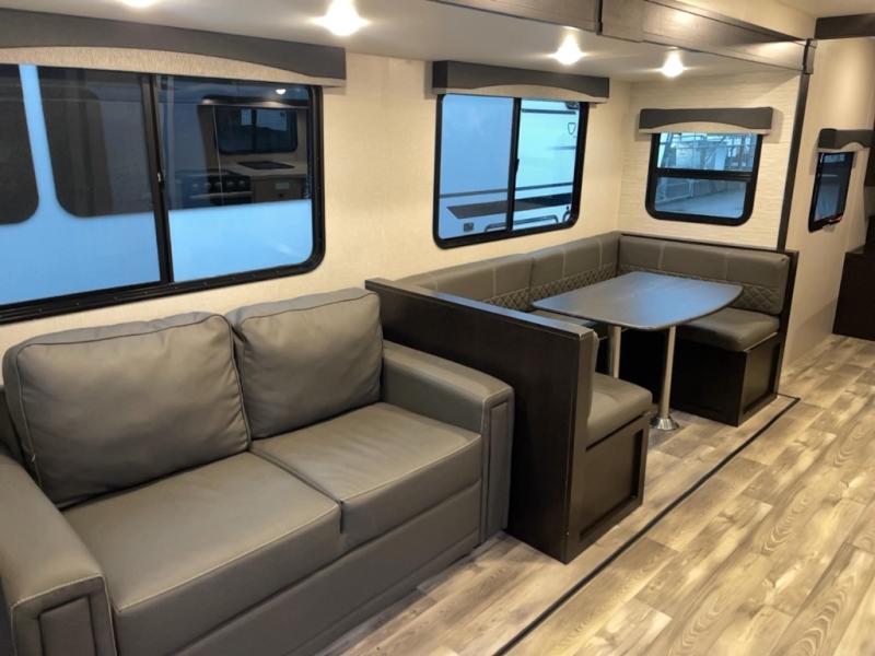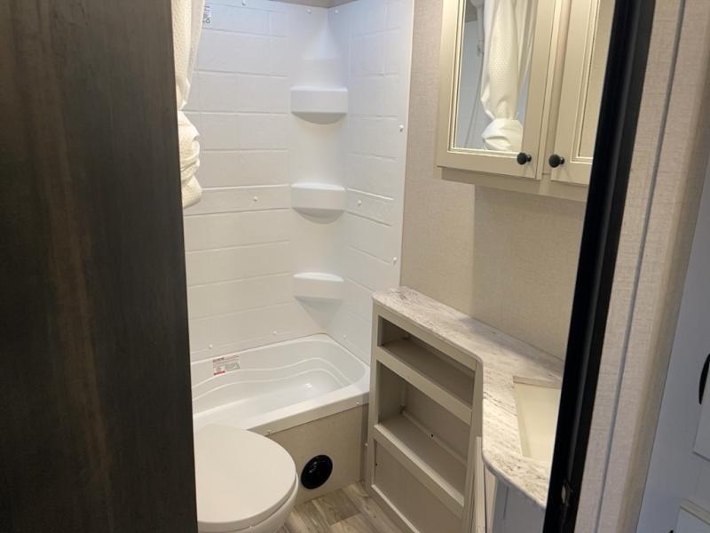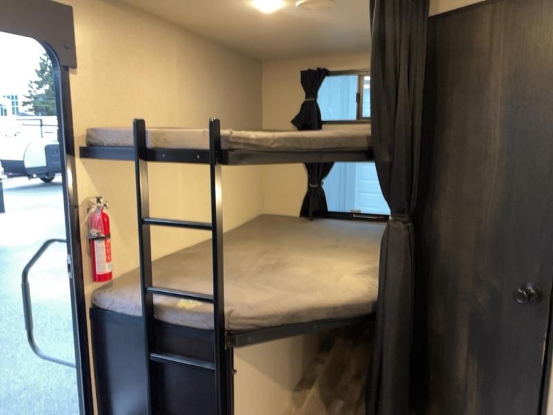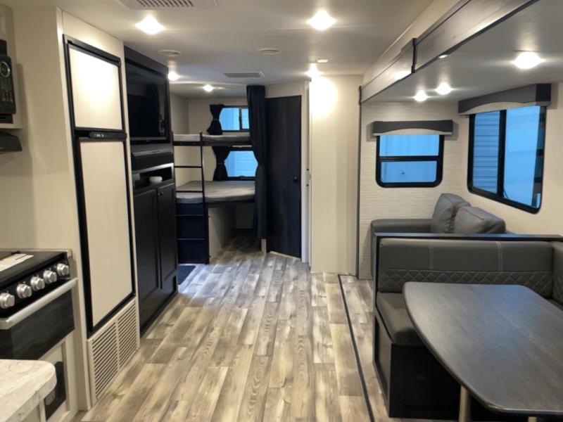 There is lots to love with this travel trailer! From the rear corner set of double over double bunk beds that has storage under the lower bunk to the front private bedroom that has a queen bed with drawers underneath, wardrobes on either side of it, and a laundry chute to keep your dirty clothes out of the way. The U-shaped dinette offers a comfortable place to enjoy your meals, play games, and even transform into an extra sleeping space. The tri-fold sofa can also transform into a sleeping space after you have watched a movie with the LED HDTV at the entertainment center. Everyone will stay squeaky clean with the tub in the rear corner bathroom too!