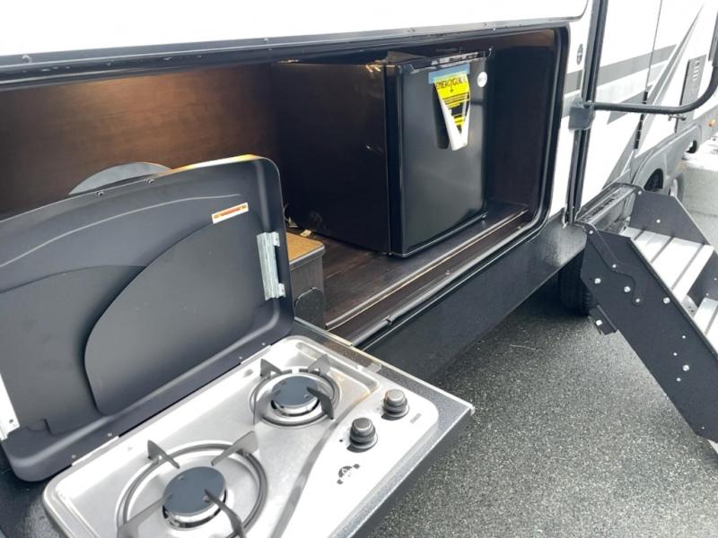 Each one of these Highland Ridge RV Range Lite travel trailers maximize their interior space while staying lightweight thanks to the TuffShell fiberglass walls! The extra-deep slides with residential floors create more walking around space, and the vinyl furniture, no floor heat registers, and residential vinyl flooring throughout makes them kid and pet friendly. A few construction features you will appreciate include a fully-walkable roof, a thermal seal which means the underbelly is enclosed, heated, and insulated, and a fully insulated roof with a PVC roofing membrane. Plus, there is an exterior grill hookup quick connect port, self-adjusting electric brakes to help you safely arrive, and an oversized pass-through storage area with motion lighting. Come find your favorite one today!