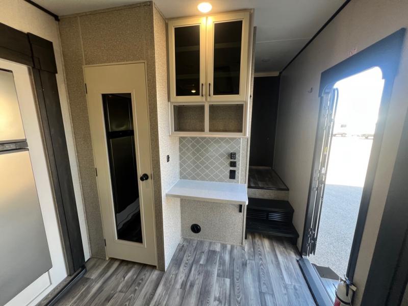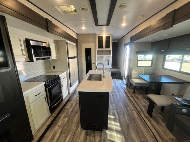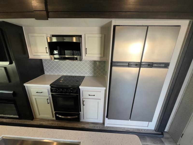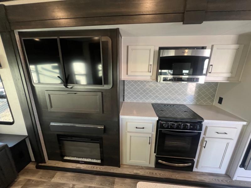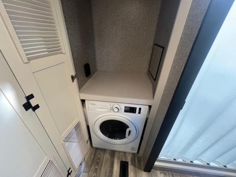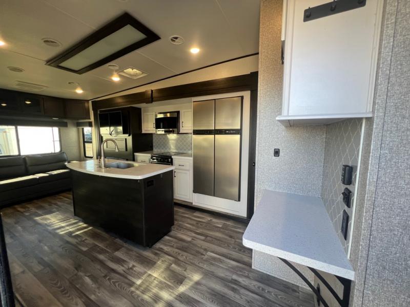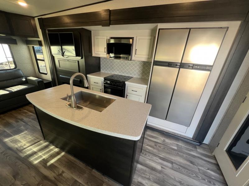 This fifth wheel has everything you need for a comfortable camping trip! From the rear living area with a tri-fold sofa and theater seating across from an entertainment center with a 50" LED HDTV and a fireplace to the front private bedroom with a queen that has a power base, a wardrobe slide, and an entrance into the dual entry bathroom. You can even add the optional washer and dryer to the bathroom for clean clothes throughout your entire trip. If you need to get a little work done while you're away then grab a snack from the large pantry and work at the desk in the kitchen. The kitchen island makes meal prepping and clean up easier, and you can enjoy your meals and card games at the table and chairs.