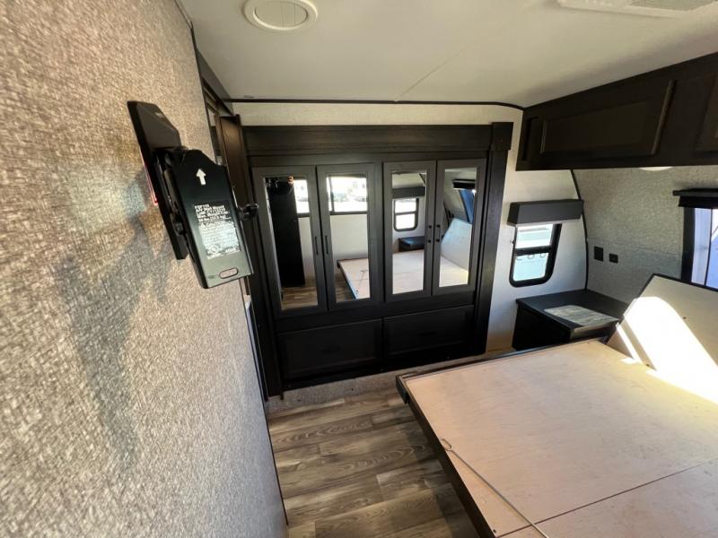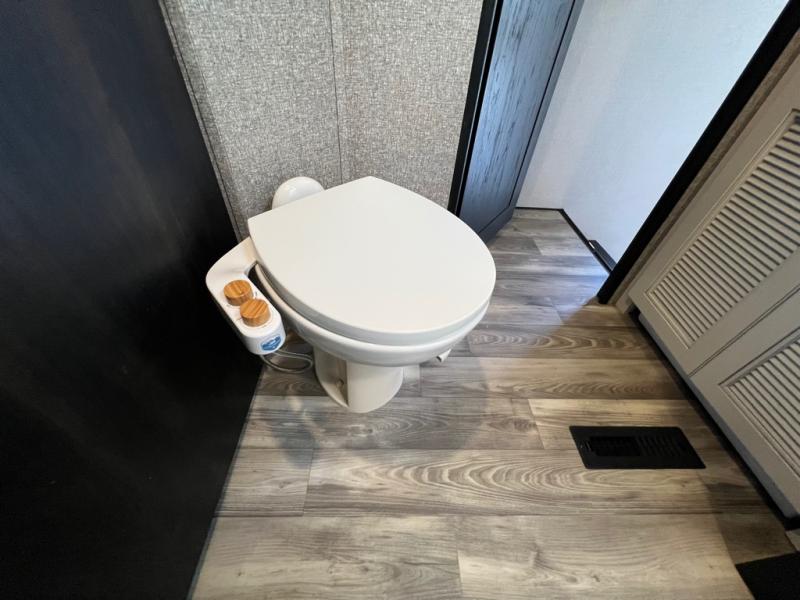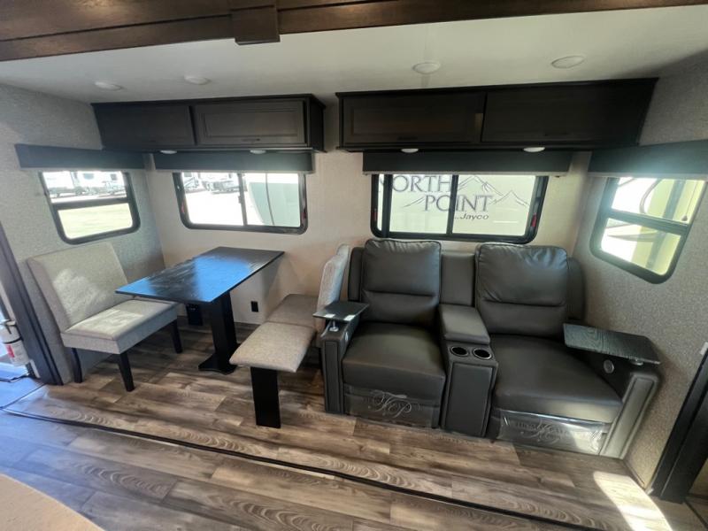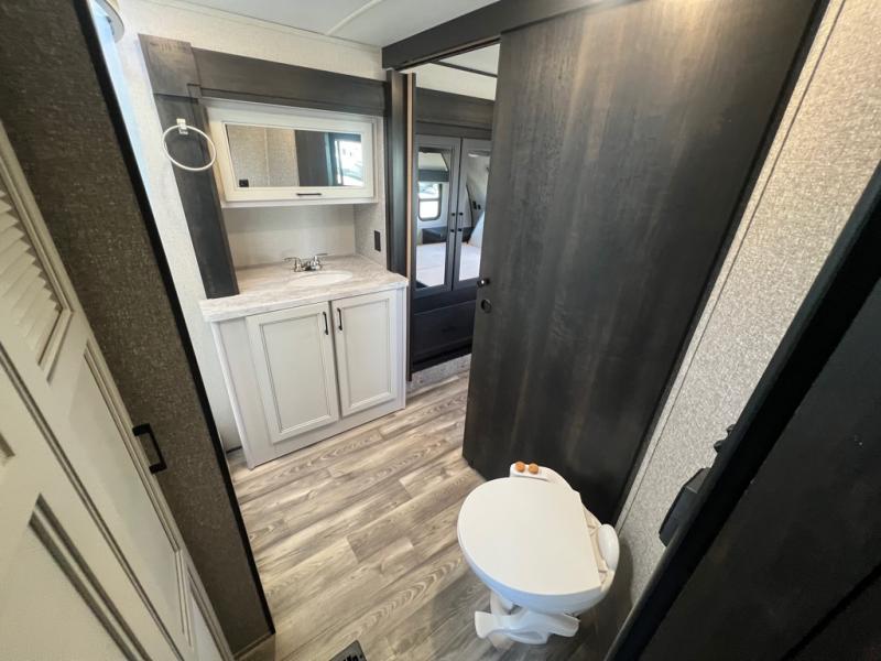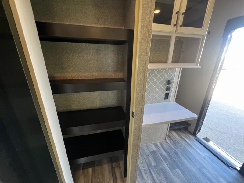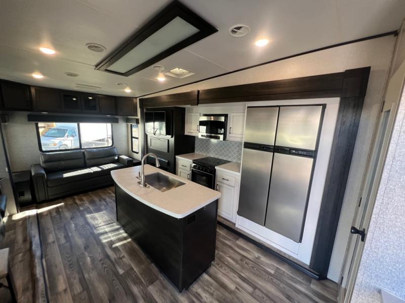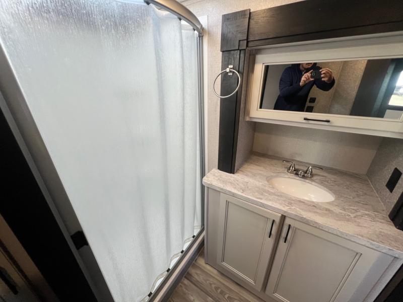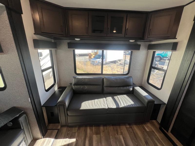 This fifth wheel has everything you need for a comfortable camping trip! From the rear living area with a tri-fold sofa and theater seating across from an entertainment center with a 50" LED HDTV and a fireplace to the front private bedroom with a queen that has a power base, a wardrobe slide, and an entrance into the dual entry bathroom. You can even add the optional washer and dryer to the bathroom for clean clothes throughout your entire trip. If you need to get a little work done while you're away then grab a snack from the large pantry and work at the desk in the kitchen. The kitchen island makes meal prepping and clean up easier, and you can enjoy your meals and card games at the table and chairs.