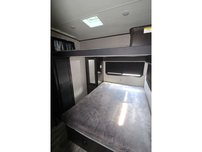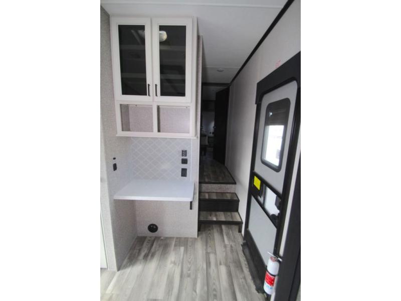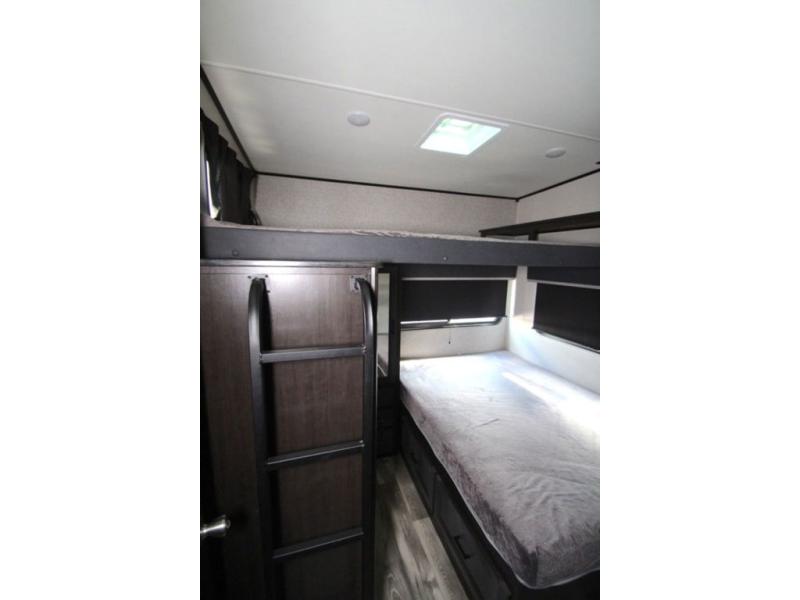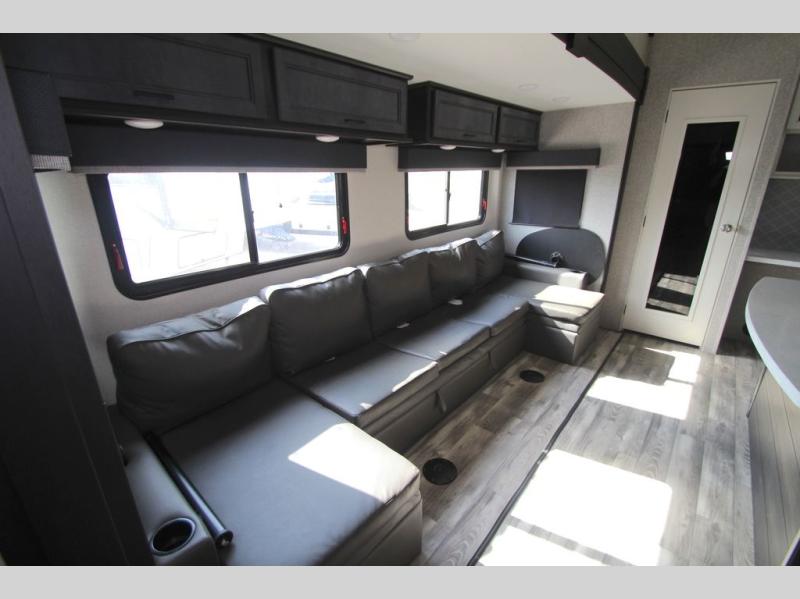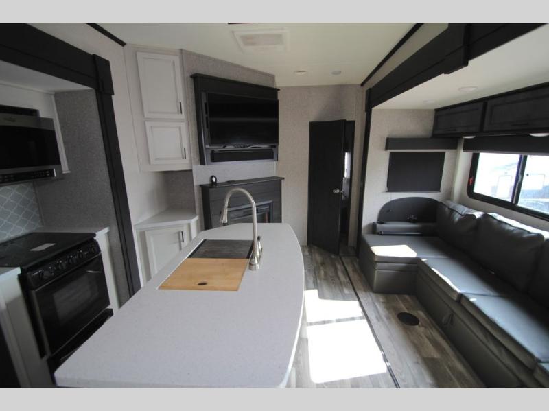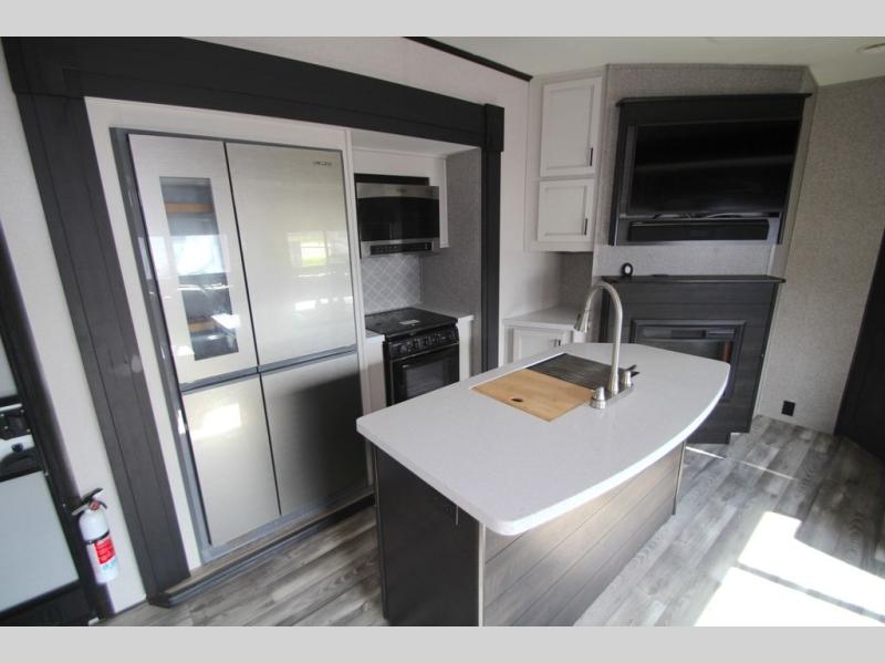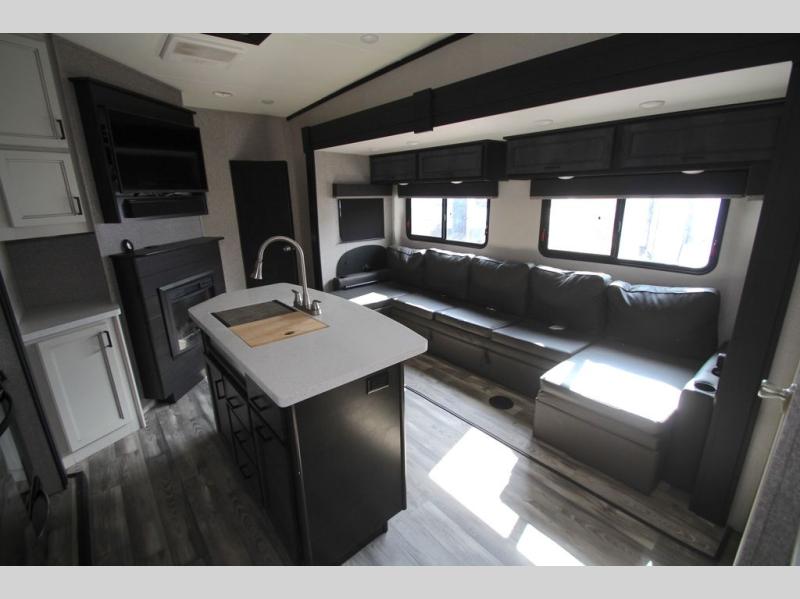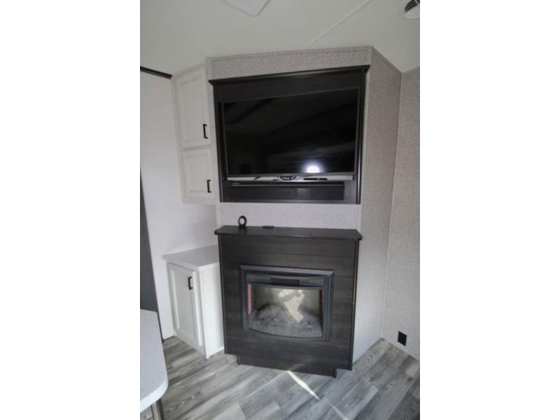 You won't believe all that this fifth wheel has to offer! From the rear private bunkhouse with a bunk bed above a bottom bed and a half bathroom to the front private bedroom with a queen bed that has a power base, a wardrobe slide, and an entrance into the dual entry bathroom which even has an area to add an optional washer and dryer. If you need to get some work done while you're at the campsite then grab a snack from the large pantry and sit at the desk. The chef can prepare their best meals either indoors with the three burner cooktop or breathe in some fresh air while cooking at the outside kitchen. There is even a BBQ hookup and outside TV hookup area underneath the two power awnings. Enjoy your meals and play card games at the U-lounge dinette slide while a fire roars in the electric fireplace or a movie plays on the 50" LED HDTV!