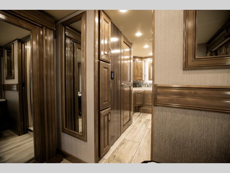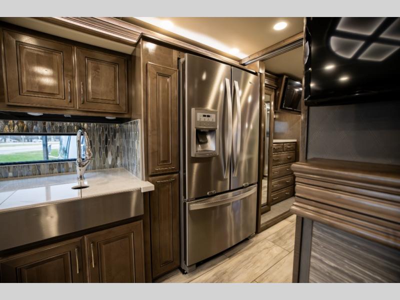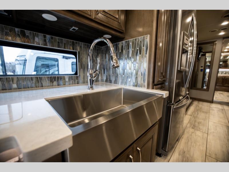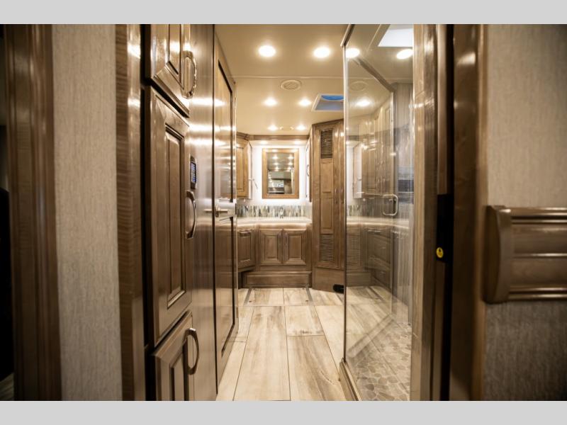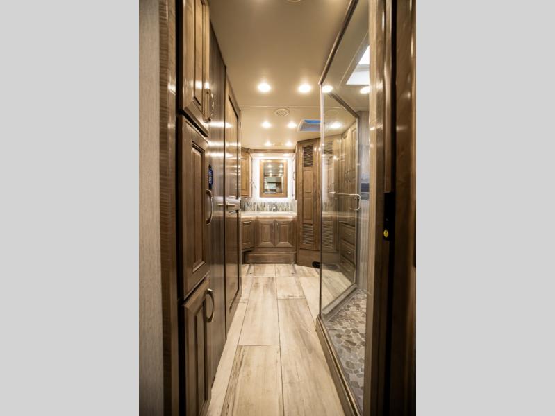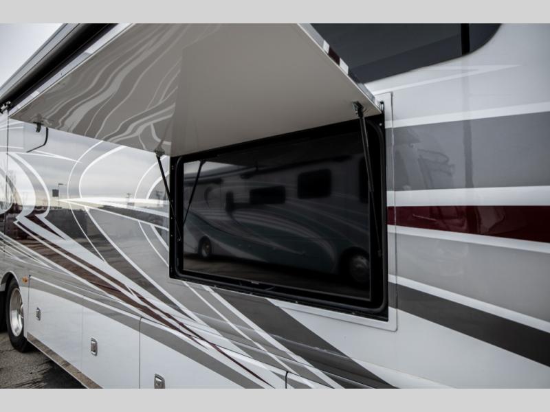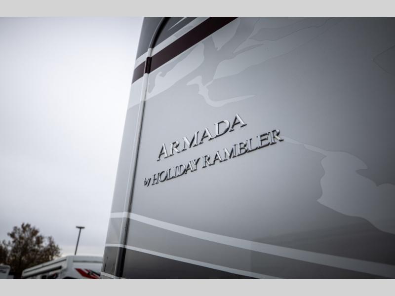 If you think glamping is the way to go, you're going to have to see what the Holiday Rambler Armada Class A diesel motorhome has in store for you! The Armada has been constructed with a Powerlock system, a Dryseal edge coating, a vacu-bond aluminum-framed constructed roof, sidewalls, and floor, a premium gel exterior vetrosina fiberglass skin, and a Titan Bridge chassis construction. The exterior service station includes a water pump switch, exterior shower, black tank flush, city water hookup, towel holder, and drainage valves. Then come the electrical features which will knock your socks off! There is a King universal stationary satellite, LED OptiView instrument panel, color backup monitor, 10.2" Magnadyne stereo touchscreen w/AM/FM/CD/DVD/Bluetooth/Navigation/APP Store/Wi-Fi, a Safe-T-View camera system, and 8,000W Onan Quiet diesel generator.