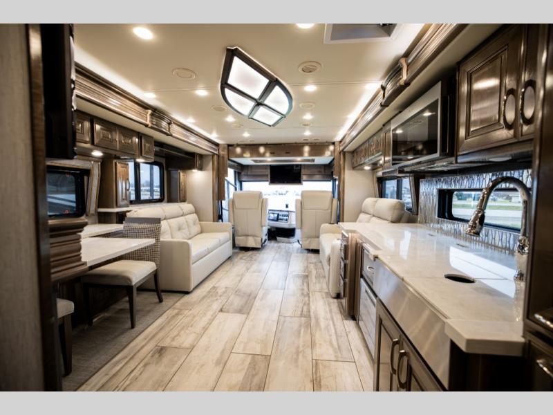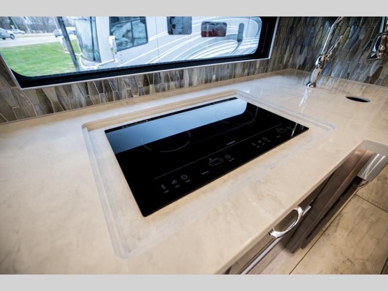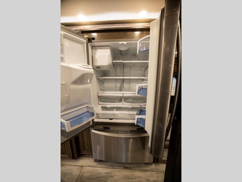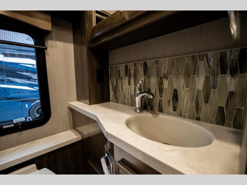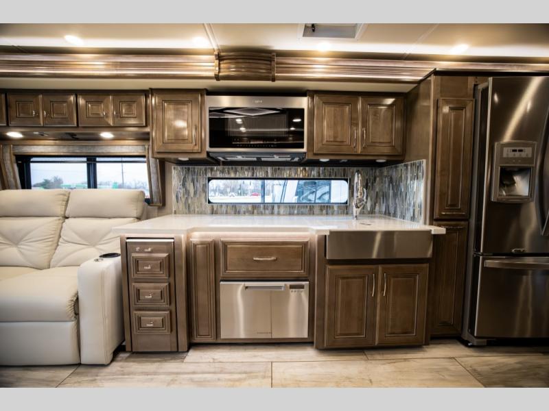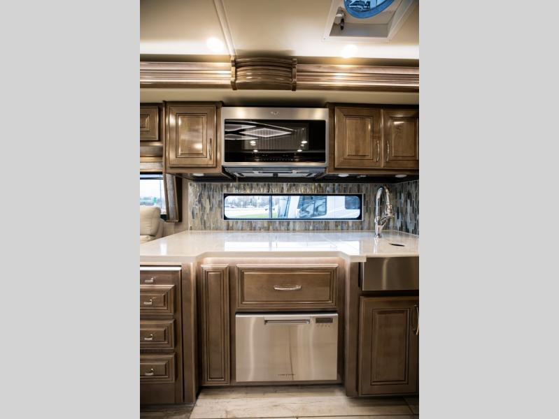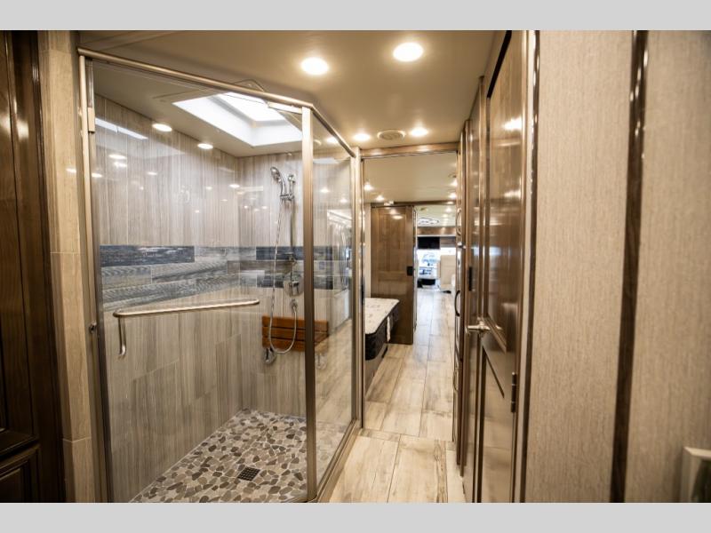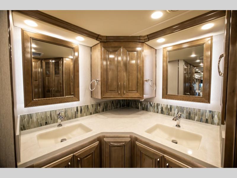 If you think glamping is the way to go, you're going to have to see what the Holiday Rambler Armada Class A diesel motorhome has in store for you! The Armada has been constructed with a Powerlock system, a Dryseal edge coating, a vacu-bond aluminum-framed constructed roof, sidewalls, and floor, a premium gel exterior vetrosina fiberglass skin, and a Titan Bridge chassis construction. The exterior service station includes a water pump switch, exterior shower, black tank flush, city water hookup, towel holder, and drainage valves. Then come the electrical features which will knock your socks off! There is a King universal stationary satellite, LED OptiView instrument panel, color backup monitor, 10.2" Magnadyne stereo touchscreen w/AM/FM/CD/DVD/Bluetooth/Navigation/APP Store/Wi-Fi, a Safe-T-View camera system, and 8,000W Onan Quiet diesel generator.