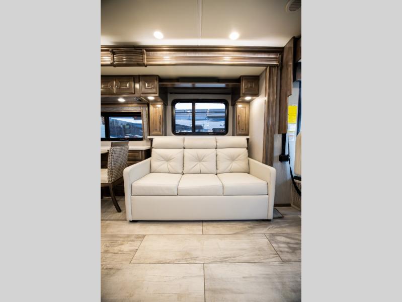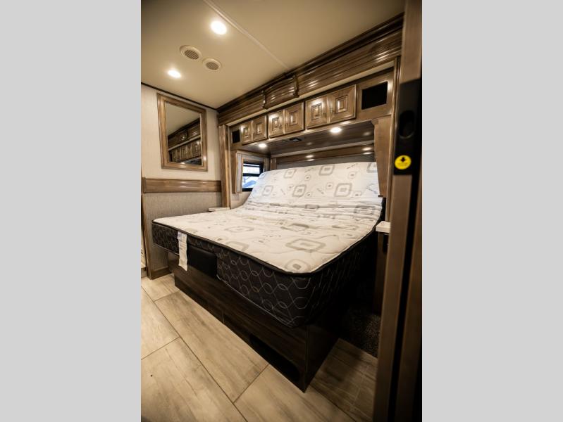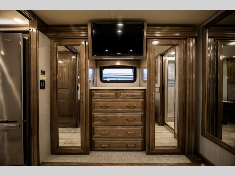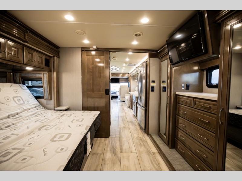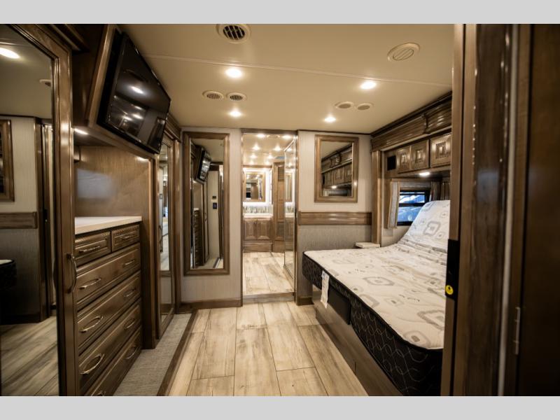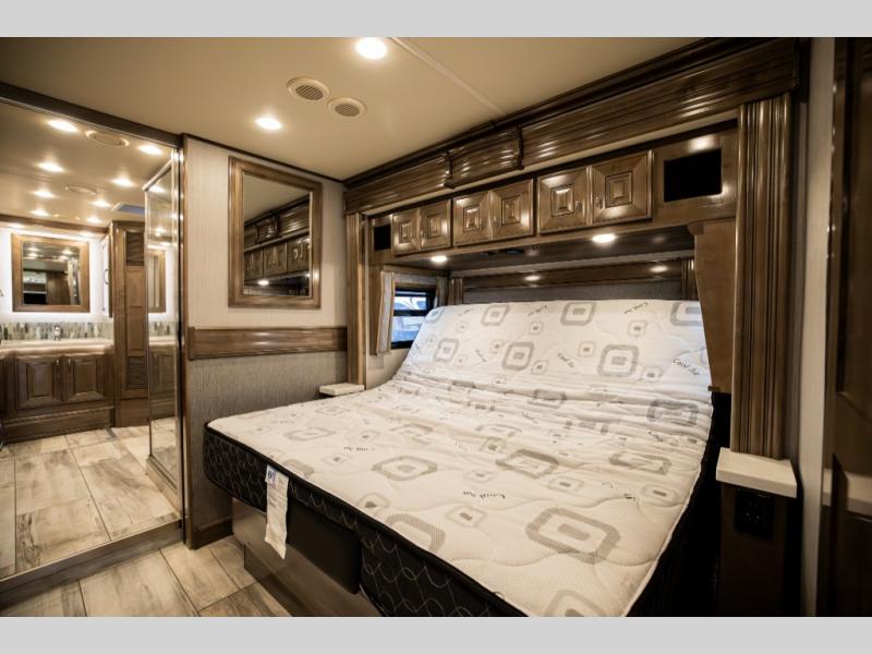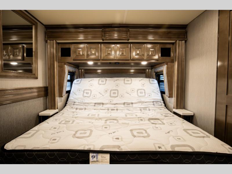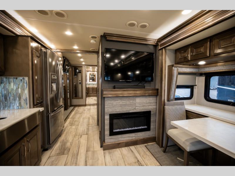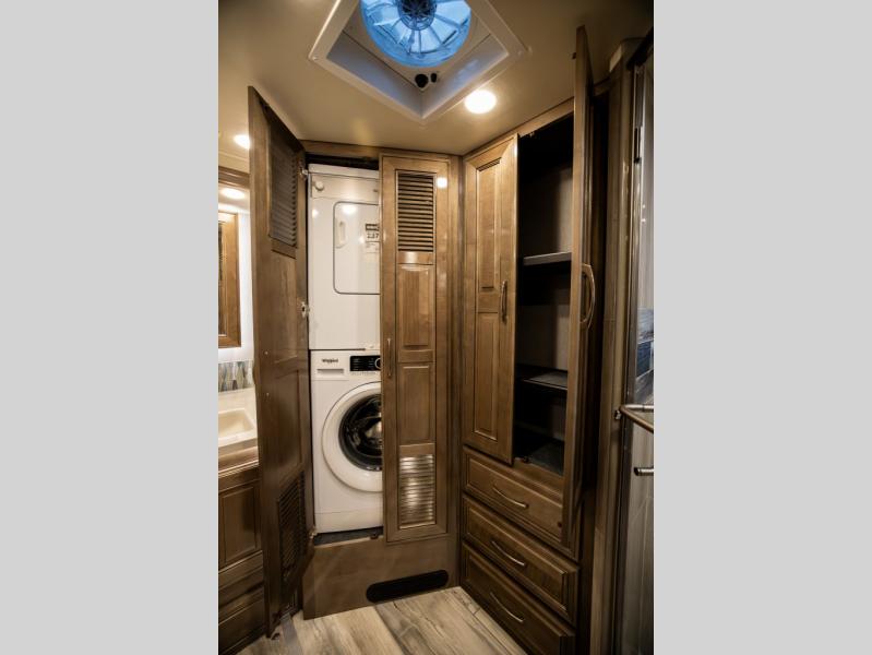 You are going to love this Armada Class A diesel motorhome! As the owners, you'll enjoy a magnificent oasis in the back of this coach with a high-class master suite. The bedroom is connected to a spacious master bathroom that has a dual-sink vanity, a separated toilet room within the bathroom, a 56" x 38" tile shower with seat, two linen closets, plenty of storage for toiletries, and a washer/dryer. Now isn't that amazing? The bedroom is also filled with comfort as it contains an Encore Series king bed, opposing slides, a 32" LED TV, two wardrobes, and a dresser. Not only is there a full bathroom back in the master suite, but there is an additional half bath out in the main living area which will be useful for anyone else traveling with you. The living area is ultra comfortable with its 67" sofa sleeper with pull-out full bed and ottomans, 64" loveseat with drawer, free-standing dinette with credenza, fireplace, and 55" pop-up LED TV. There is even an additional TV above the cab.