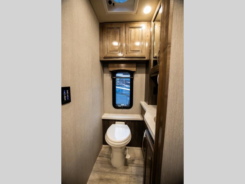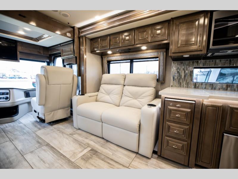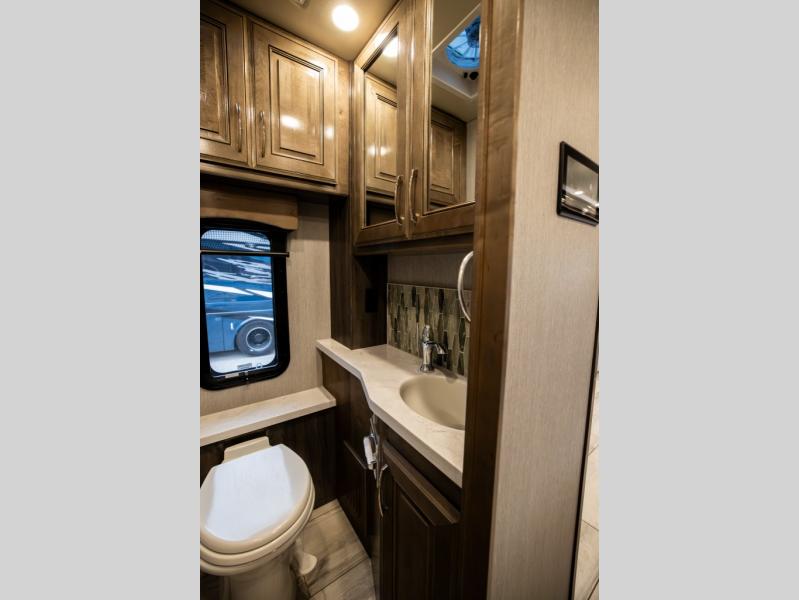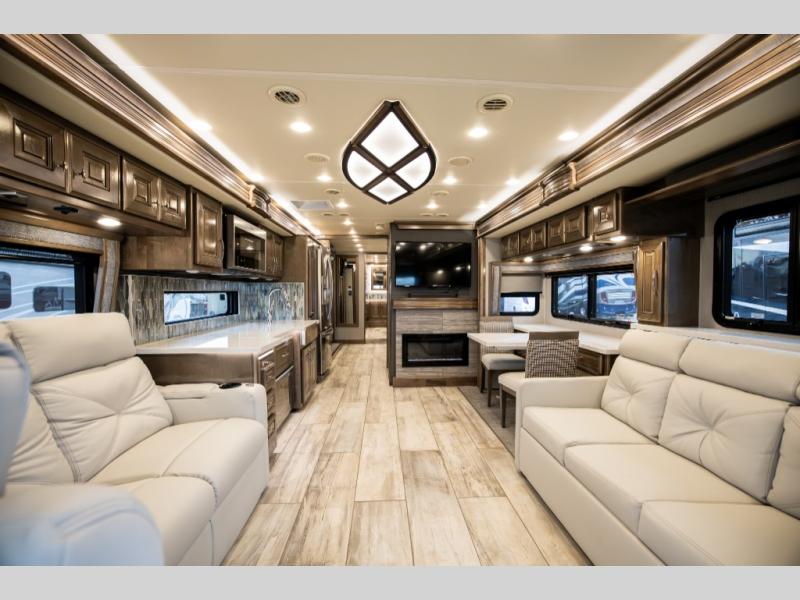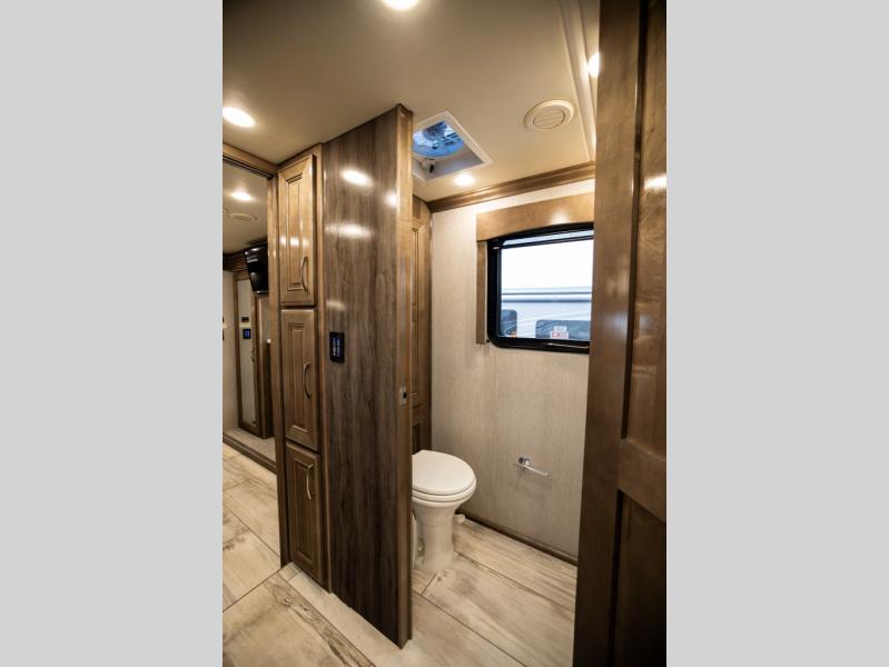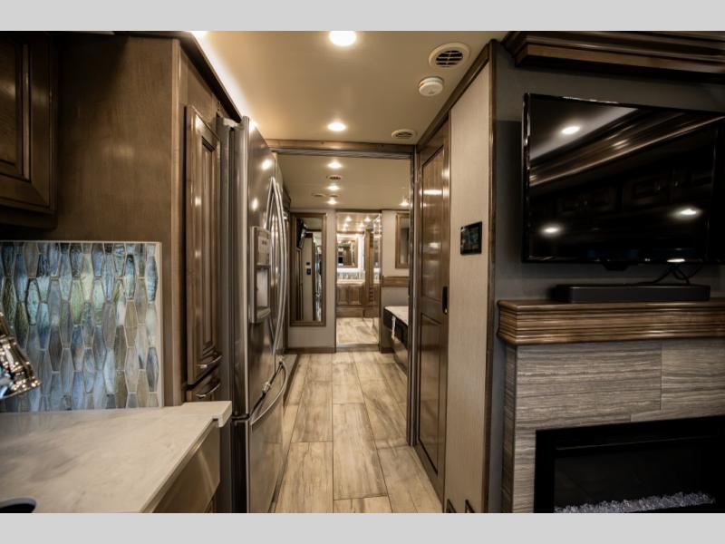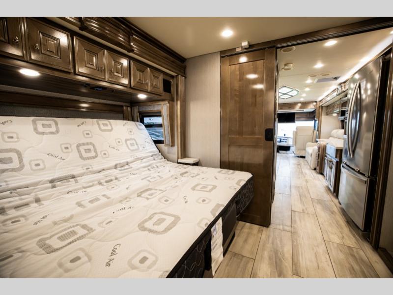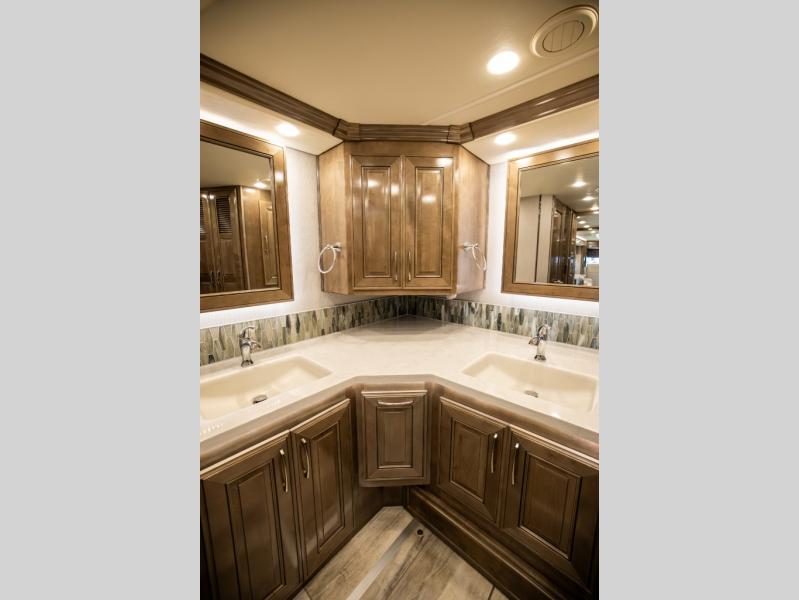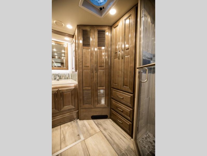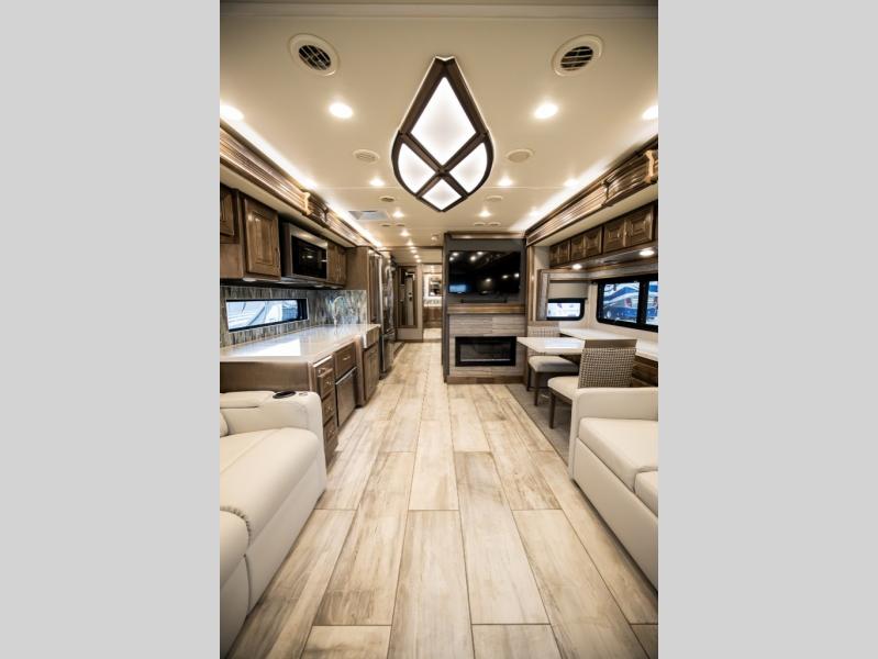 You are going to love this Armada Class A diesel motorhome! As the owners, you'll enjoy a magnificent oasis in the back of this coach with a high-class master suite. The bedroom is connected to a spacious master bathroom that has a dual-sink vanity, a separated toilet room within the bathroom, a 56" x 38" tile shower with seat, two linen closets, plenty of storage for toiletries, and a washer/dryer. Now isn't that amazing? The bedroom is also filled with comfort as it contains an Encore Series king bed, opposing slides, a 32" LED TV, two wardrobes, and a dresser. Not only is there a full bathroom back in the master suite, but there is an additional half bath out in the main living area which will be useful for anyone else traveling with you. The living area is ultra comfortable with its 67" sofa sleeper with pull-out full bed and ottomans, 64" loveseat with drawer, free-standing dinette with credenza, fireplace, and 55" pop-up LED TV. There is even an additional TV above the cab.