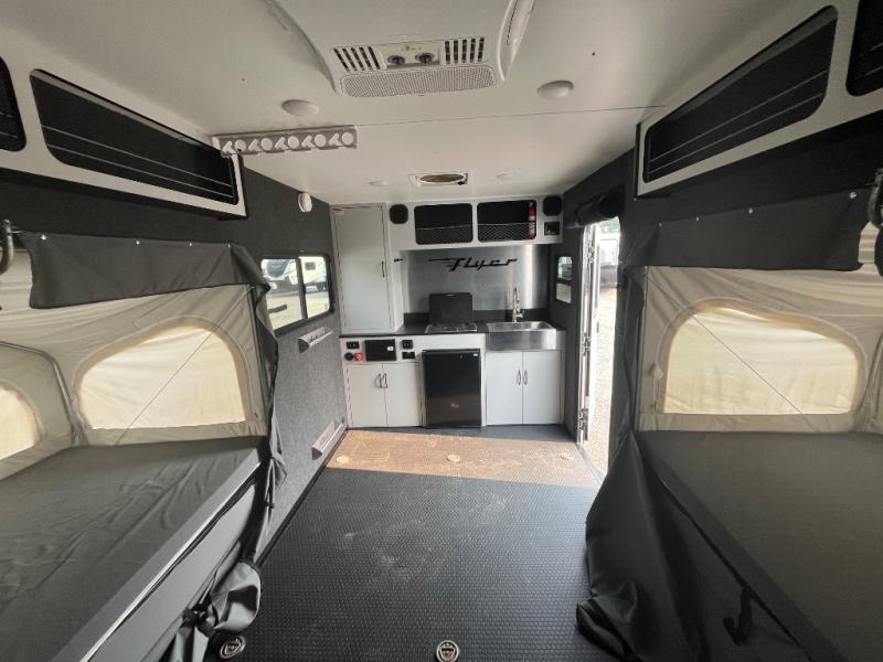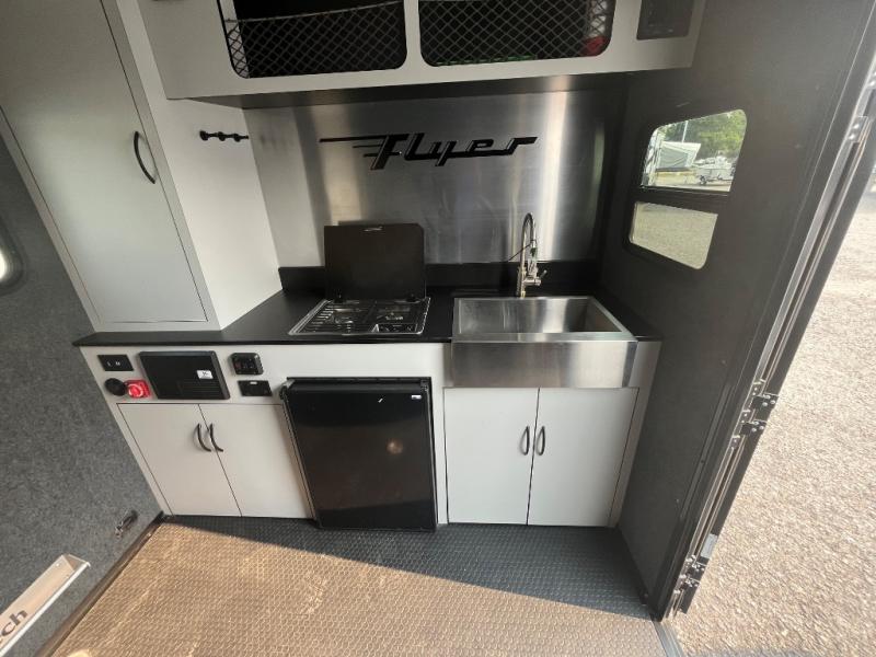 This Flyer expandable toy hauler is the biggest and the best model offered in the Flyer line-up! Not only does this toy hauler provide you with a spacious and versatile interior, but it also gives you a desirable cargo space so that you can bring along some toys for the adventure. This expandable comes standard with one tip-out bed, but you can easily add on the second optional tip-out bed which will add lots of extra room for sleeping and relaxing. The other feature found on this Flyer that is going to make your trips truly effortless is the front kitchen that comes with a two-burner stainless steel cooktop, a 3.1-cubic foot refrigerator, a large farmhouse sink, and an 8.5-gallon fresh water tank. This expandable toy hauler has a dry weight that ranges from 2,475-2,750 LBS and a net carrying capacity that ranges from 2,450-2,725 LBS, so come check it out!