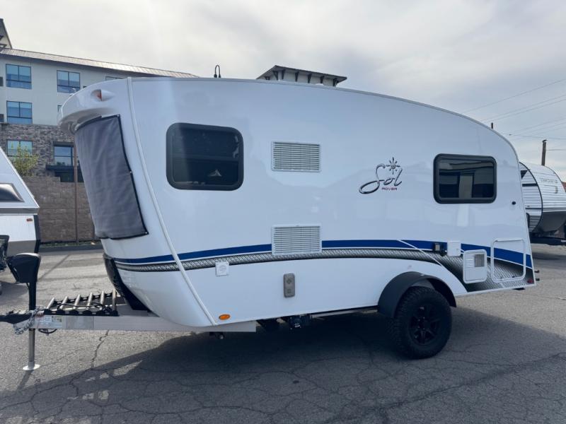 With any Sol travel trailer by inTech RV you will find strong, durable construction consisting of lightweight aluminum that is easier to tow and resists rust, water, and dents. The Tilt-Forward Design creates more space inside so you can stretch out, and the panoramic windshield gives a great view of the mountains, ocean, or forest! The elegant interior features tinted windows with shades, Infinity woven flooring, and a stainless steel cooktop and microwave. You will stay comfortable year around since these models include a 13.5 BTU A/C and a 16K BTU furnace. The optional Rover Package can also be added that features rugged decals, off-road tires with a 3" lift, two different color choices to choose from, plus more!