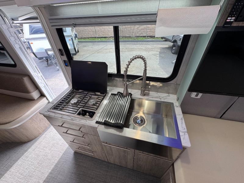 You will love the added space in this travel trailer that can sleep four people each night. There is a queen-size bed in the back, plus a convertible U-shaped dinette up front for the kids or your camping friends. The kitchen includes a two burner stainless steel cooktop, a stainless steel microwave, and a 3.7 3-way refrigerator for your perishables. You can also add the optional 10' awning outside for shade as you visit with loved ones!