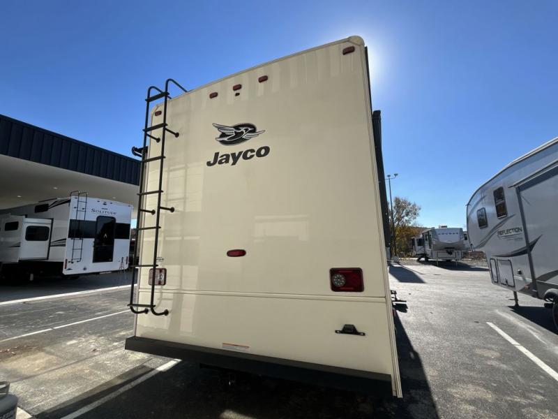 When you enjoy the drive as much as the destination, you know you made the correct choice for your adventures! The driver and passenger seats also swivel to create more seating when you are parked. And the Jayco-exclusive, easy operation legless dinette plus jack-knife sofa give everyone a place to relax and visit. You will also find sleeping space for five to six when you utilize the furniture and you choose the drop down overhead bunk option. The rear corner bedroom gives you a king bed, two wardrobes, and a full bathroom just a few steps away. The kitchen offers full amenities including a countertop extension, and you might like to choose the 12 cu. ft. refrigerator option. Don't forget about the outside entertainment center, and the 39" LED HD Smart Fire TV inside when you want to watch a show, a movie or the big game.