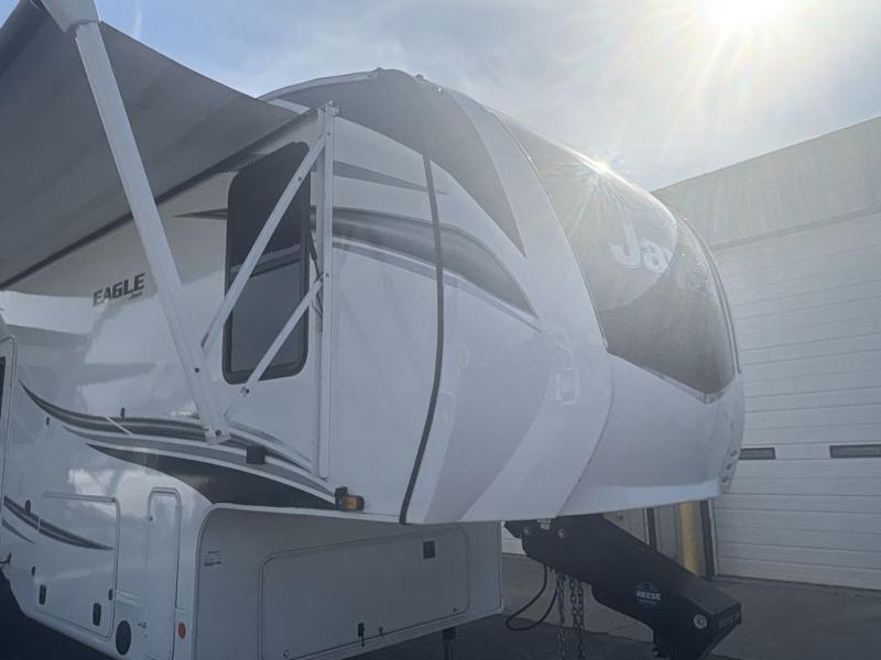 With any Eagle fifth wheel or travel trailer by Jayco you will appreciate durable construction materials, like the Magnum Tuff Roof and the Stonghold VBL laminated walls. The JAYCOMMAND Smart RV system puts you in control of your RV's function, and the 4 Star Handling Package will provide smooth towing from home to camp. Each model features Climate Shield zero-degree tested weather protection and the industry-exclusive HELIX cooling system that features two 15,000 BTU Whisper Quiet A/C's to keep you comfortable year around. Some of the exterior conveniences you are sure to love are the fully enclosed, LED-lit universal docking station, the pass-through storage with Slam-Latch baggage doors, and the painted fiberglass front cap with built-in specialty LED lighting. The Eagle fifth wheels and travel trailers are designed to make you feel at home with solid hardwood slide fascia, residential vinyl flooring, bathroom tile backsplash, and plenty of storage for all your belongings.