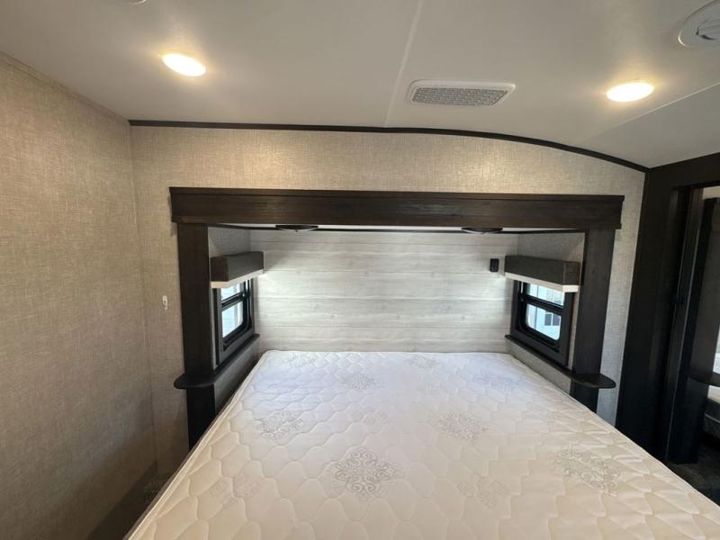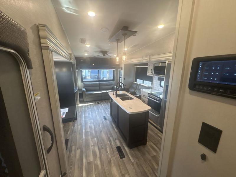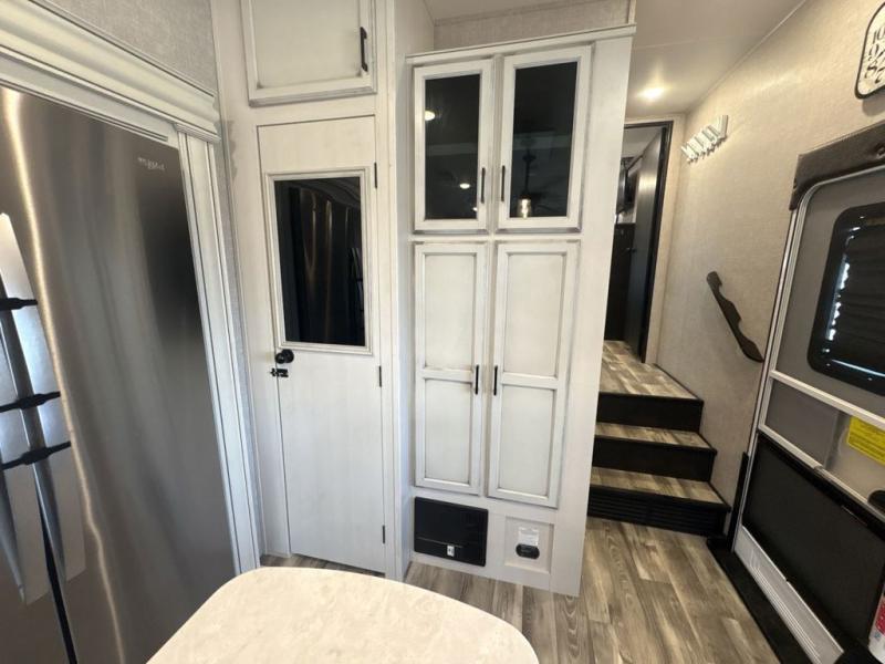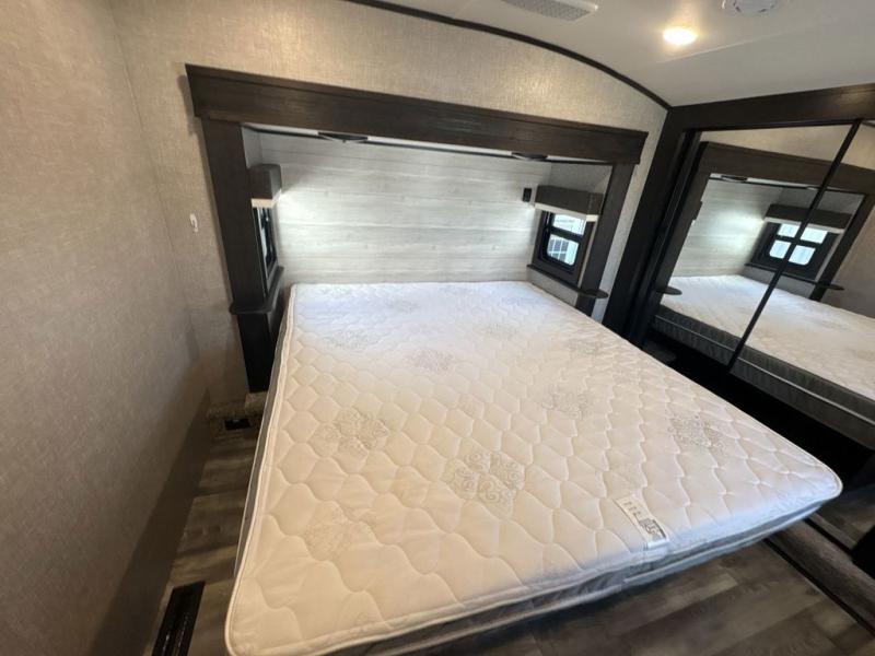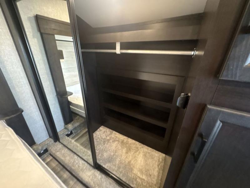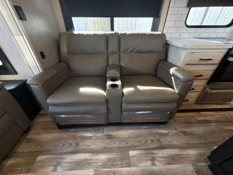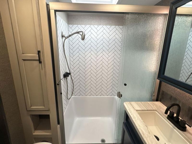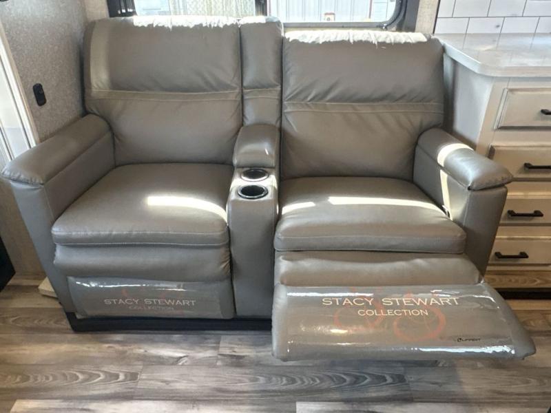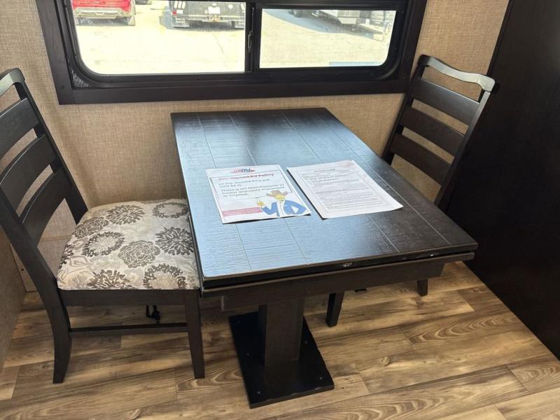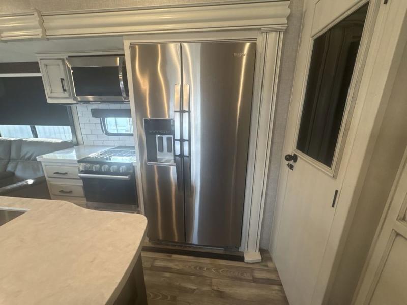 Trips to the lake are made luxurious in this spacious fifth wheel for four! The rear living area includes a tri-fold sofa, a ceiling fan to keep cool, plus a theater seat across from the entertainment center and fireplace. You will love the walk-in pantry and 21 cu. ft. residential refrigerator to store food for the whole week, plus there is a convenient coat closet/pantry for even more storage. The full bath features a shower with a seat, a linen closet, plus a medicine cabinet to keep all your necessities organized. You will feel right at home in the front private bedroom with its queen bed slide out, a chest with a TV option, plus a walk-in closet with shelves and washer and dryer prep. You can't go wrong with this fifth wheel!