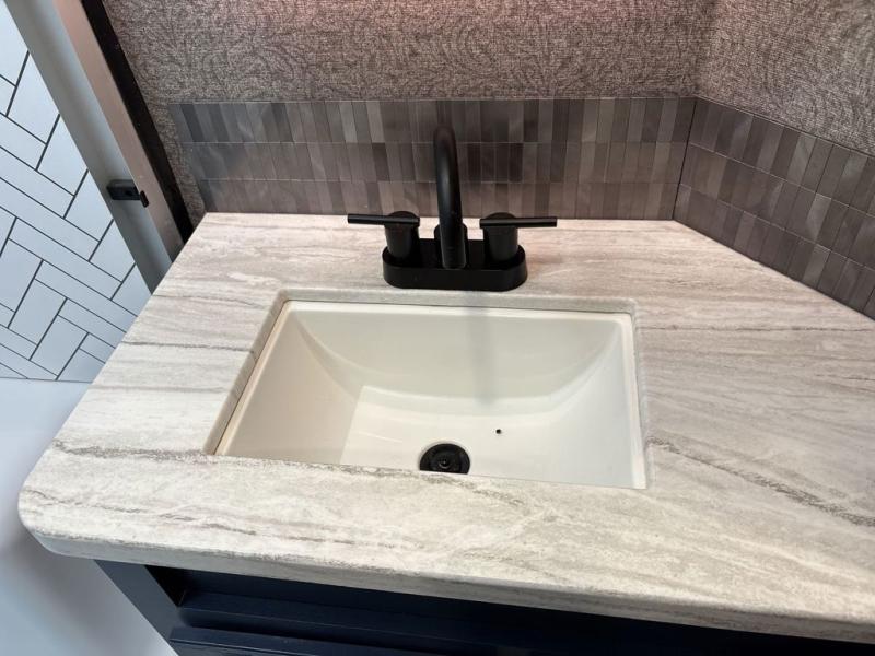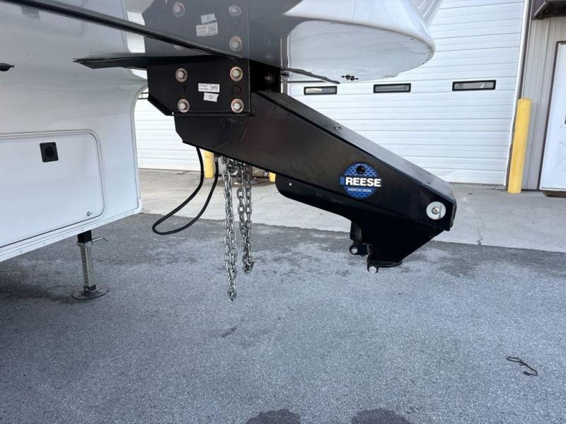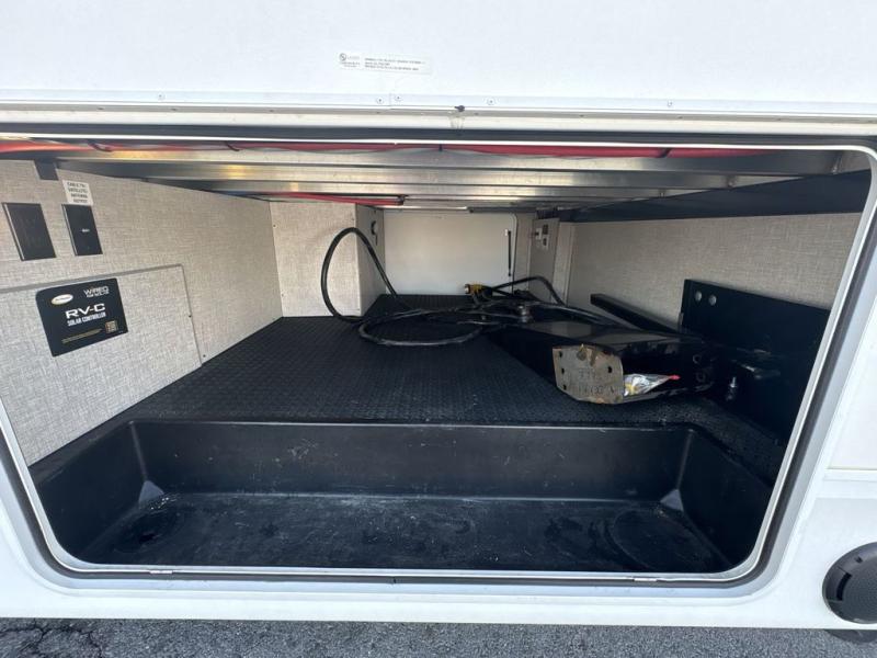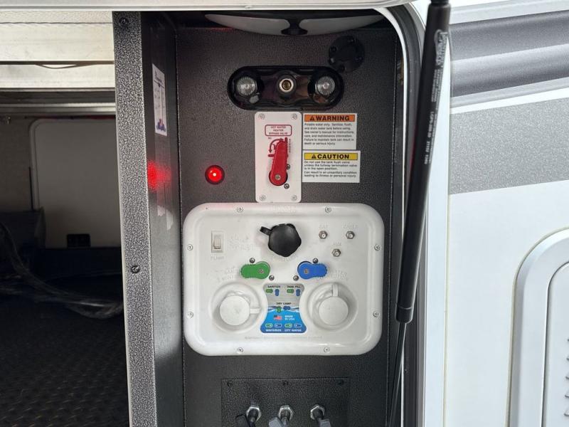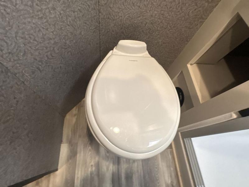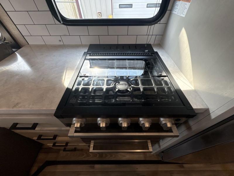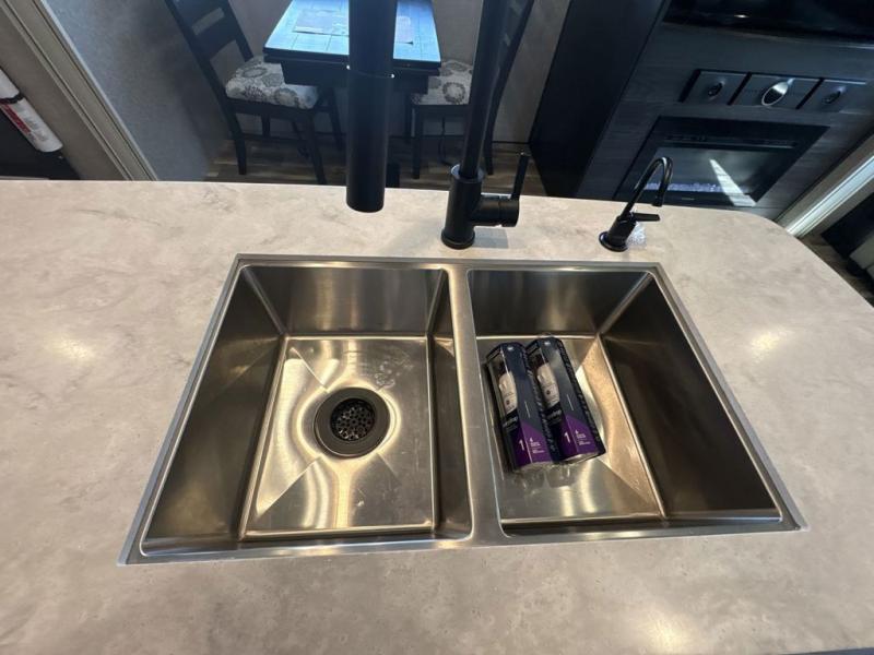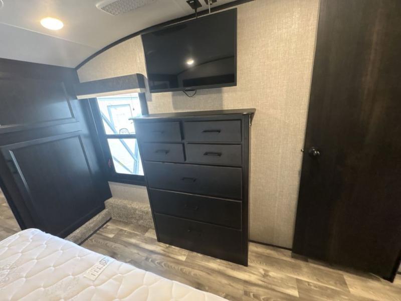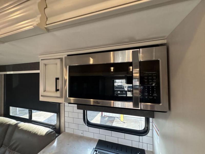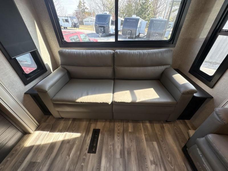 Trips to the lake are made luxurious in this spacious fifth wheel for four! The rear living area includes a tri-fold sofa, a ceiling fan to keep cool, plus a theater seat across from the entertainment center and fireplace. You will love the walk-in pantry and 21 cu. ft. residential refrigerator to store food for the whole week, plus there is a convenient coat closet/pantry for even more storage. The full bath features a shower with a seat, a linen closet, plus a medicine cabinet to keep all your necessities organized. You will feel right at home in the front private bedroom with its queen bed slide out, a chest with a TV option, plus a walk-in closet with shelves and washer and dryer prep. You can't go wrong with this fifth wheel!