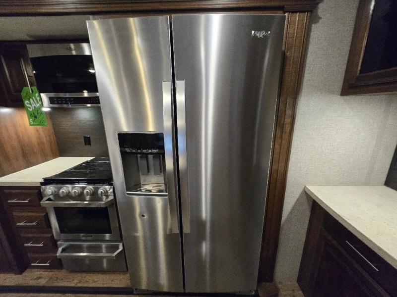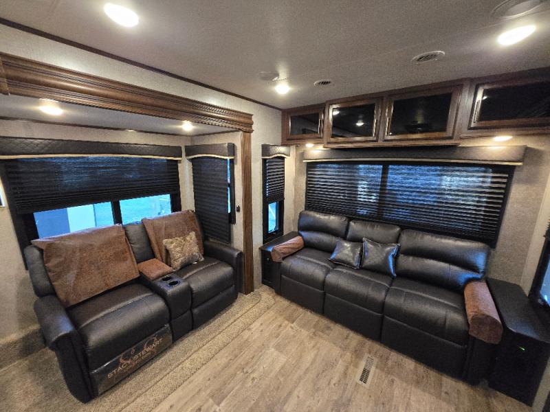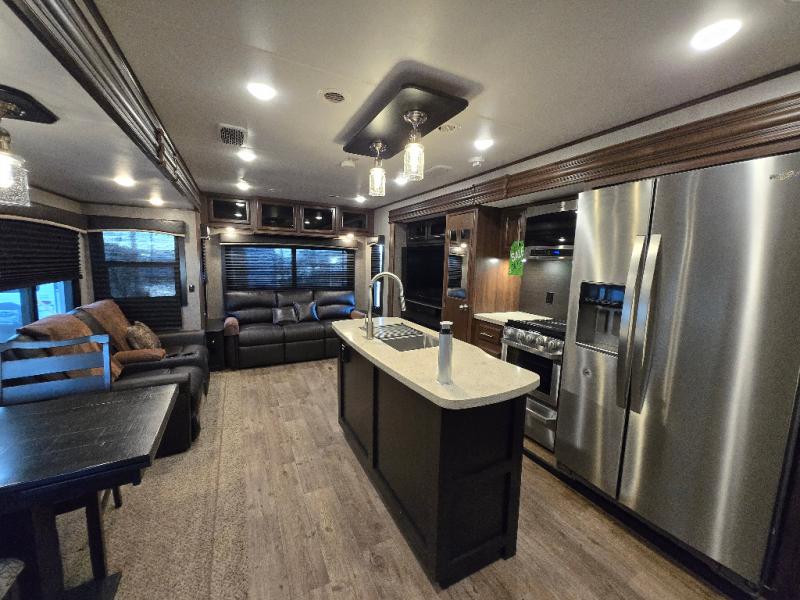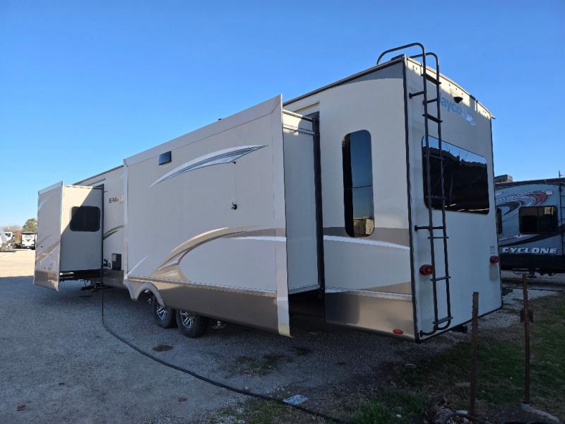 With any Eagle fifth wheel or travel trailer by Jayco you will appreciate durable construction materials, like the Magnum Tuff Roof and the Stonghold VBL laminated walls. The JAYCOMMAND Smart RV system puts you in control of your RV's function, and the 4 Star Handling Package will provide smooth towing from home to camp. Each model features Climate Shield zero-degree tested weather protection and the industry-exclusive HELIX cooling system that features two 15,000 BTU Whisper Quiet A/C's to keep you comfortable year around. Some of the exterior conveniences you are sure to love are the fully enclosed, LED-lit universal docking station, the pass-through storage with Slam-Latch baggage doors, and the painted fiberglass front cap with built-in specialty LED lighting. The Eagle fifth wheels and travel trailers are designed to make you feel at home with solid hardwood slide fascia, residential vinyl flooring, bathroom tile backsplash, and plenty of storage for all your belongings.