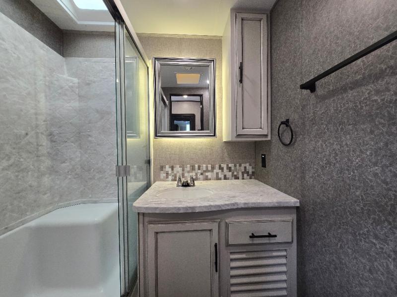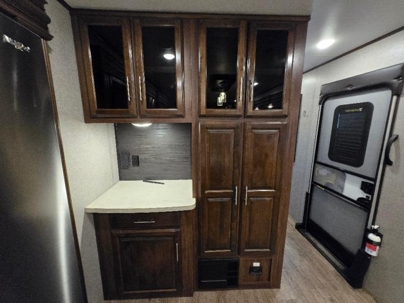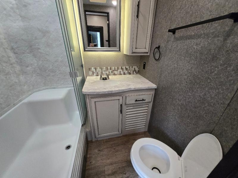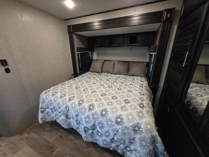 Plan to stay awhile in this cozy travel trailer than can sleep four each night. Once you arrive at your destination you can set up the two power awnings and unload your gear from the pass-through storage. You'll find comfortable seating spaces in the rear living area on the tri-fold sofa and the theatre seat, and the fireplace will make it feel more like home. You may want to set up a snack bar at the kitchen island and watch a movie on the 4K Ultra HD Smart TV, or you can play a game at the free-standing table with chairs. This model features a spacious bathroom with a large shower with a seat, plus a linen closet for your towels, and you'll feel right at home in the front bedroom with a queen bed and plenty of storage space for your clothes.