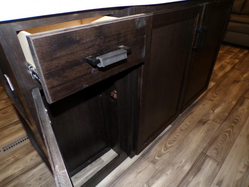 This fifth wheel with four slides is one your whole crew will love! There is a middle bunkhouse with a tri-fold sofa, a top bunk, and a desk, allowing this room to become an office if you need it. The loft above the bunkhouse will be a big hit with the little ones, and the full bath is centrally located so everyone can use it easily. You will have the front private bedroom all to yourselves with a queen bed slide out, a chest with an TV option, plus washer and dryer prep in the walk-in closet. The main living area includes everything you need to relax in comfort, like the theater seat, tri-fold sofa, and entertainment center with a fireplace. The chef will enjoy the extra counter space provided by the kitchen island, and there is plenty of storage with the walk-in pantry, the hutch, and the 21 cu. ft. residential refrigerator. This model even has an outside kitchen, two power awnings, and outside storage for all your gear!