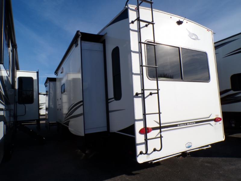 With any Eagle fifth wheel or travel trailer by Jayco you will appreciate durable construction materials, like the Magnum Tuff Roof and the Stonghold VBL laminated walls. The JAYCOMMAND Smart RV system puts you in control of your RV's function, and the 4 Star Handling Package will provide smooth towing from home to camp. Each model features Climate Shield zero-degree tested weather protection and the industry-exclusive HELIX cooling system that features two 15,000 BTU Whisper Quiet A/C's to keep you comfortable year around. Some of the exterior conveniences you are sure to love are the fully enclosed, LED-lit universal docking station, the pass-through storage with Slam-Latch baggage doors, and the painted fiberglass front cap with built-in specialty LED lighting. The Eagle fifth wheels and travel trailers are designed to make you feel at home with solid hardwood slide fascia, residential vinyl flooring, bathroom tile backsplash, and plenty of storage for all your belongings.