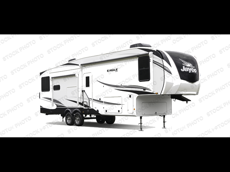 With any Eagle fifth wheel or travel trailer by Jayco you will appreciate durable construction materials, like the Magnum Tuff Roof and the Stonghold VBL laminated walls. The JAYCOMMAND Smart RV system puts you in control of your RV's function, and the 4 Star Handling Package will provide smooth towing from home to camp. Each model features Climate Shield zero-degree tested weather protection and the industry-exclusive HELIX cooling system that features two 15,000 BTU Whisper Quiet A/C's to keep you comfortable year around. Some of the exterior conveniences you are sure to love are the fully enclosed, LED-lit universal docking station, the pass-through storage with Slam-Latch baggage doors, and the painted fiberglass front cap with built-in specialty LED lighting. The Eagle fifth wheels and travel trailers are designed to make you feel at home with solid hardwood slide fascia, residential vinyl flooring, bathroom tile backsplash, and plenty of storage for all your belongings.