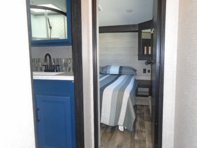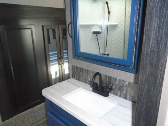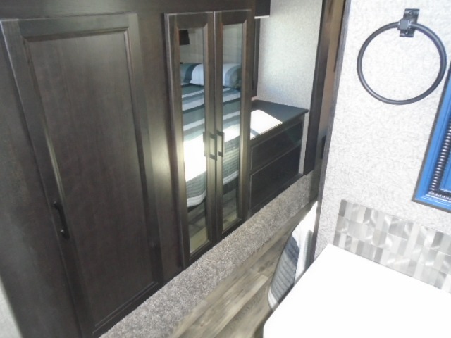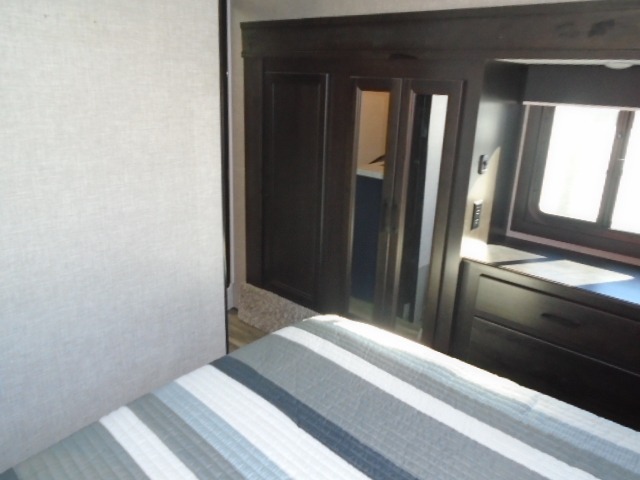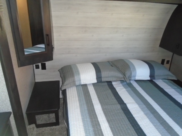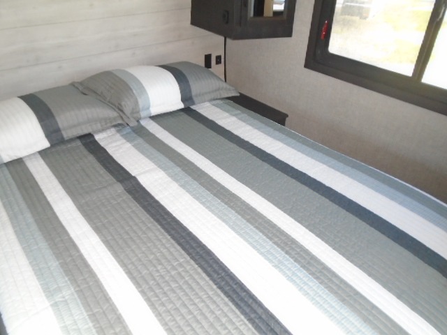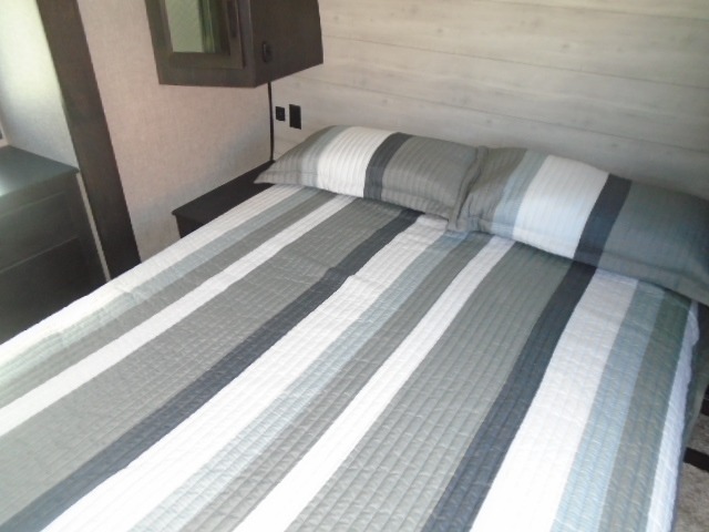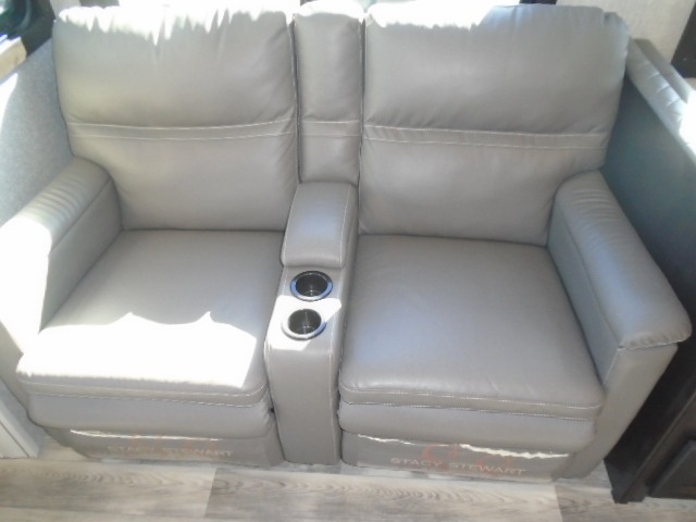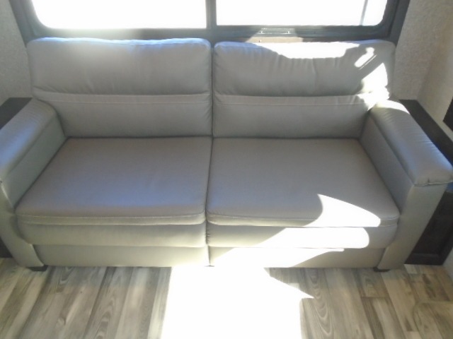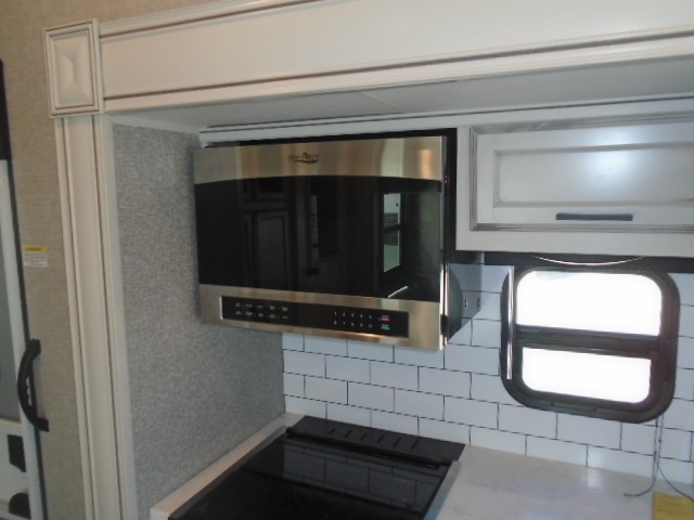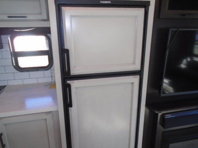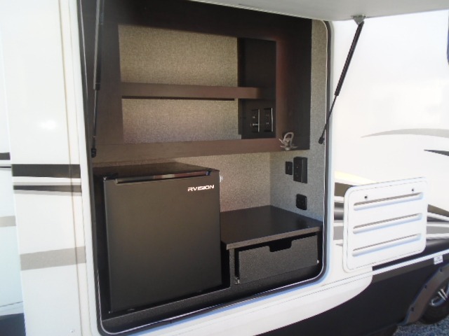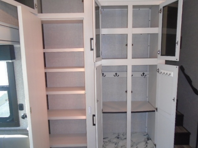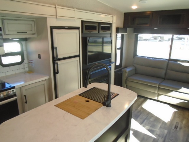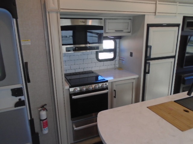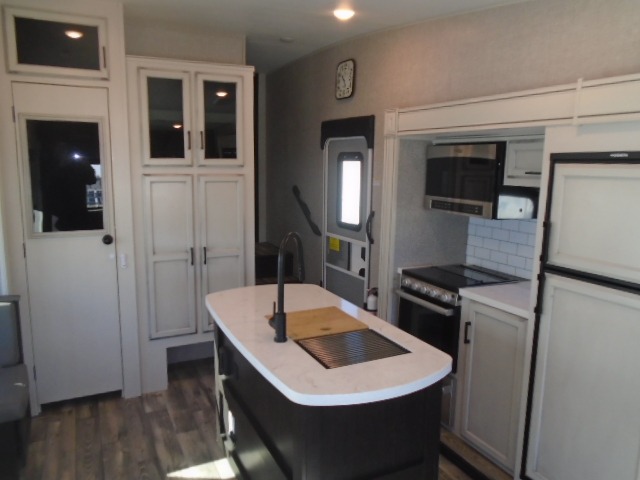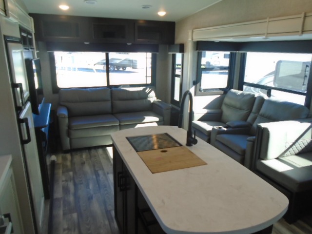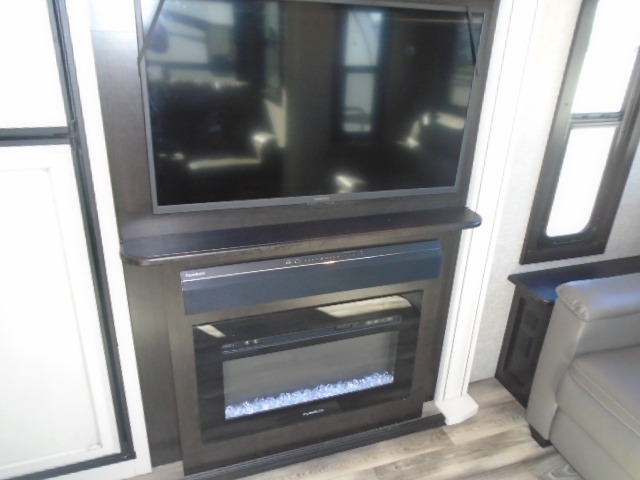 Don't pass up your chance to camp in true comfort with this fifth wheel! It features a rear living area with a tri-fold sofa for an afternoon nap and theater seating across from the entertainment center with a fireplace. The chef can choose to either prepare their meals indoors with the kitchen island and the three burner stainless steel range or at the outside kitchen with a refrigerator to enjoy a cold beverage while cooking. Hang your coats in the entry wardrobe and store your canned goods in the kitchen pantry. The dual entry bathroom has a radius shower to clean up in and is easy to access, especially those staying in the front private bedroom. The bedroom also has a wardrobe slide with a dresser and linen closet, as well as wardrobes on either side of the queen bed!