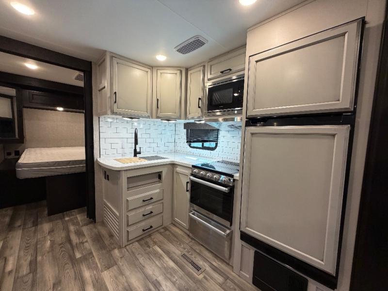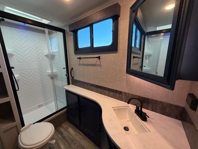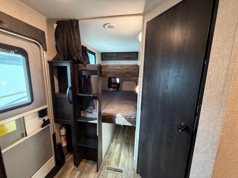 There's a lot to love about this travel trailer! From the set of 48" x 80" bunk beds with storage in the steps to the walk-in pantry behind the swing-out entertainment center with a fireplace for a cozy evening indoors. Everyone can freshen up in the rear corner bathroom with the shower, keep their towel close by with the linen closet, and have plenty of countertop space to get ready in the mornings. The tri-fold sofa and U-shaped dinette slide offer comfortable places to sit, dine, and play games, as well as transform into extra sleeping spaces. The front private bedroom has a queen bed with wardrobes on either side and another wardrobe to keep your clothes looking their best. You even have an outside kitchen to cook your meals at while watching others play a game of cornhole!