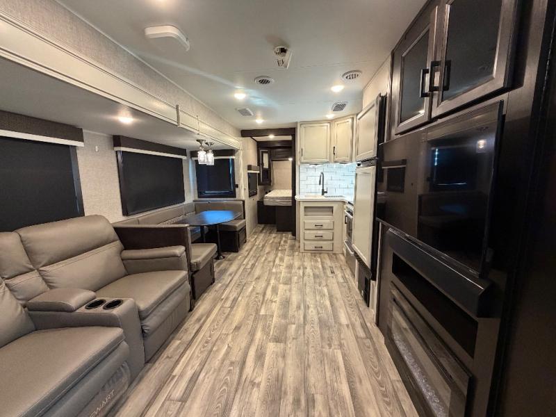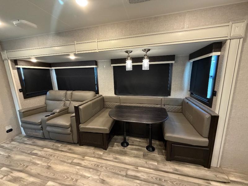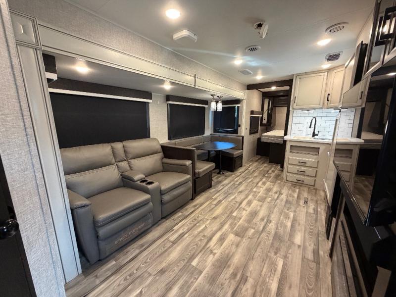 Experience a comfortable tow with every one of these Jayco Eagle HT fifth wheels and travel trailers! They are built with a Stronghold VBL aluminum frame, vacuum bond laminated gel-coated fiberglass exterior walls, and a Magnum Truss roof system with a one piece, seamless DiFlex II material that has been tested as the strongest roof in the industry. The HELIX cooling system comes with an exterior mounted 15,000 BTU "Whisper Quiet" A/C unit, Jayco exclusive insulated dual duct design, directional and closeable A/C vents, and larger air vents with user accessible filters so you can stay cool even on the hottest summer day. With a mandatory Luxury package, you will get handy features like the JAYCOMMAND smart RV system to control your unit at the touch of a finger, an electric auto-leveling so you can set up quick and easy, and blackout roller shades for added privacy. Come find the right one for you today!