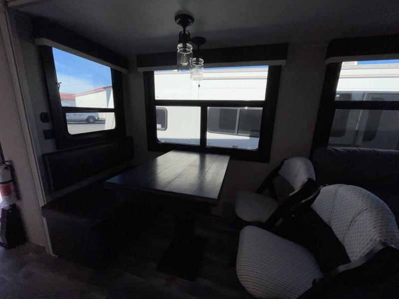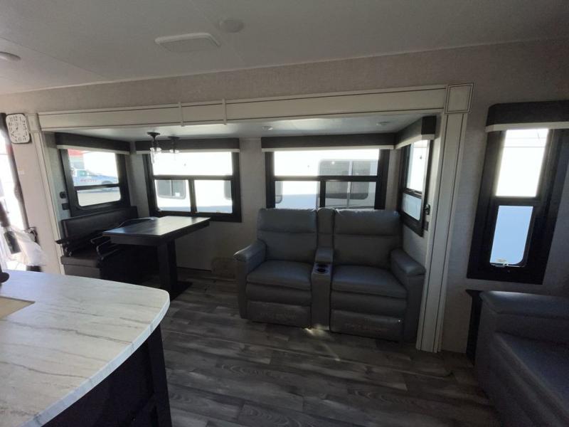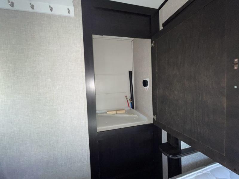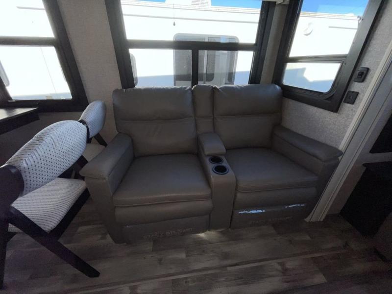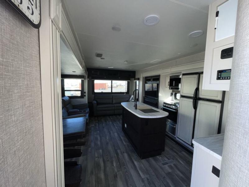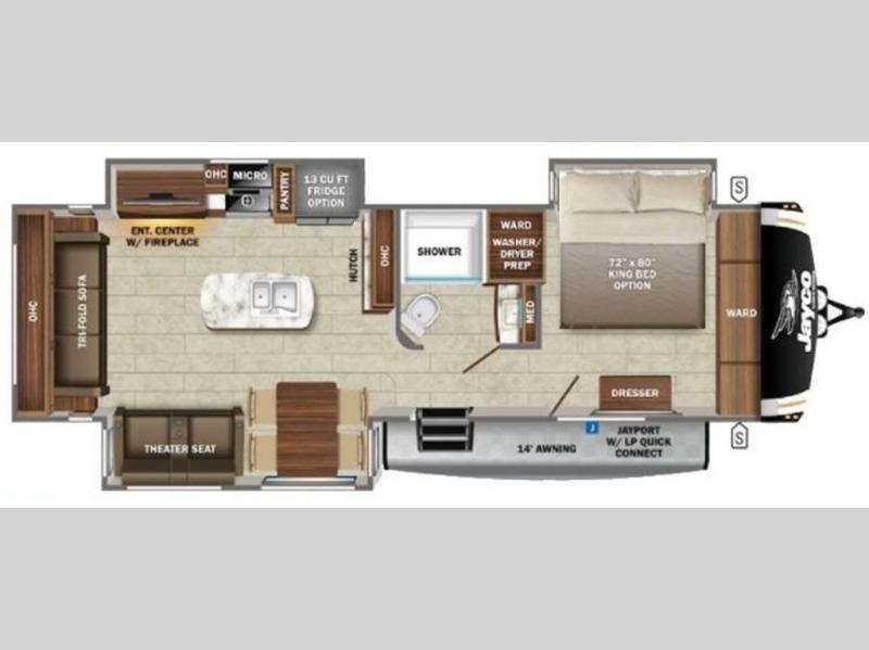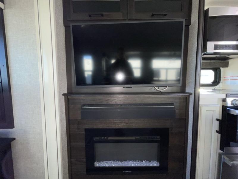 You will feel right at home camping in this travel trailer! It features a front private bedroom with a queen bed slide for more walking around space, a dresser, a front wardrobe to hang your clothes, and a wardrobe that is prepped to add an optional washer and dryer. Start each morning getting squeaky clean in the full bathroom with the shower and then head to the kitchen to fry up some eggs on the three burner stainless steel range. The kitchen island will help make meal prepping easier too, plus there is a hutch to store your dishes. Enjoy a relaxing evening by the fireplace and watch your favorite movie with the entertainment center while sitting on either the rear tri-fold sofa or the theater seating!