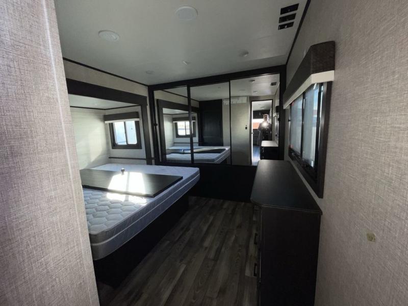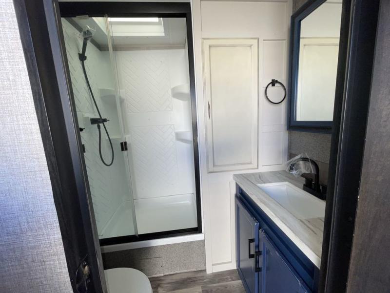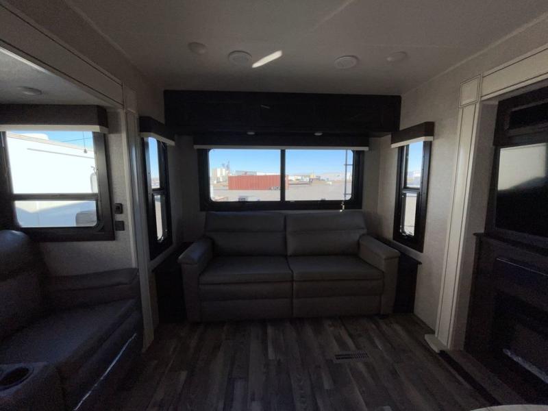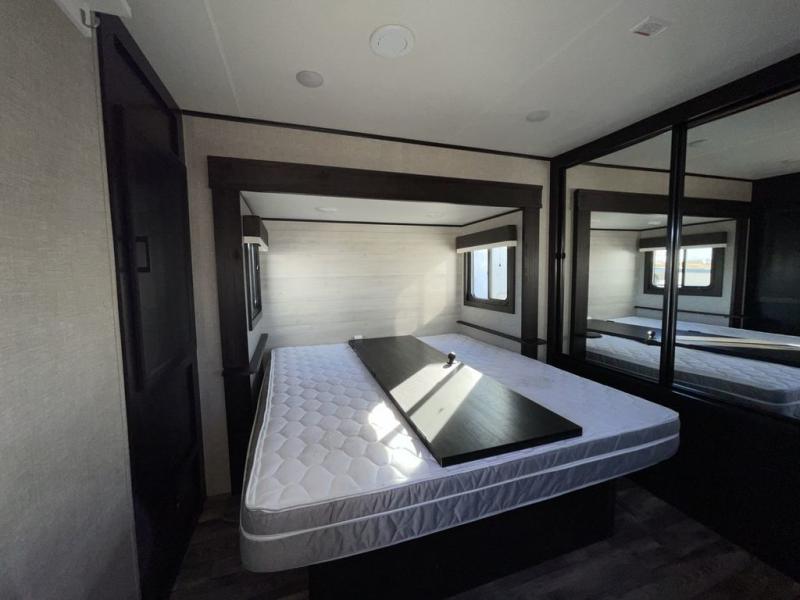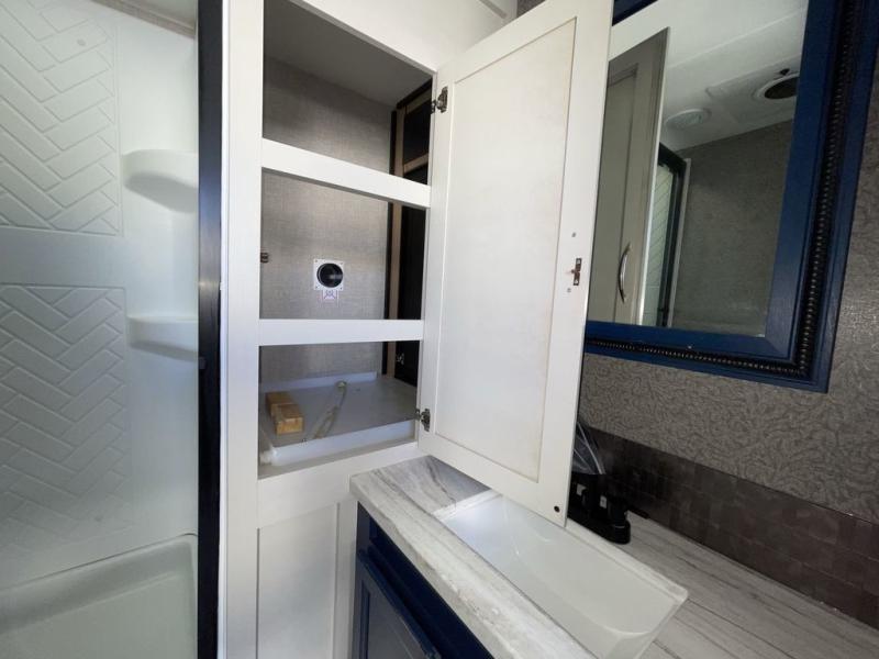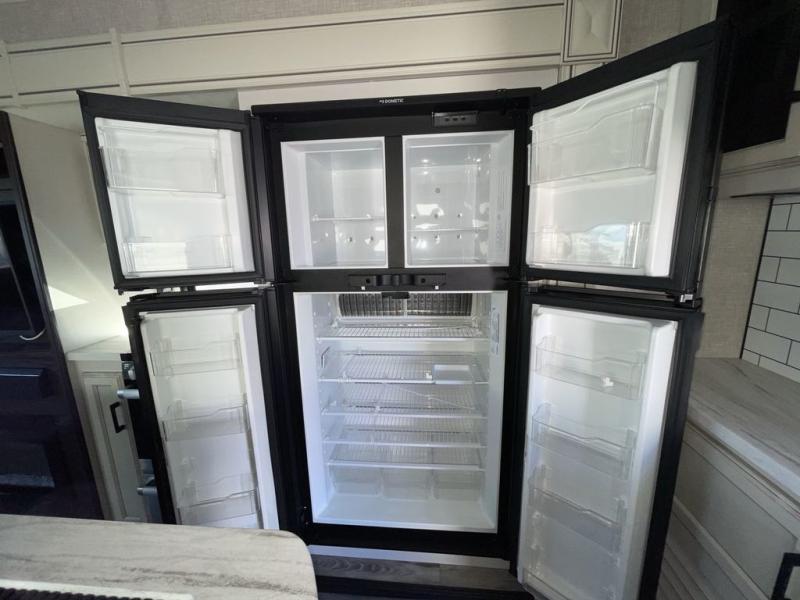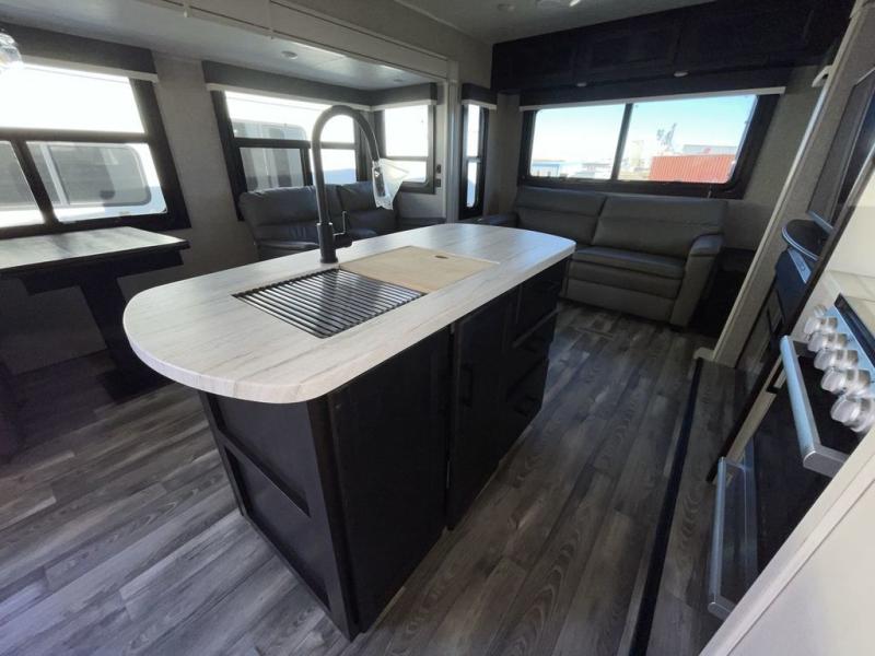 You will feel right at home camping in this travel trailer! It features a front private bedroom with a queen bed slide for more walking around space, a dresser, a front wardrobe to hang your clothes, and a wardrobe that is prepped to add an optional washer and dryer. Start each morning getting squeaky clean in the full bathroom with the shower and then head to the kitchen to fry up some eggs on the three burner stainless steel range. The kitchen island will help make meal prepping easier too, plus there is a hutch to store your dishes. Enjoy a relaxing evening by the fireplace and watch your favorite movie with the entertainment center while sitting on either the rear tri-fold sofa or the theater seating!
