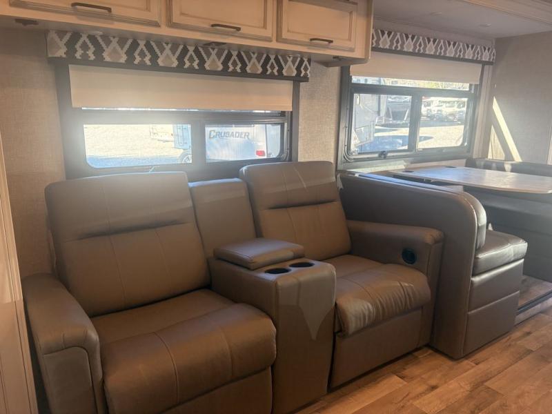 Pack your bags and head to your favorite camping spot in this spacious motorhome for six to seven. The little ones will love the cab-over bunk, and you'll have your own private bedroom in the back. There is also a tri-fold sofa and a booth dinette that will serve as seating and sleeping space as well. This model will feel more like home with its fireplace, entertainment center with a 50" TV, and spacious spacious living area. There is also a private toilet and shower, with the sink across the hall for convenience.