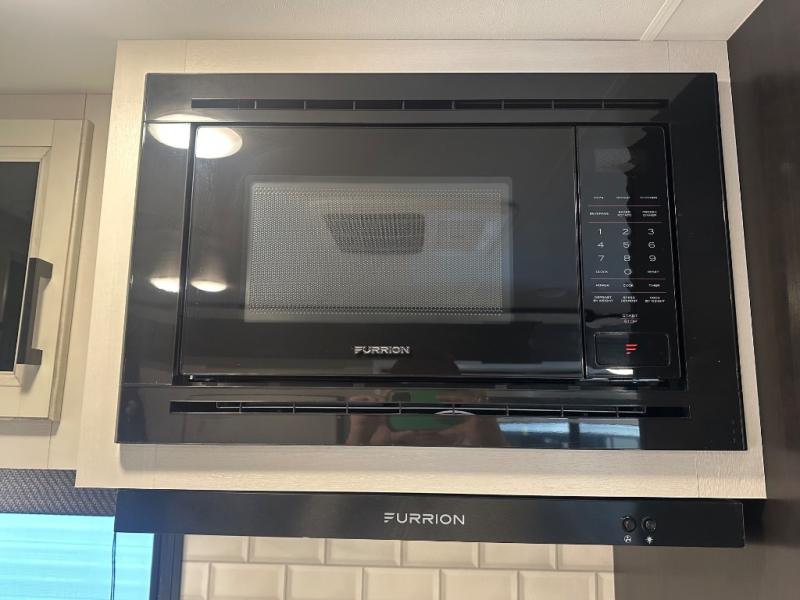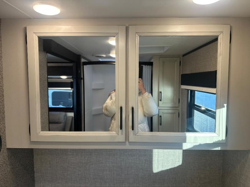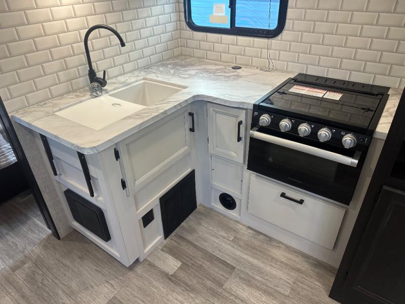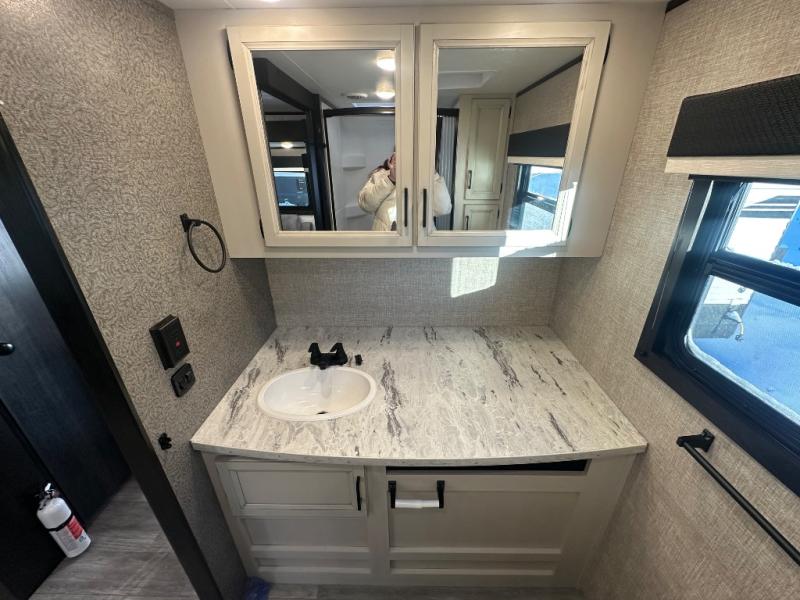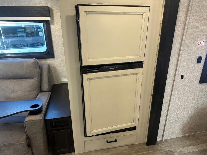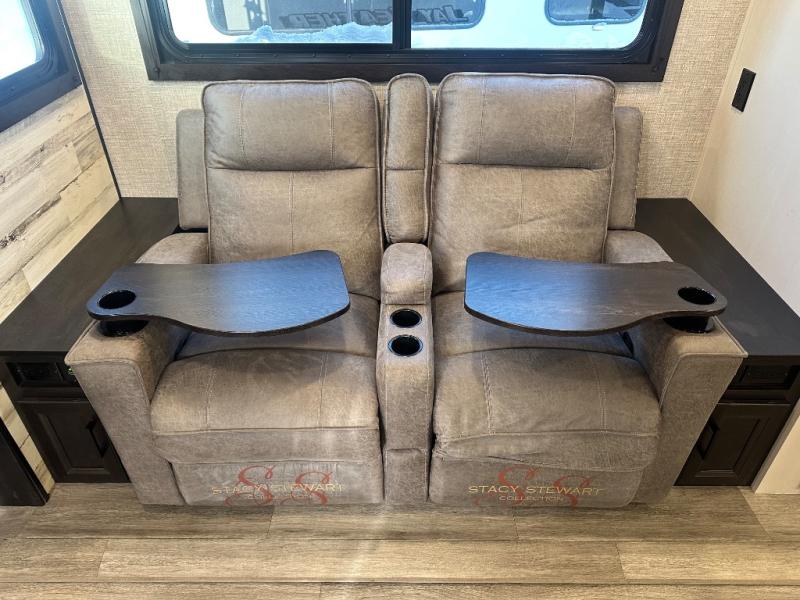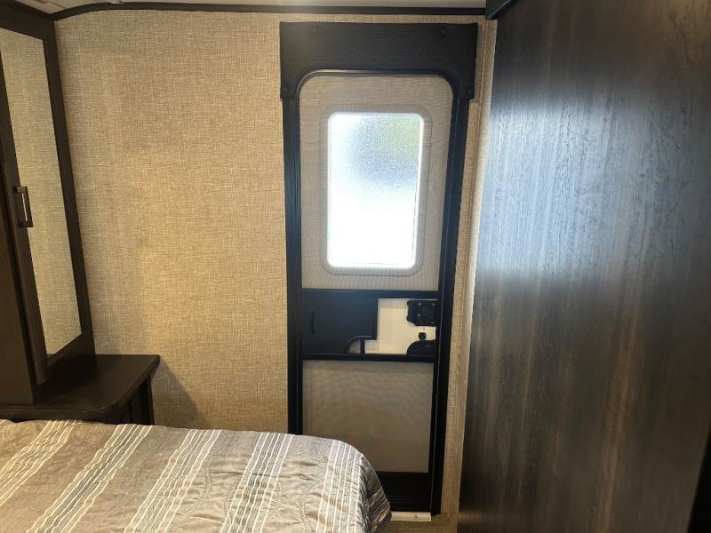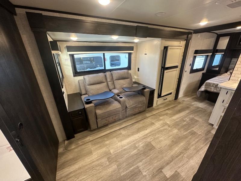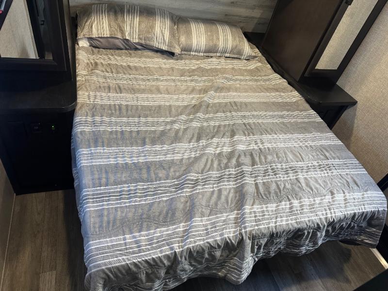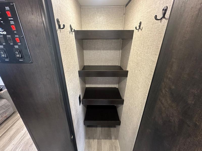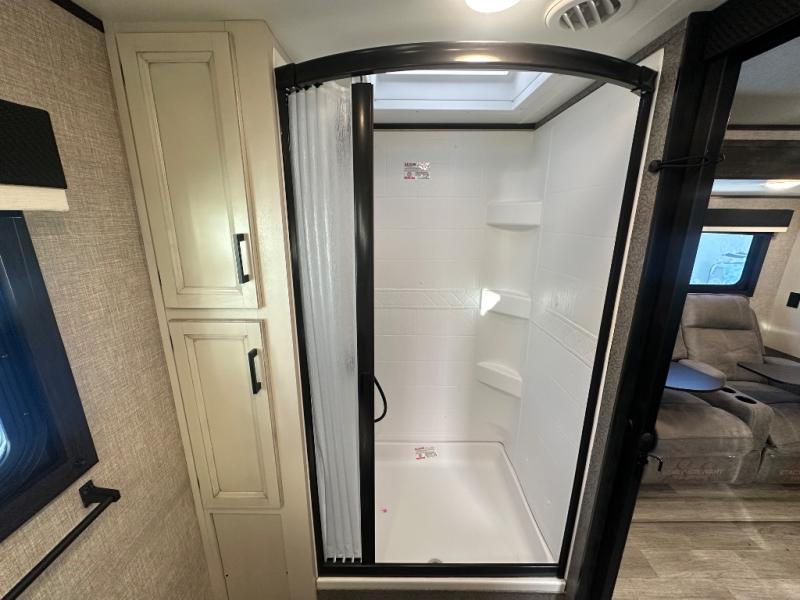 Whether you are a couple or a larger group, this trailer offers a spacious main living and kitchen area as well as rear bathroom for privacy. You will also find linen storage and ample counter space for toiletries. The space savings door even gives you more floor space in both the bathroom and the main area. The single slide holds the U-shaped dinette and refrigerator for even more floor space, the L-shaped kitchen area allows the cook their own space to make meals, and the walk-in pantry is perfect for extra goodies on those longer camping trips. The front bedroom provides privacy as well with its own space savings door, and you can sleep like a queen at night. You can choose a few options if you like such as an L-lounge or theater seats in place of the dinette, the Solar Power package, 120V heated tanks pads, and/or an 8 cu. ft. 12V refrigerator.