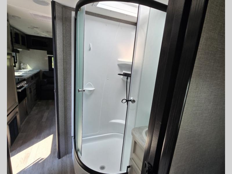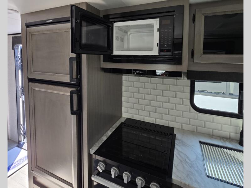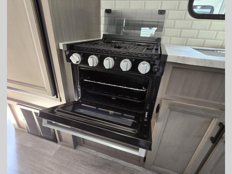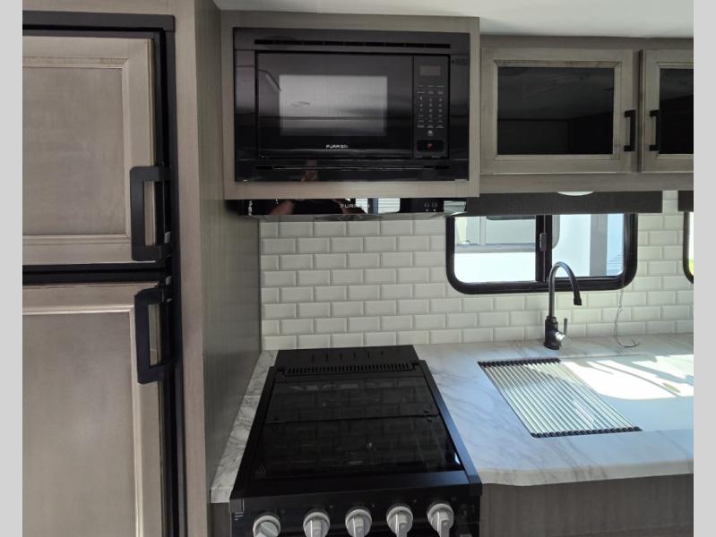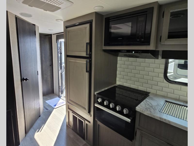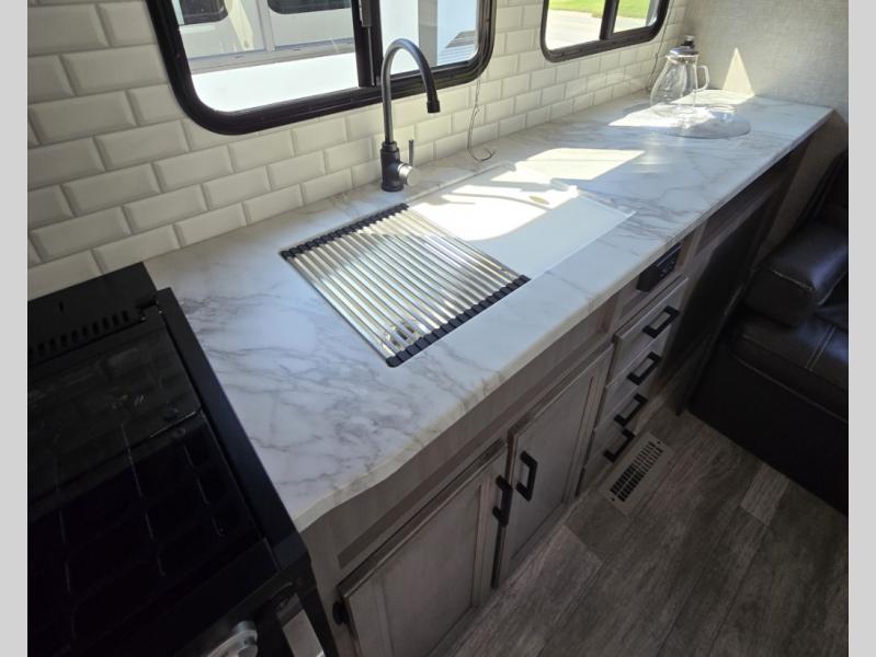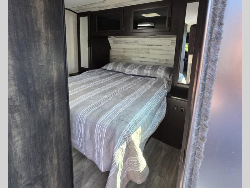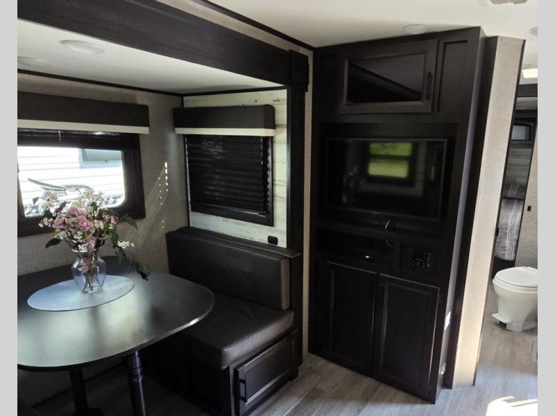 Camp at a local state park or travel to see new places with this trailer that can sleep four when you utilize the furniture as sleeping space. Two can sleep in the front bedroom on a queen bed with dual wardrobes and includes access to the double entry bathroom, while two others sleep on the booth dinette slide out, and the rear jackknife sofa. There is an LED TV in the main area to watch while everyone plans their activities or while the cook makes meals using full amenities. There is an outside fridge to store more cold items which is super handy when you are relaxing outside under the 20' power awning. You might even like to add a few options, take a look at the list.