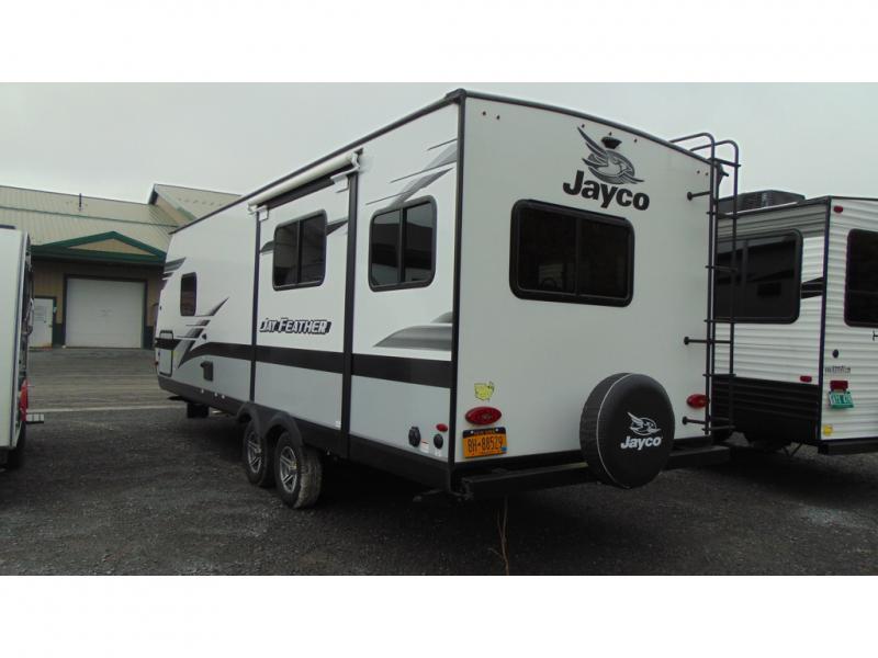 With any Jay Feather travel trailer by Jayco, you will experience an easy-to-tow, lightweight dual axle RV that is built on an American-made frame with an aerodynamic, rounded front profile with a diamond plate to protect against road debris, and includes Azdel composite in the perimeter walls, and Stronghold VBL vacuum-bonded, laminated floor and walls, plus the Magnum Truss roof system. Also included are features in the Customer Value package, and the Sport package which offers aluminum tread entry steps, roof-mount solar prep, an LED TV, and the Glacier package which includes an enclosed underbelly. The interior provides residential-style kitchen countertops with a decorative backsplash, residential plank-style vinyl flooring for easy care, a decorative wallboard for style, and ball-bearing drawer guides with 75 lb. capacity to mention a few of the amenities. Choose your favorite today!