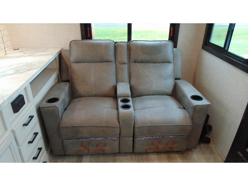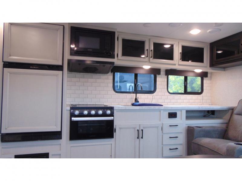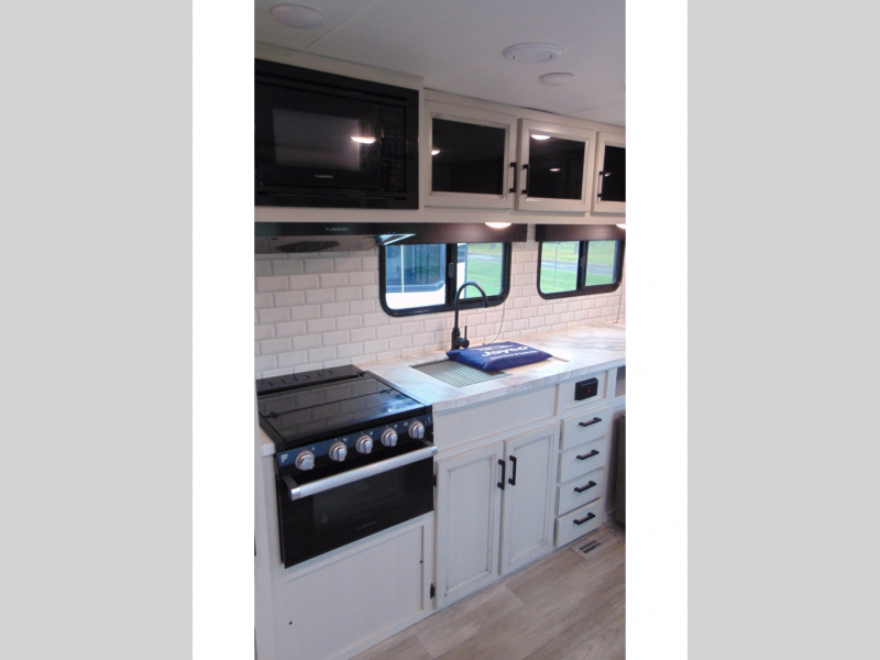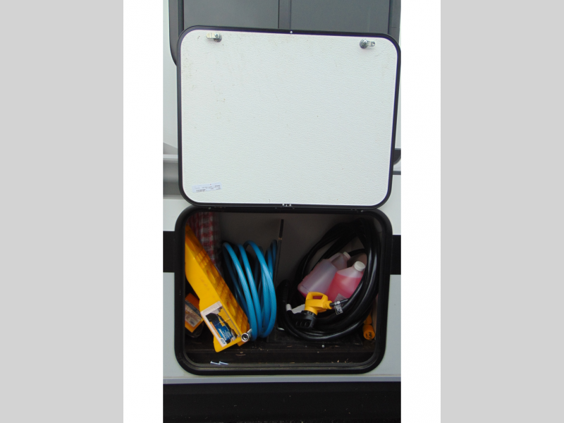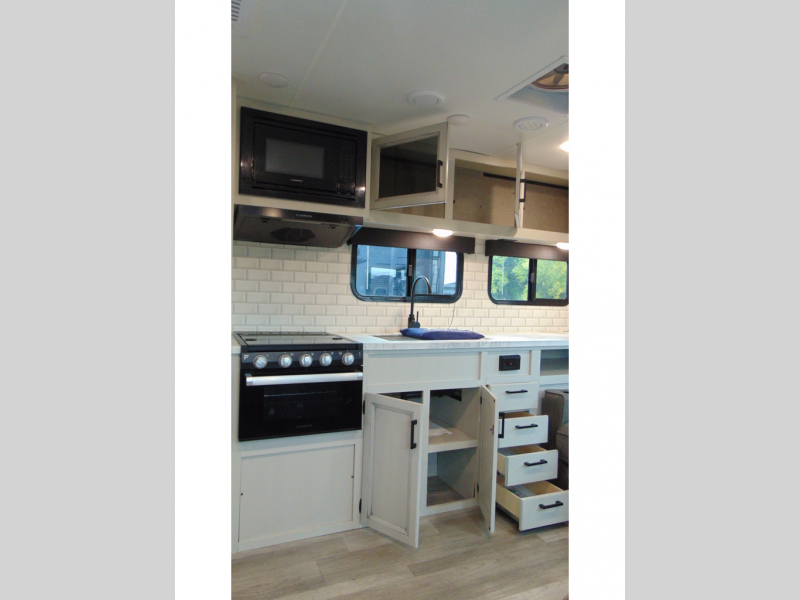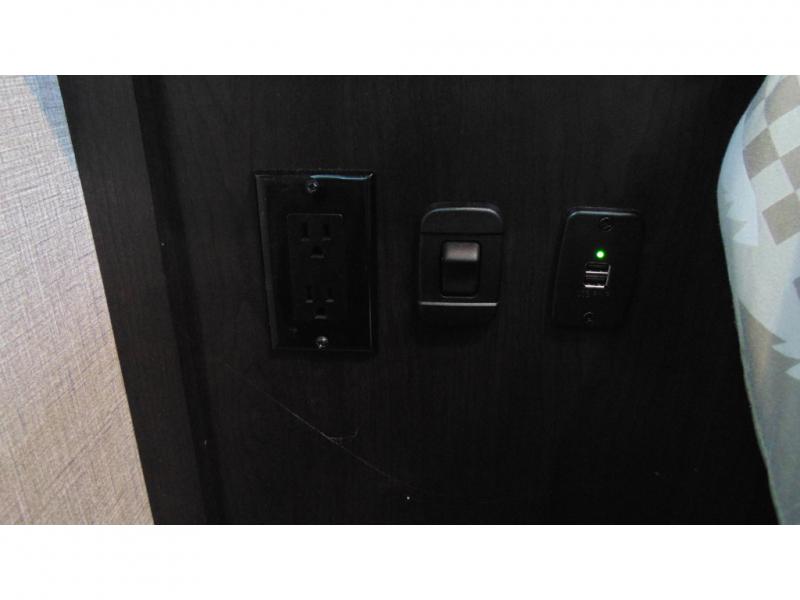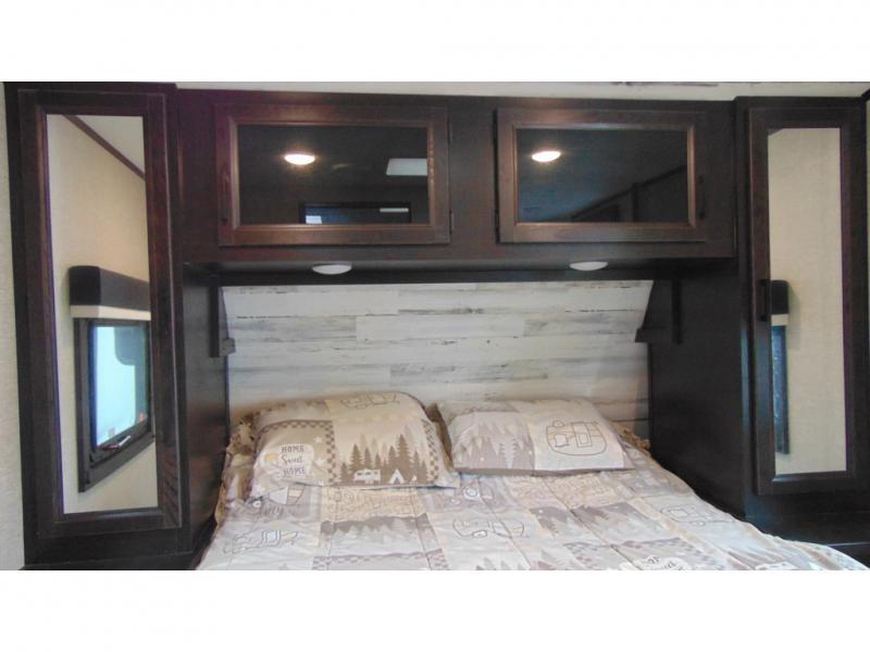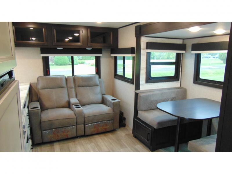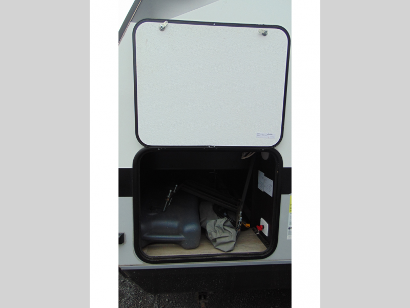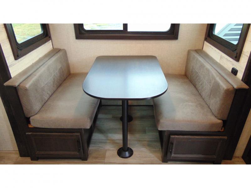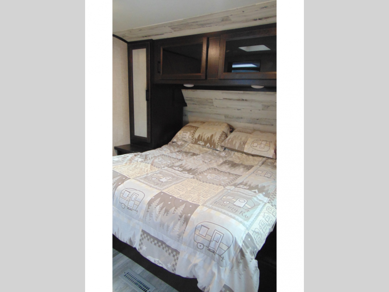 Camp at a local state park or travel to see new places with this trailer that can sleep four when you utilize the furniture as sleeping space. Two can sleep in the front bedroom on a queen bed with dual wardrobes and includes access to the double entry bathroom, while two others sleep on the booth dinette slide out, and the rear jackknife sofa. There is an LED TV in the main area to watch while everyone plans their activities or while the cook makes meals using full amenities. There is an outside fridge to store more cold items which is super handy when you are relaxing outside under the 20' power awning. You might even like to add a few options, take a look at the list.